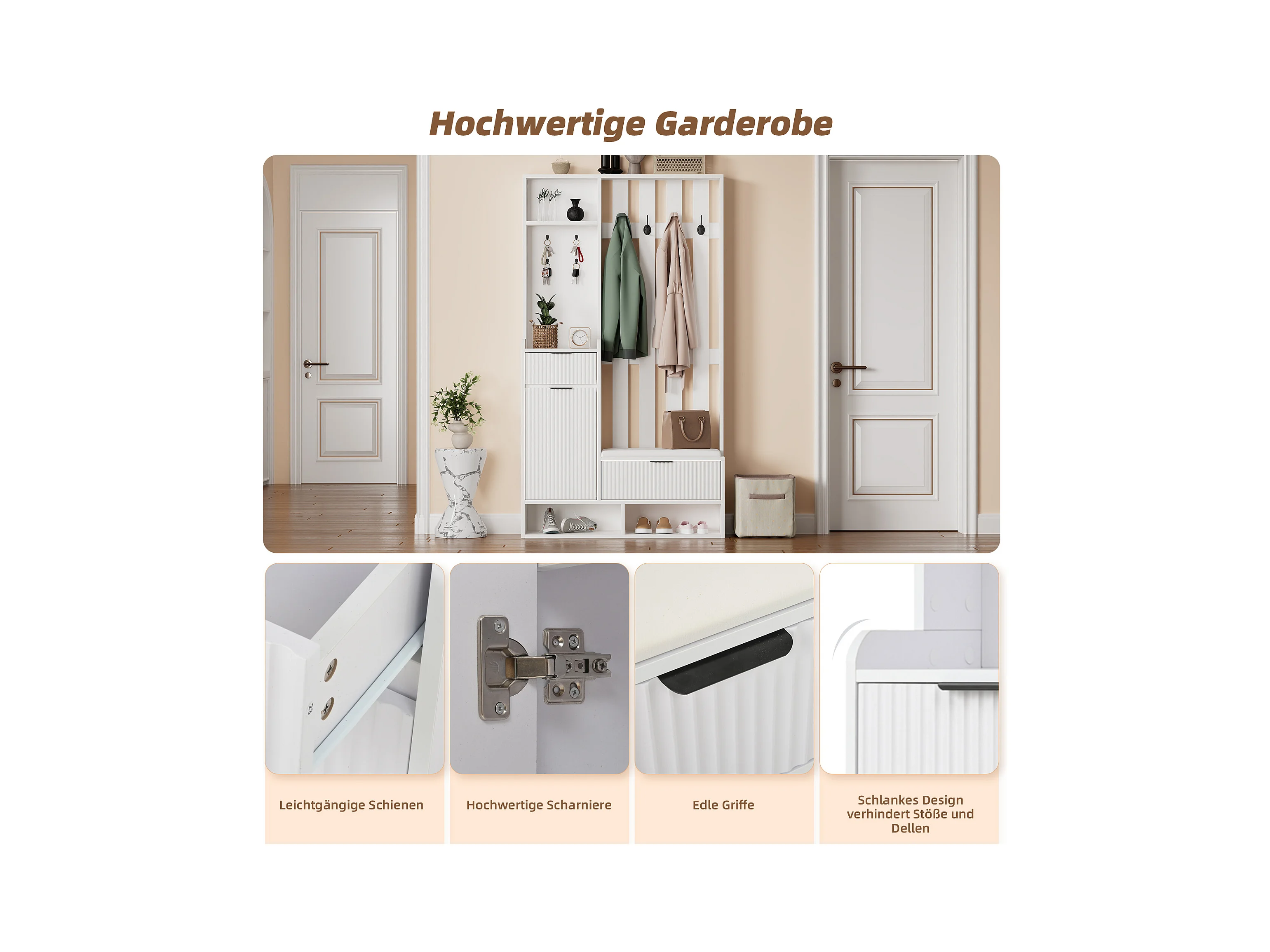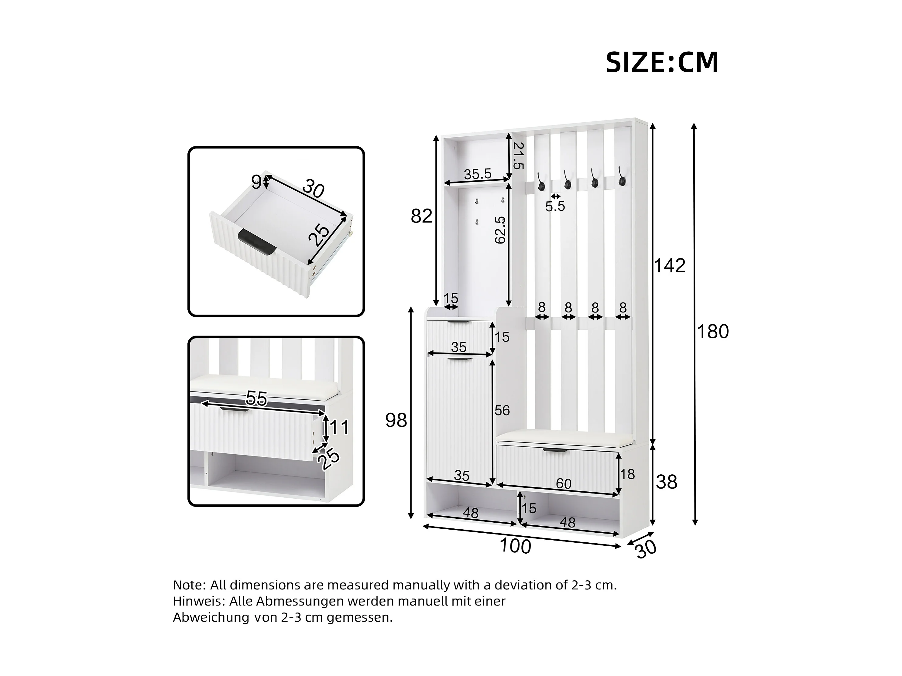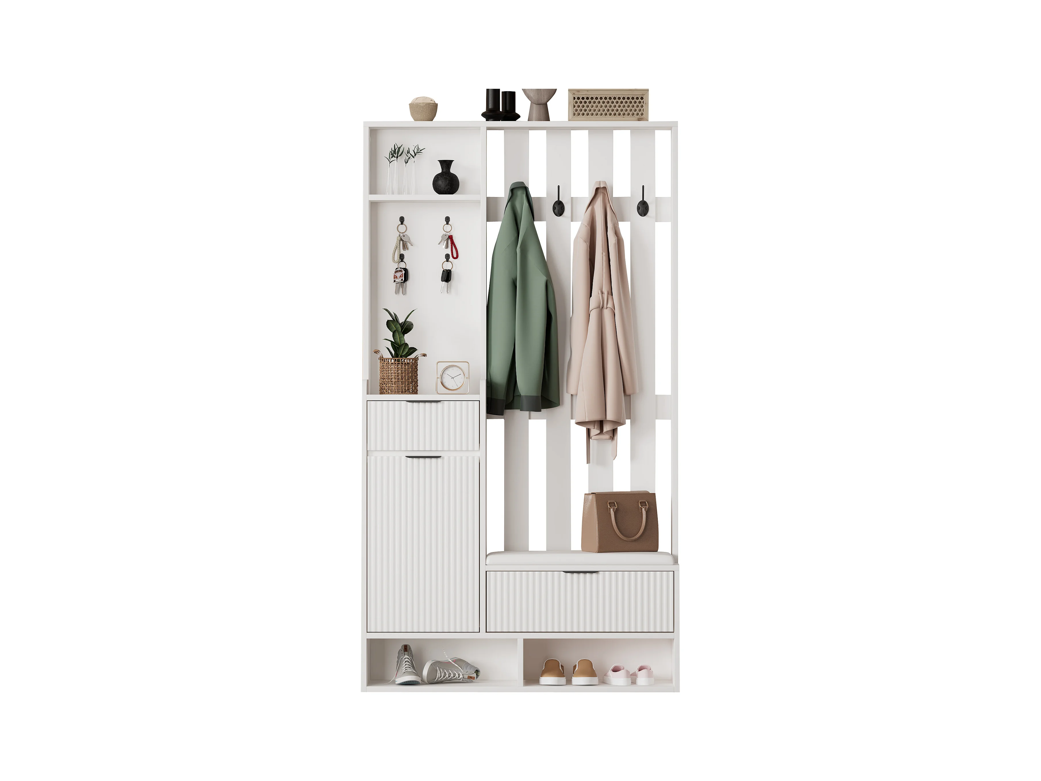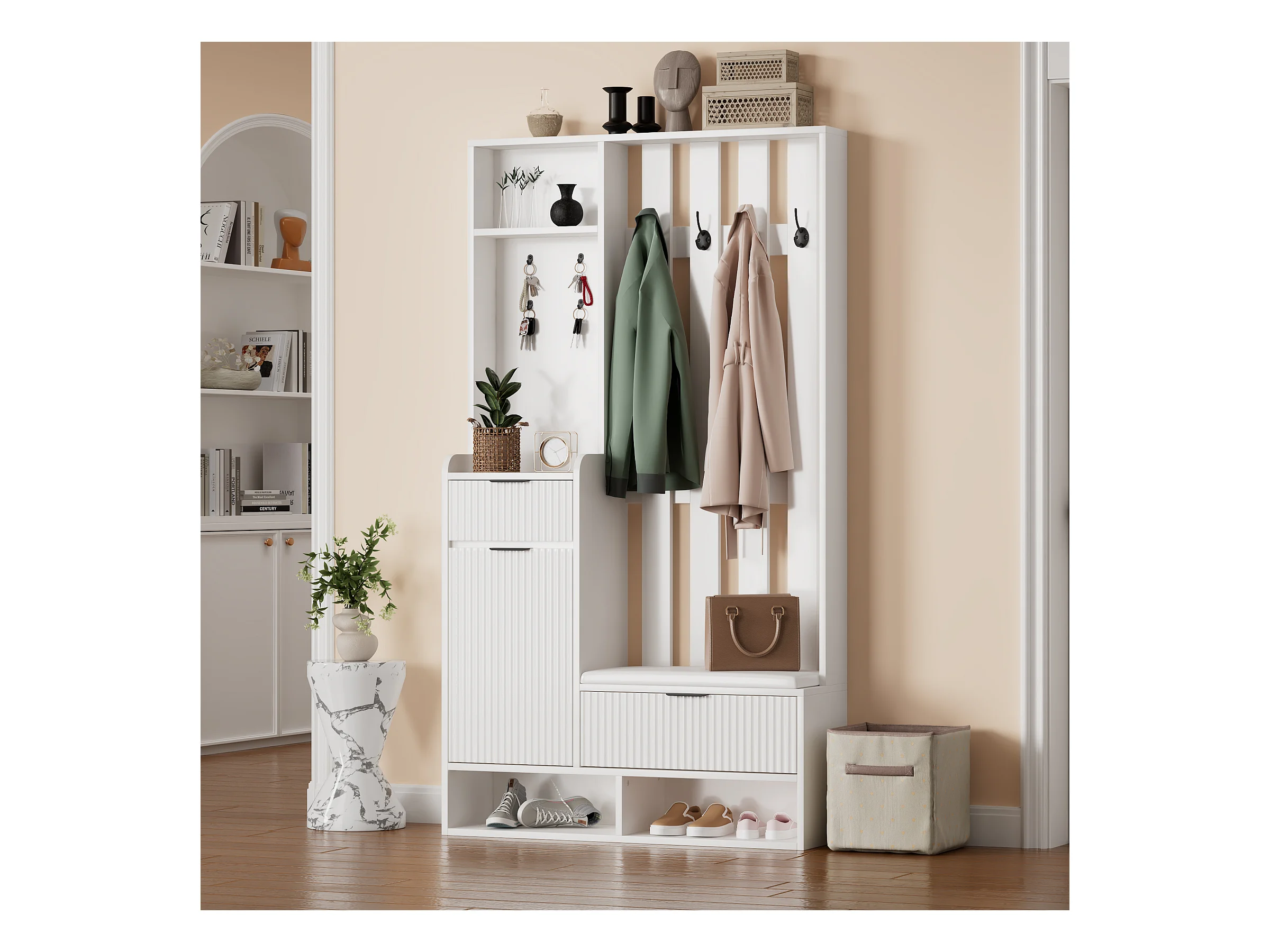 Wieszak 6 w 1 - 100 x 30 x 180 cm - z 8 haczykami + ławka na buty + szuflady - płyta wiórowa - biały