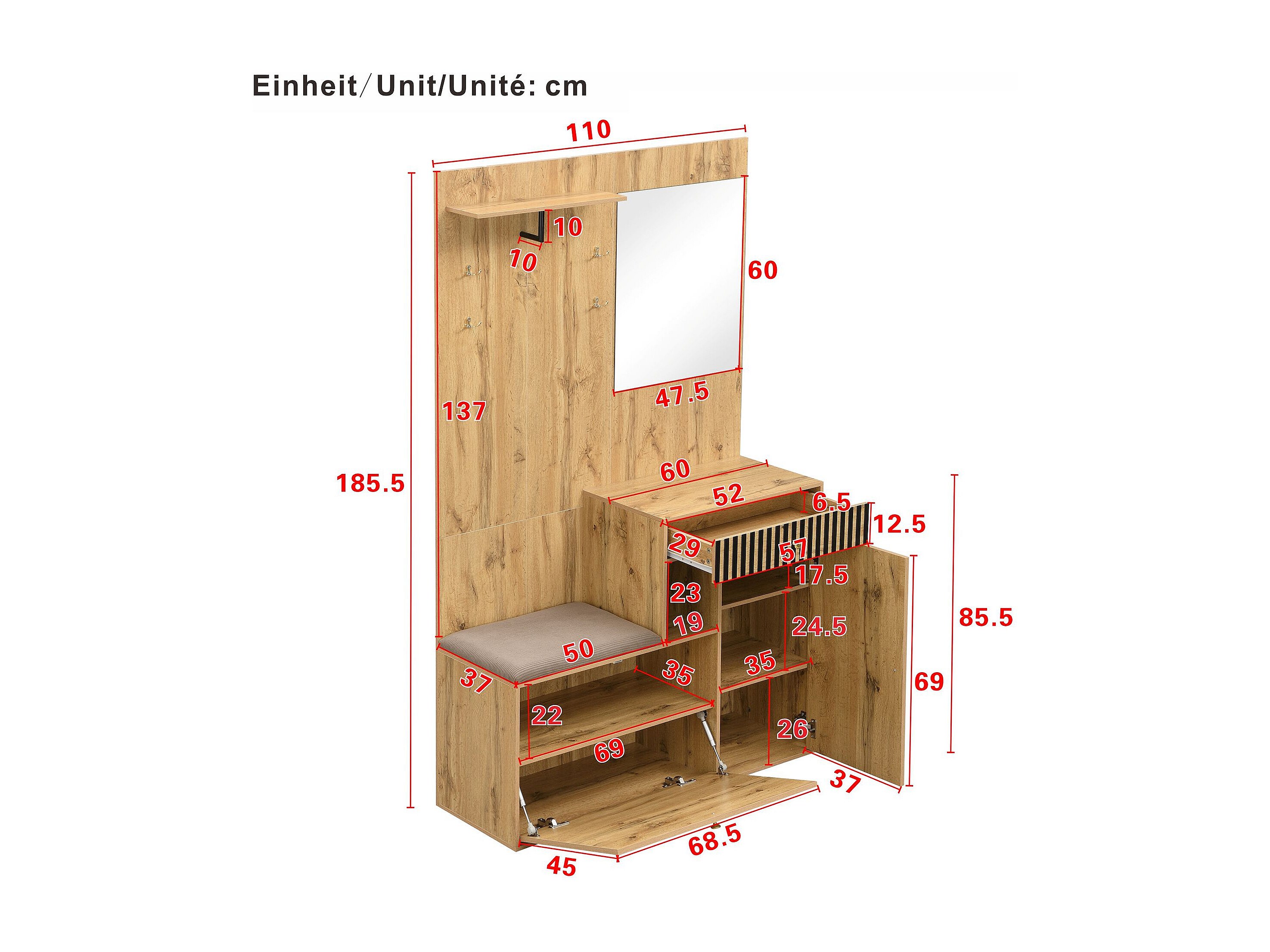 Wieszak na ubrania do przedpokoju z ławką na buty i lustrem, miejsce do przechowywania - Naturalny