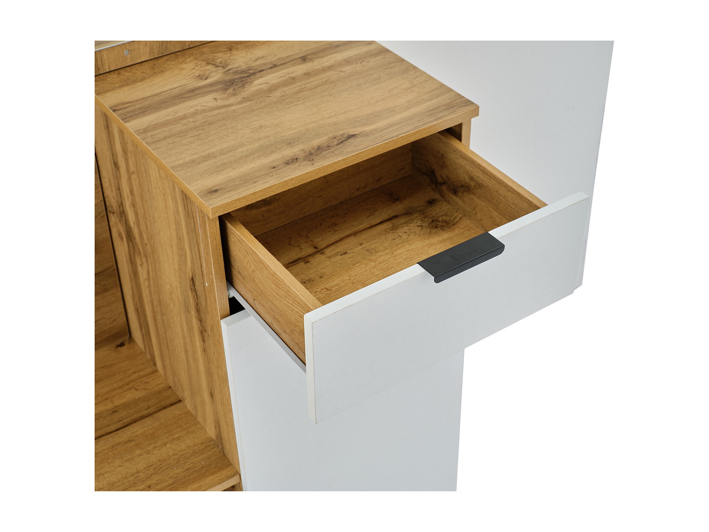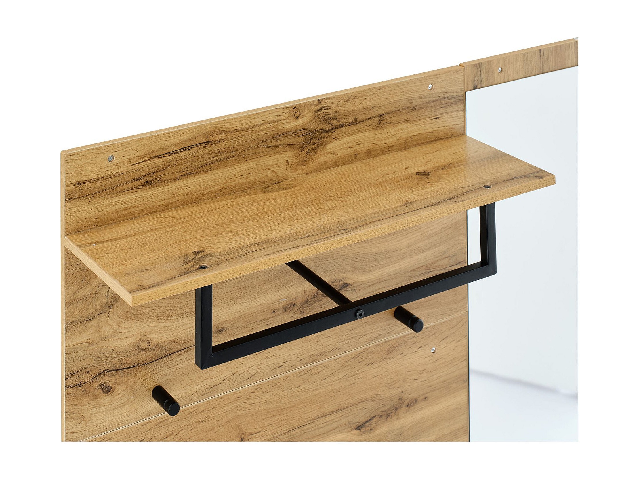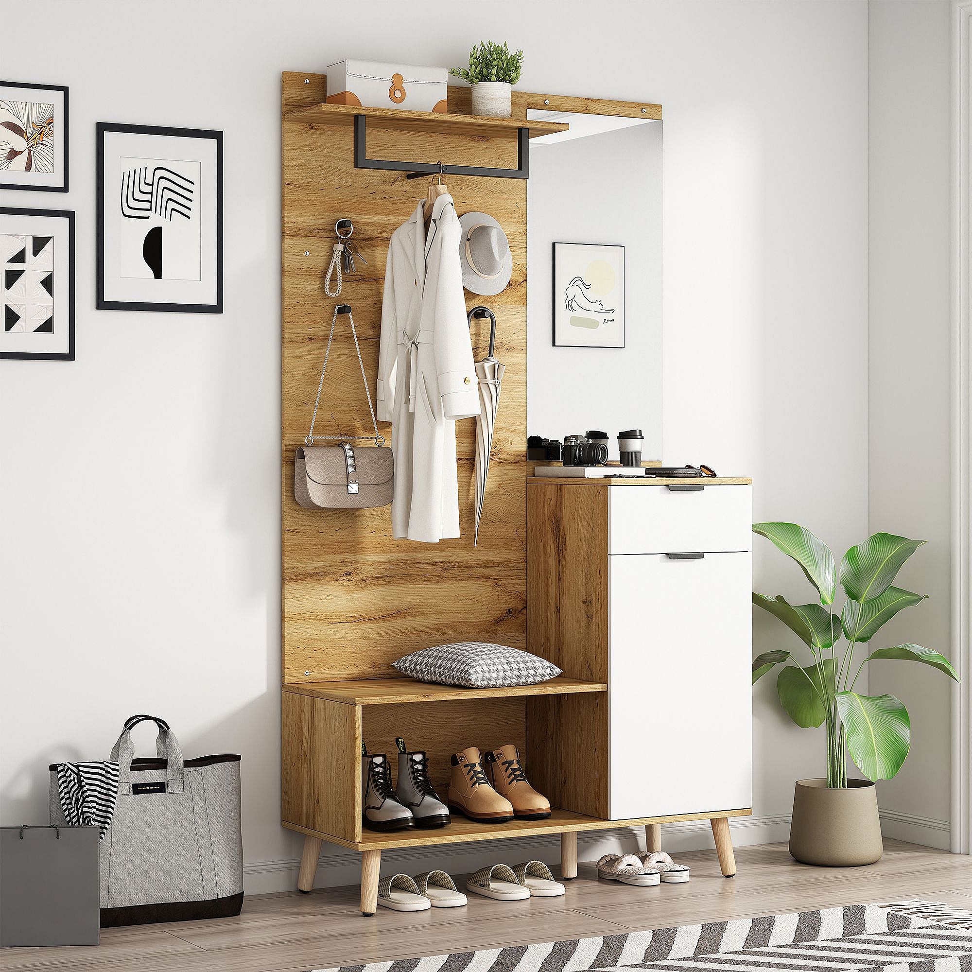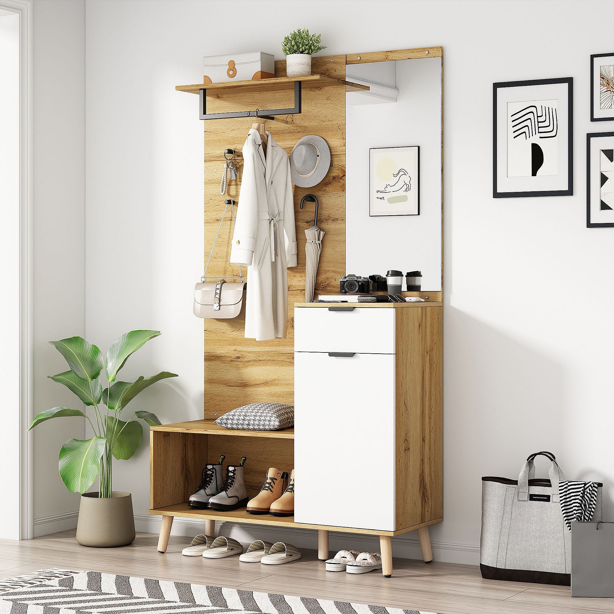Wieszak na ubrania do przedpokoju z lustrem, 1 drzwiami i 1 szufladą - naturalny i biały