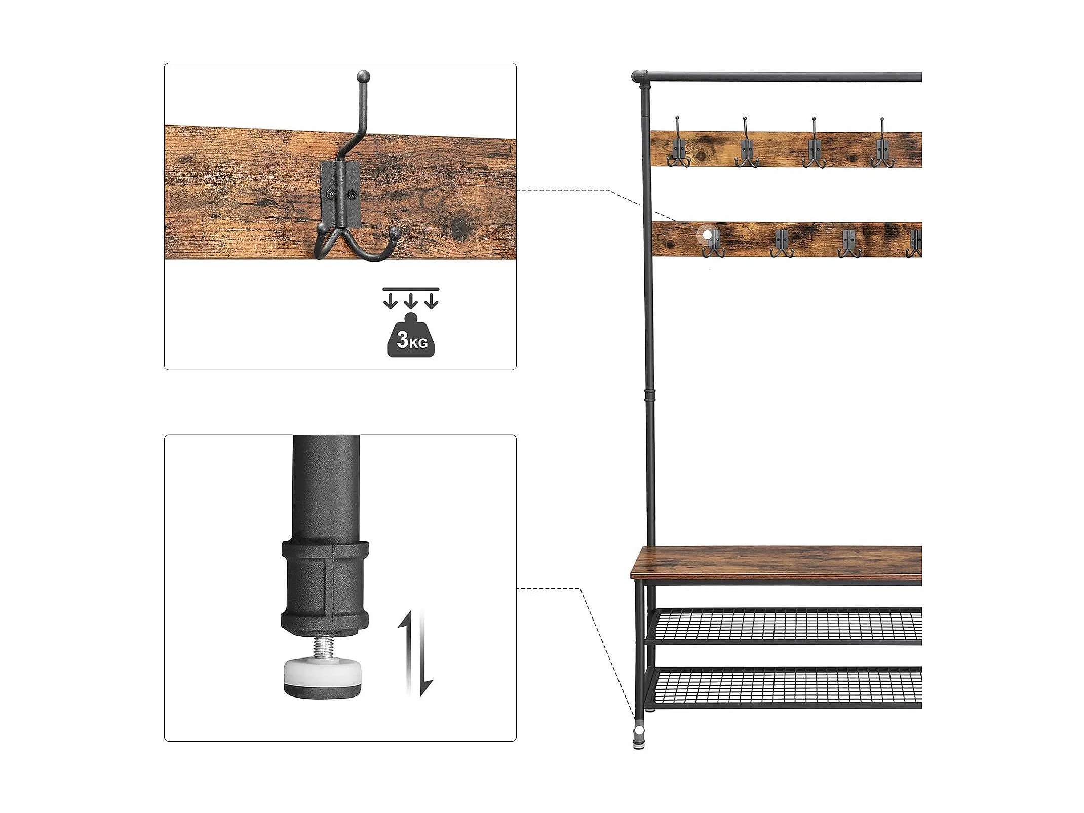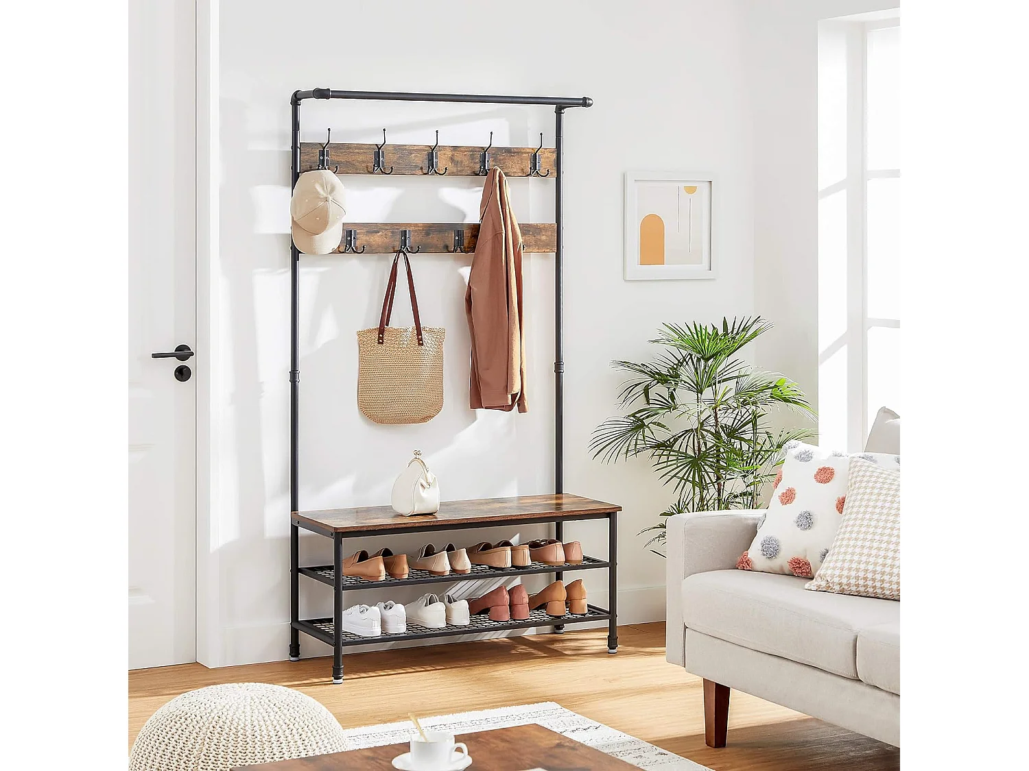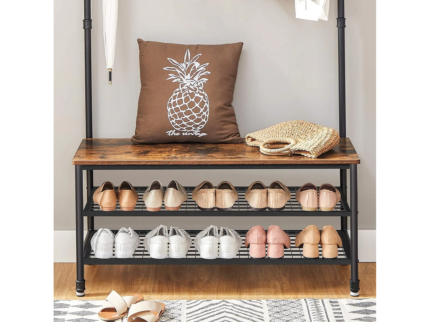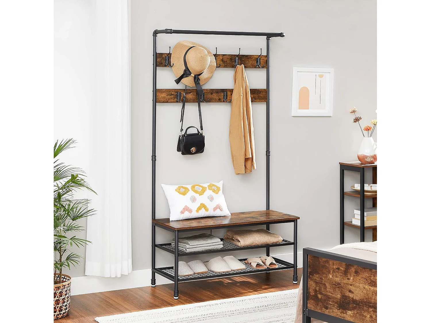 Wieszak na ubrania Valora z siedziskiem i 2 półkami na buty, rustykalny brąz