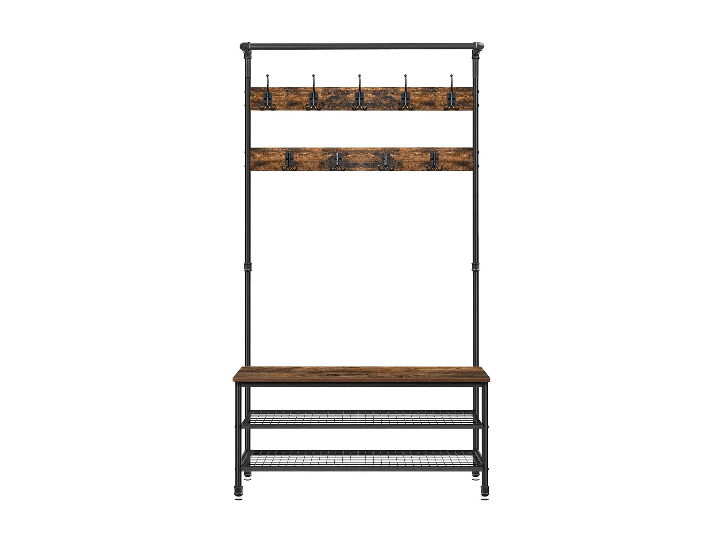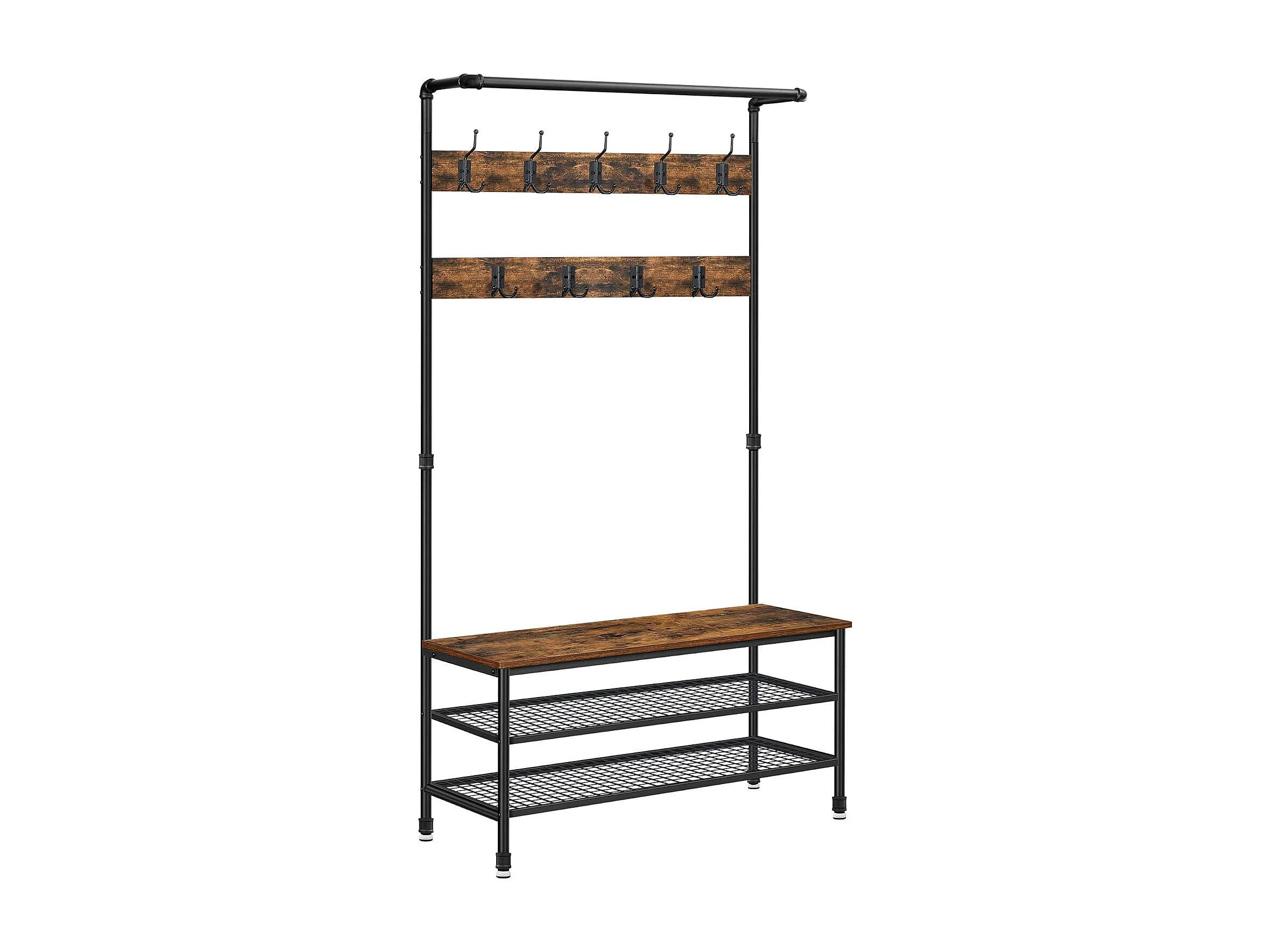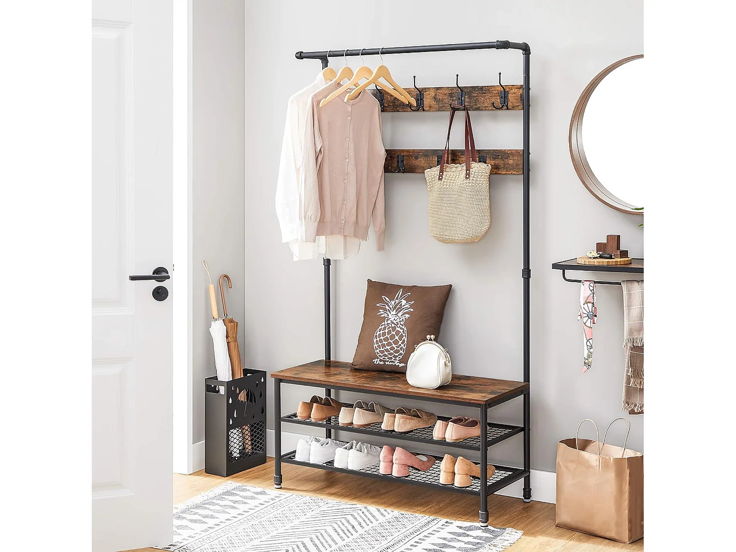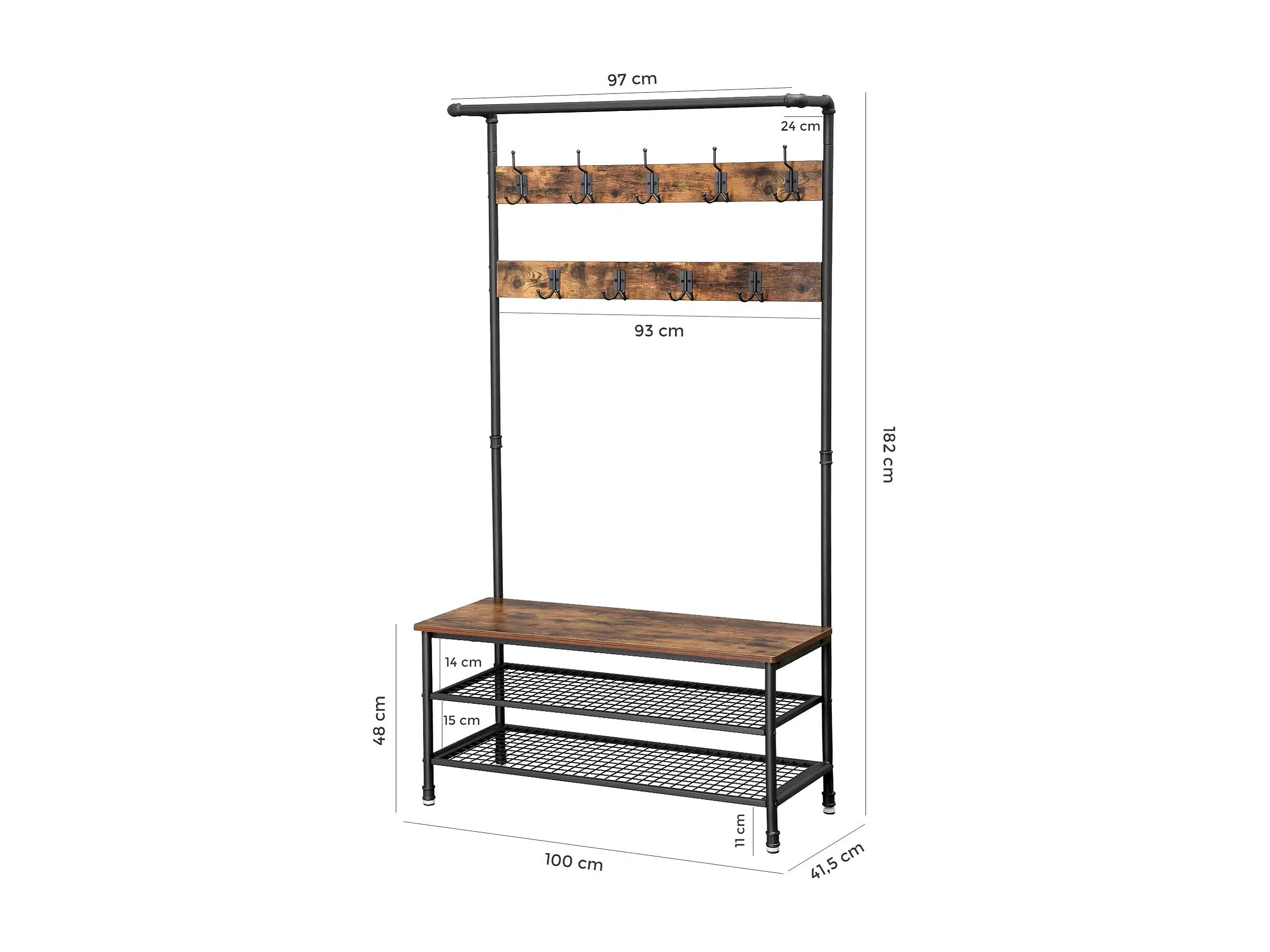 Wieszak na ubrania Valora z siedziskiem i 2 półkami na buty, rustykalny brąz