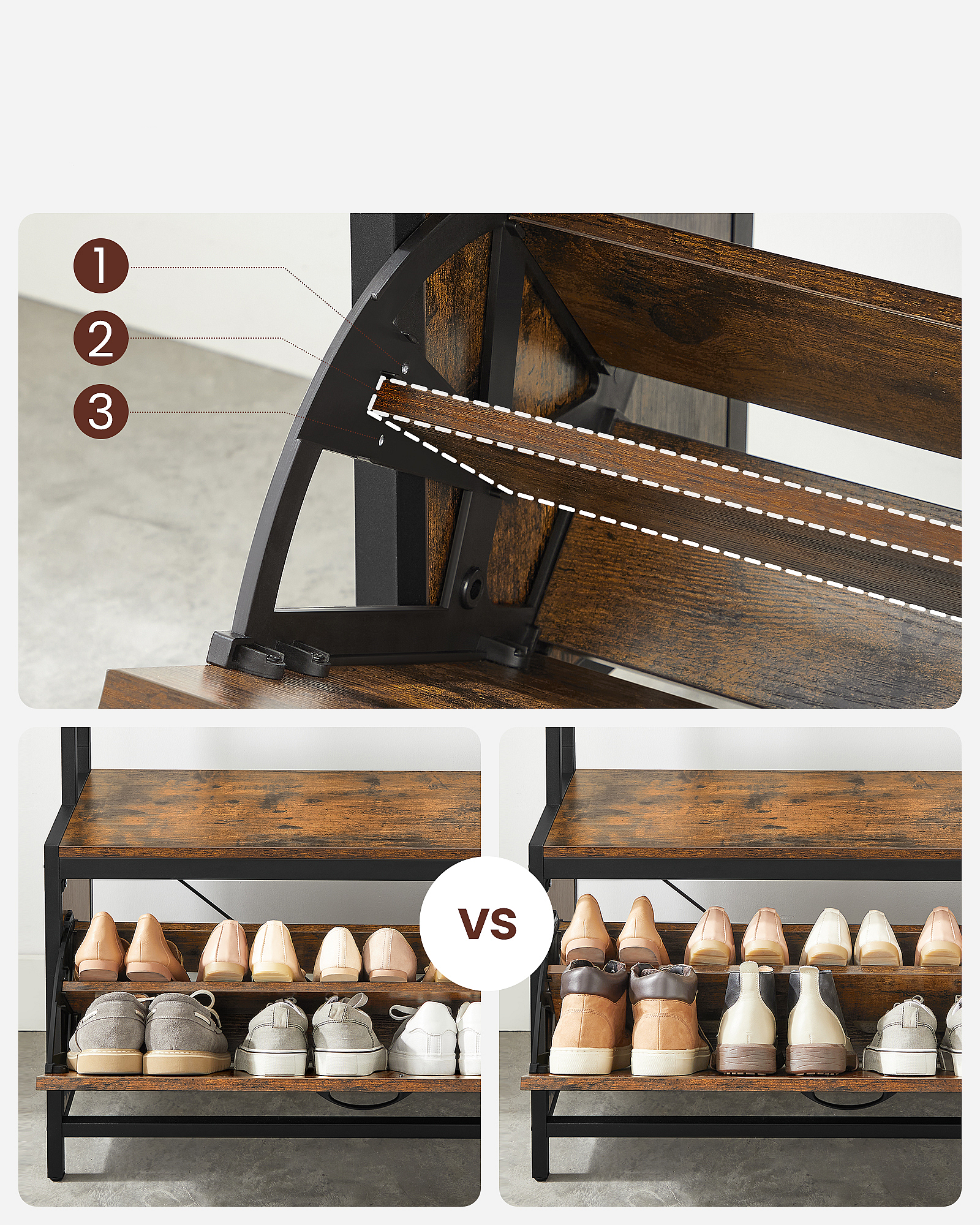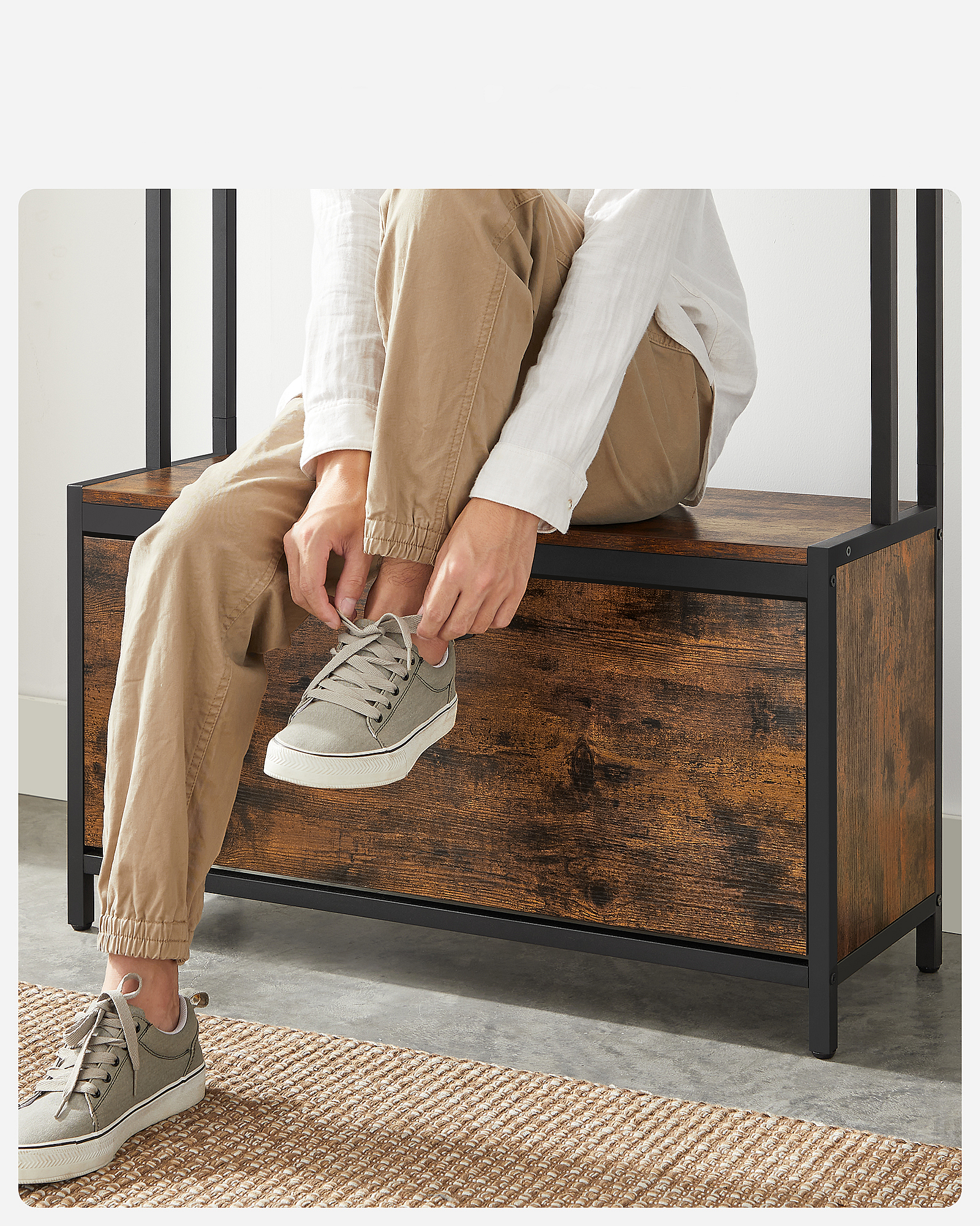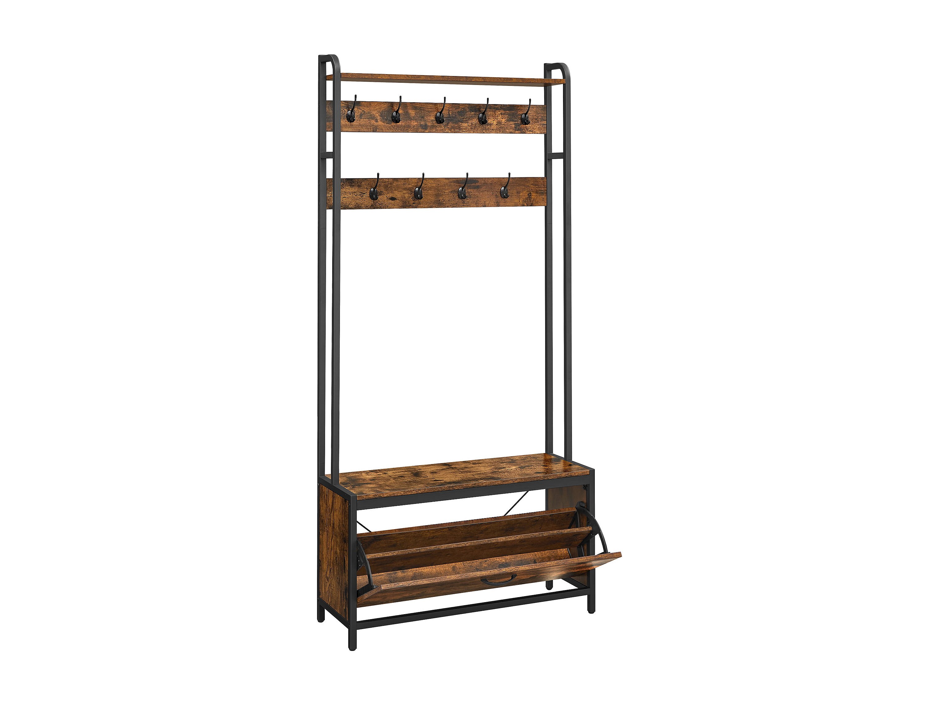 Wieszak na ubrania Valora z siedziskiem i półkami na buty – rustykalny brąz i czerń