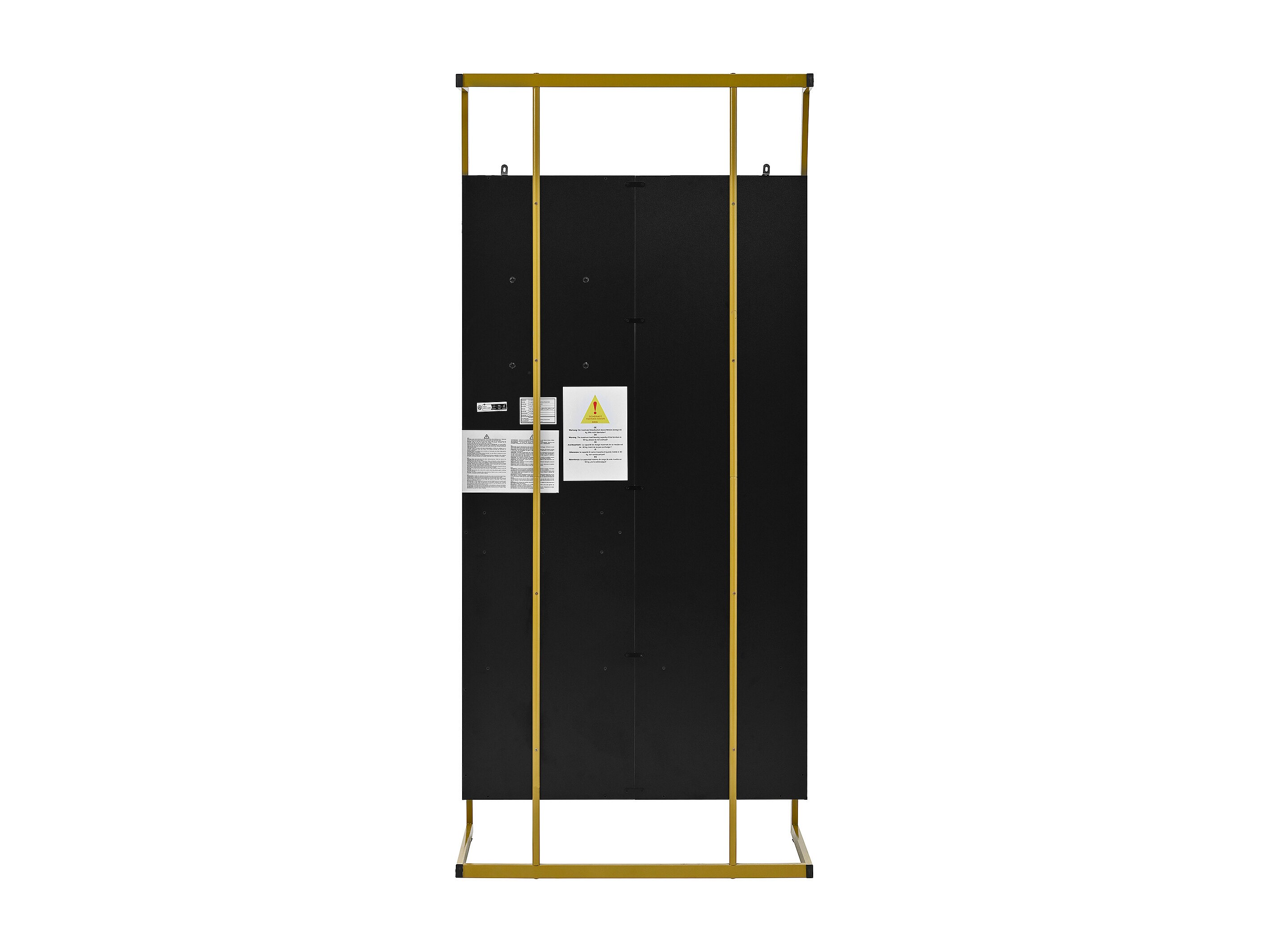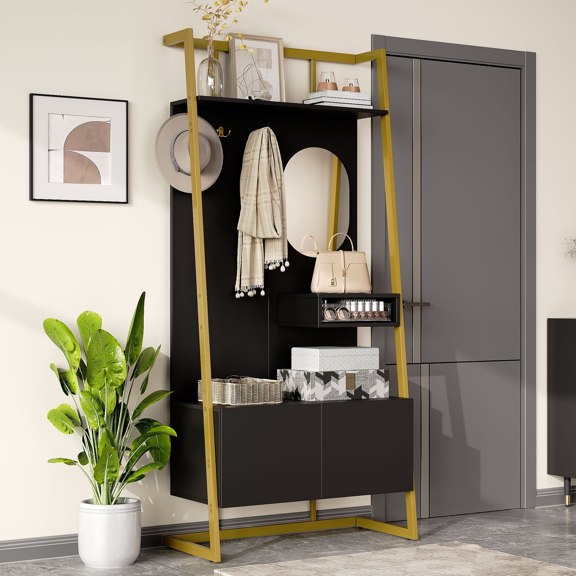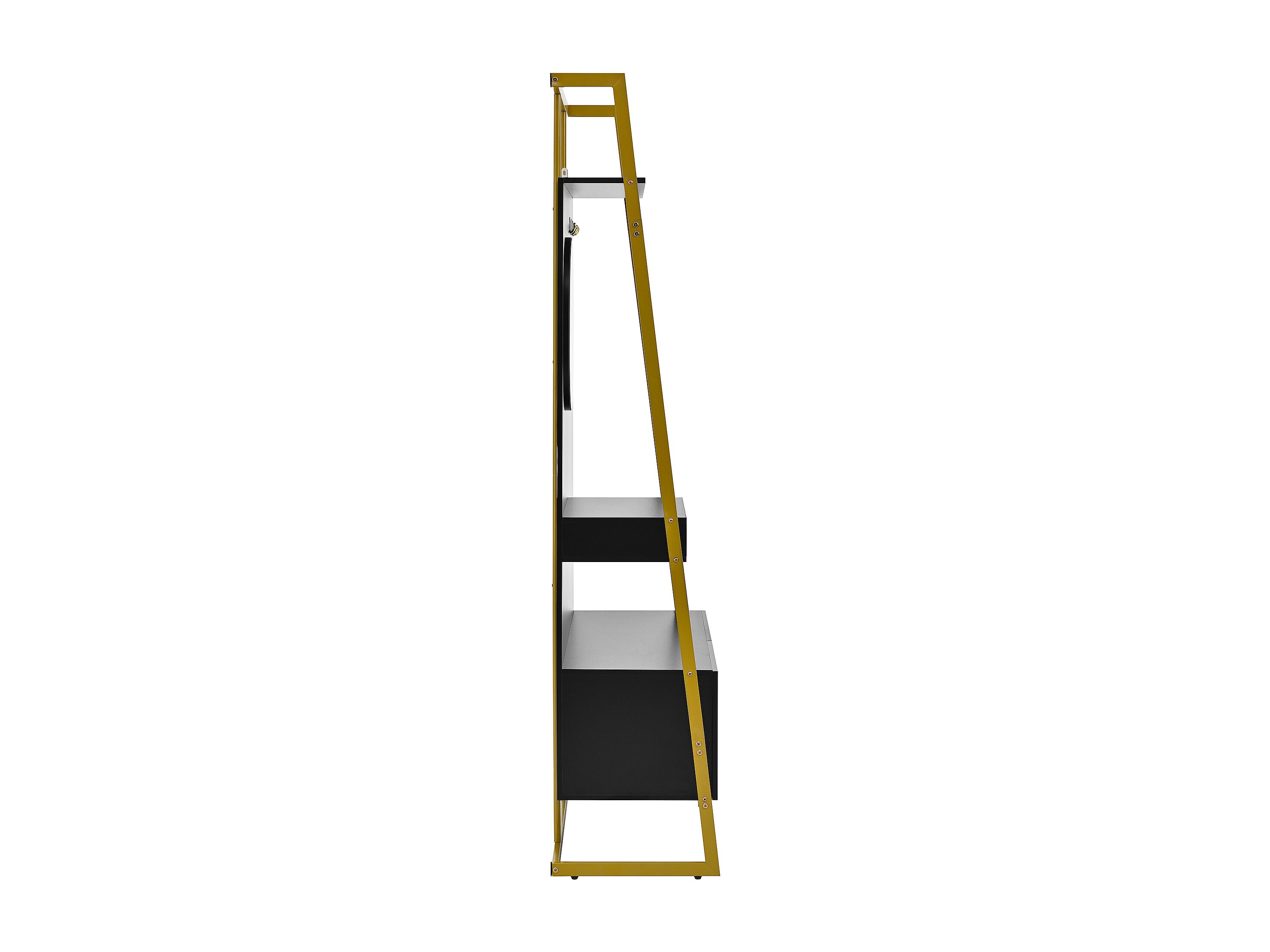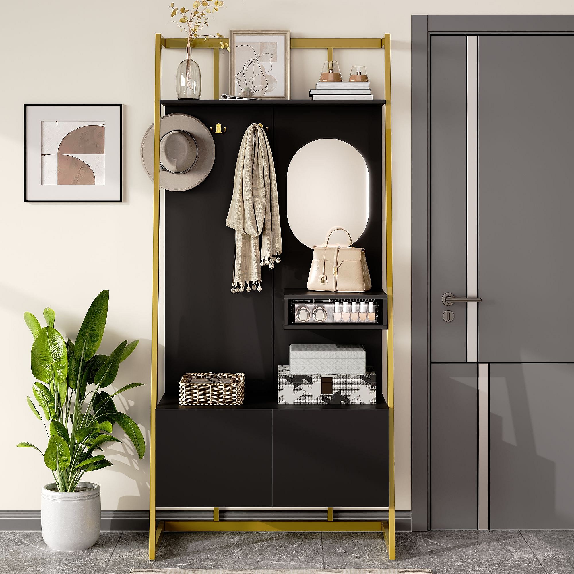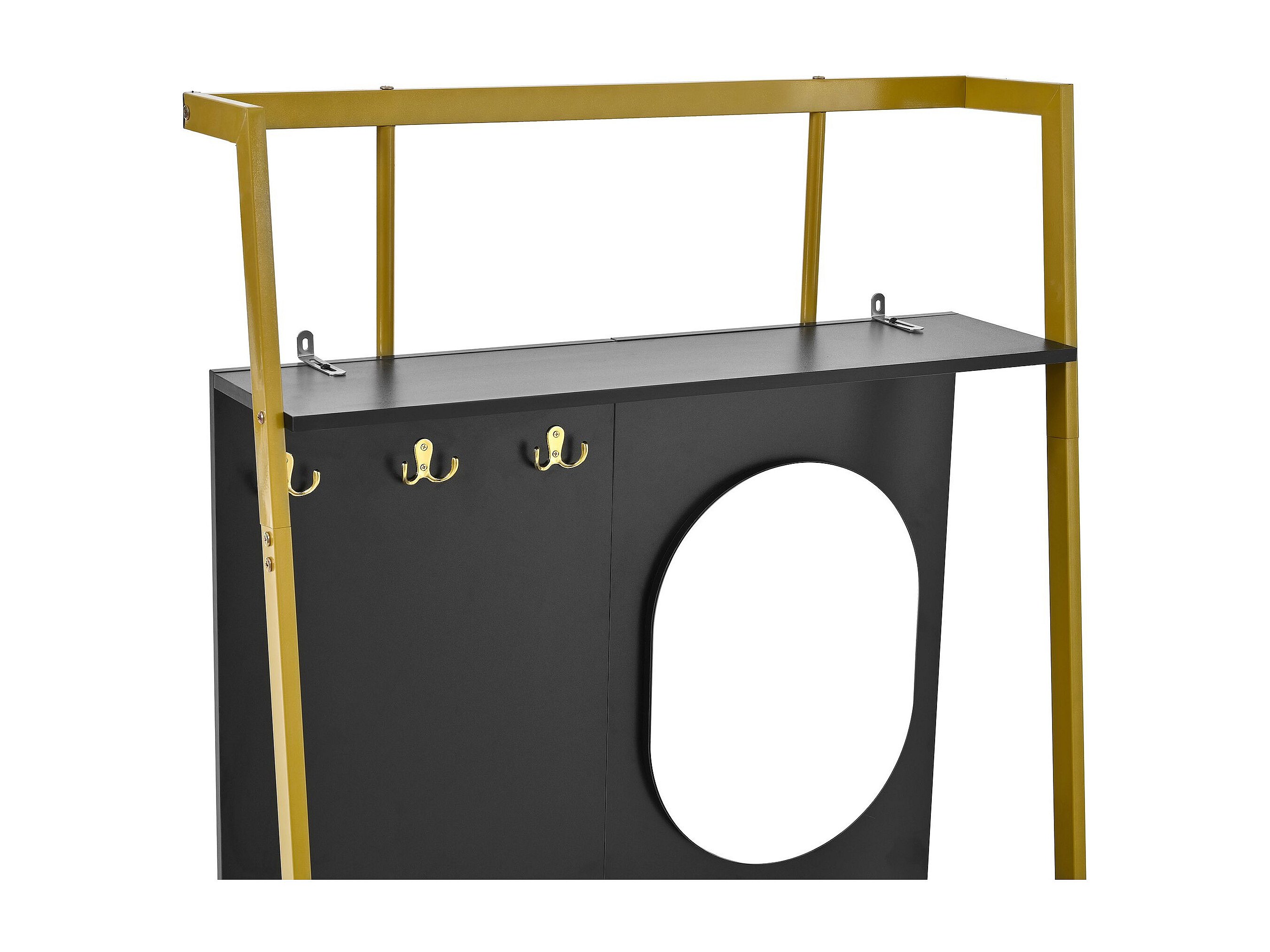Wieszak na ubrania z 2-drzwiową szafką na buty, metalowymi haczykami i lustrem – czarno-złoty