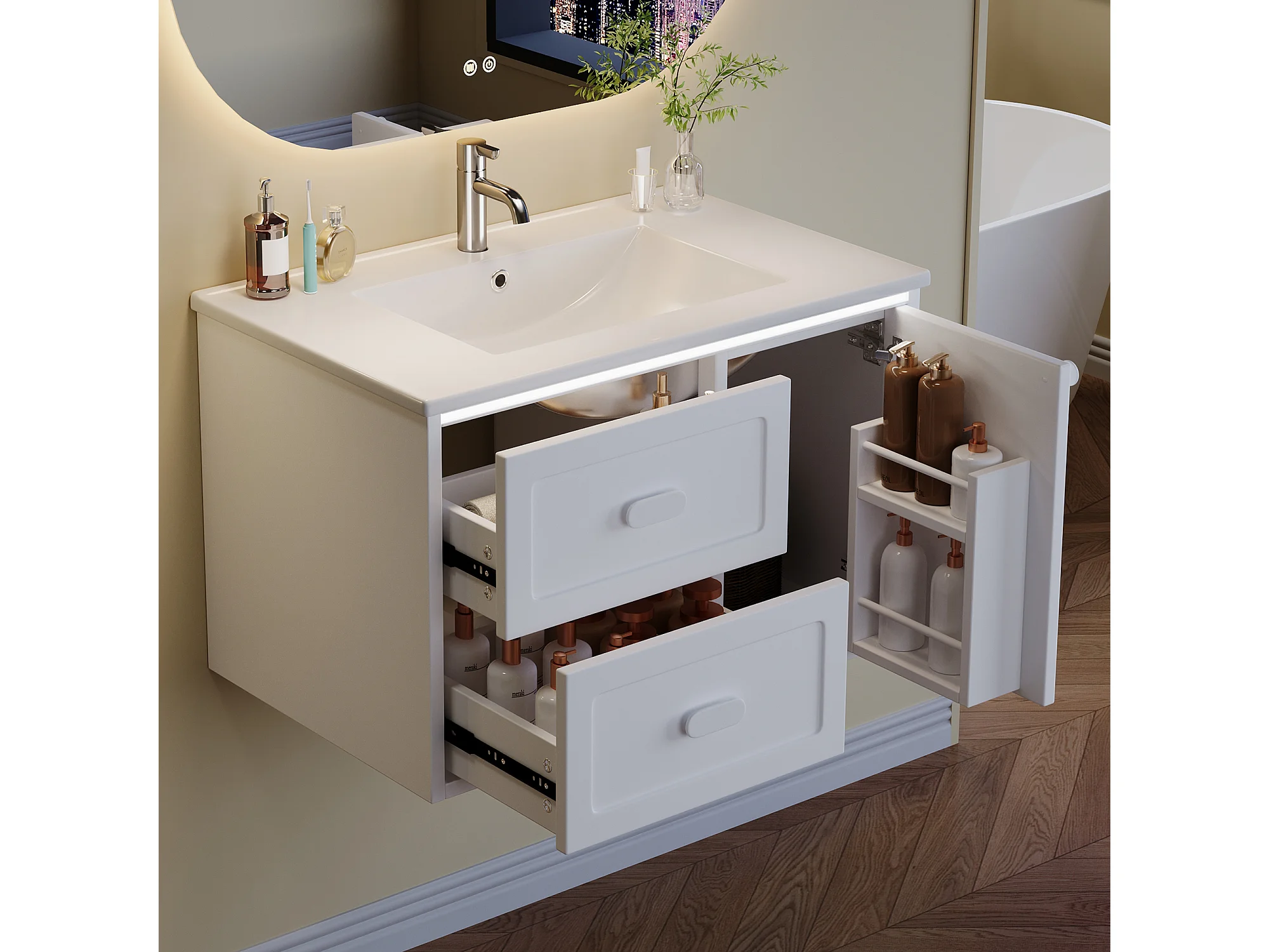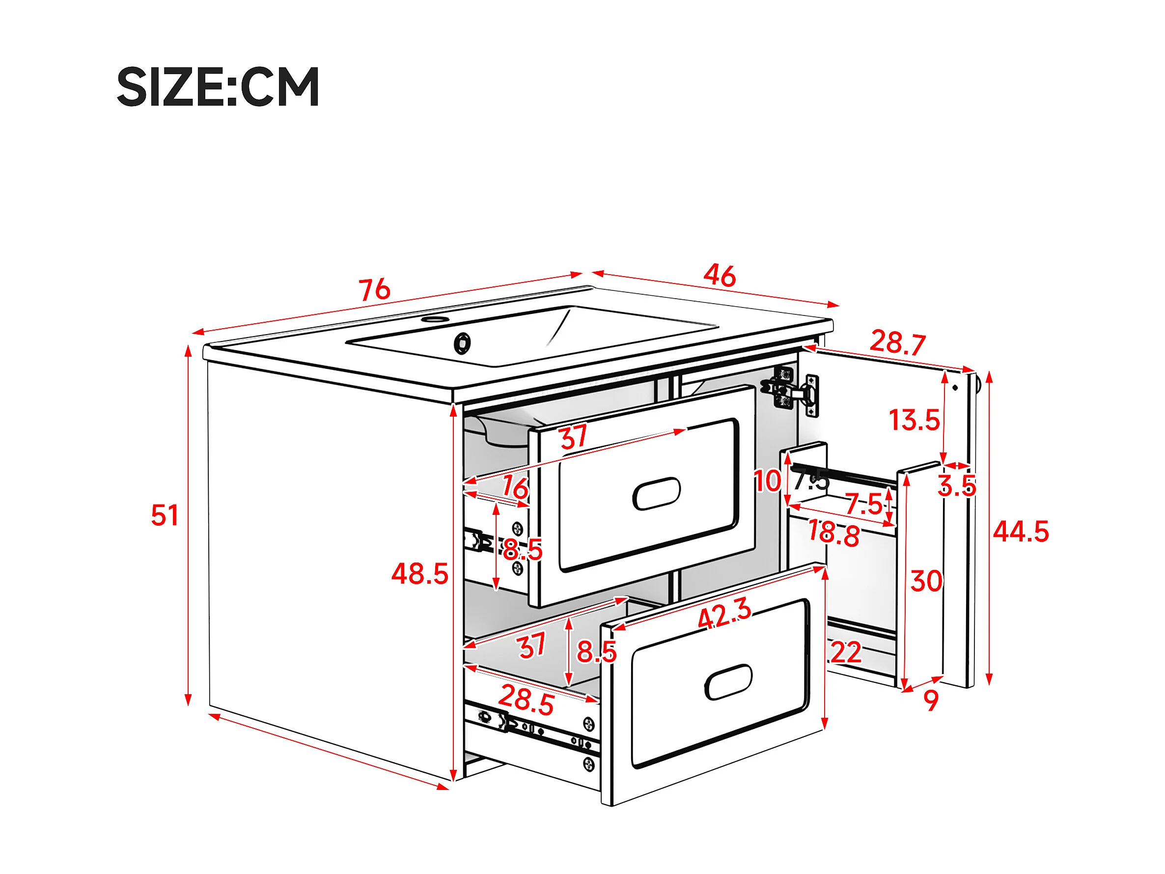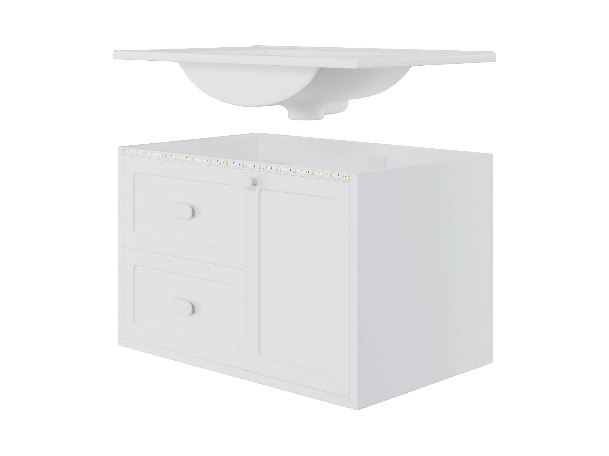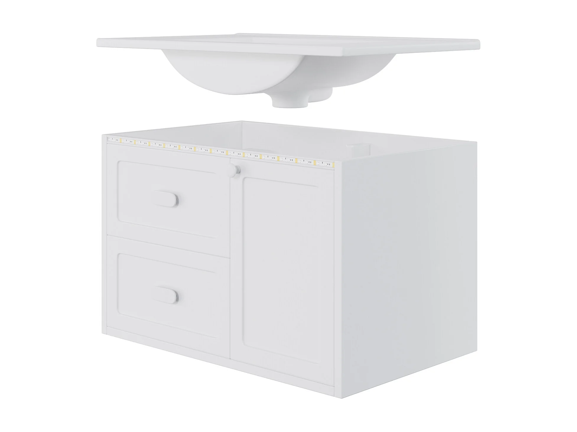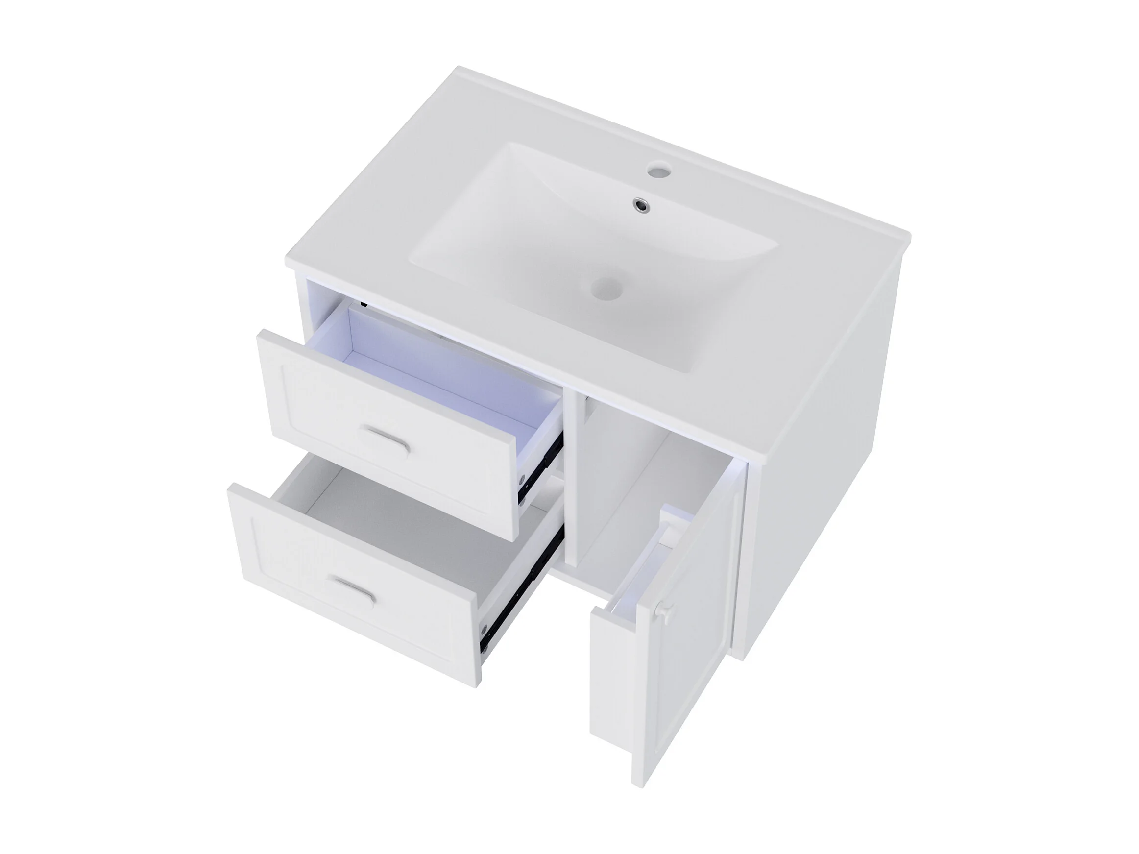Wiszący mebel łazienkowy 76x46x51 cm - z ceramiczna umywalką - 2 szuflady i 1 drzwi - z LED - Biały