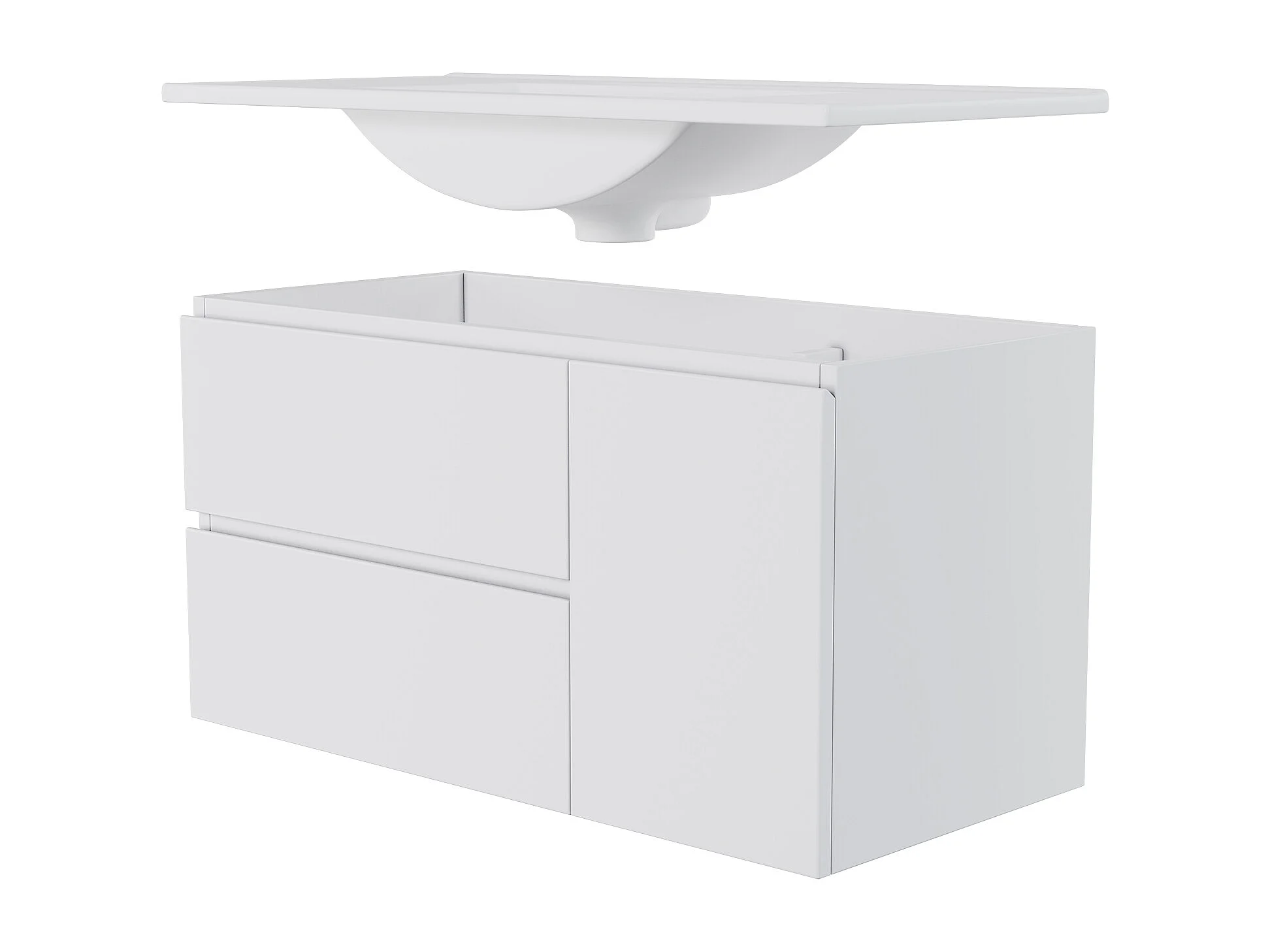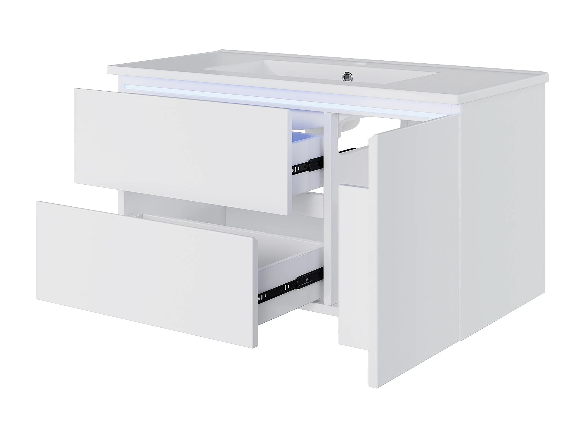 Wiszący mebel łazienkowy 91x46,5x50,5 cm - z ceramiczna umywalką - z oświetleniem LED - 2 szuflady i 1 drzwi - Biały