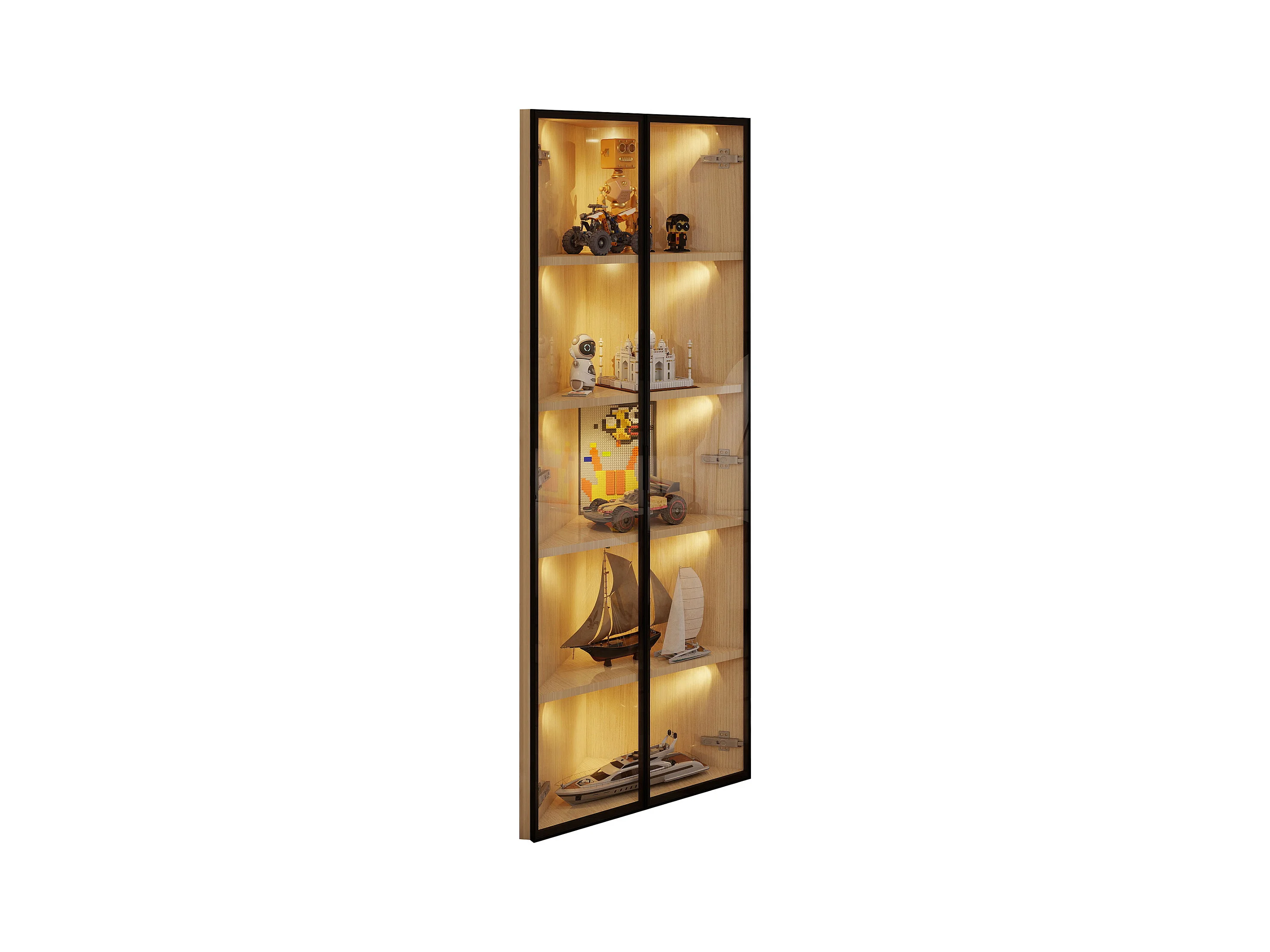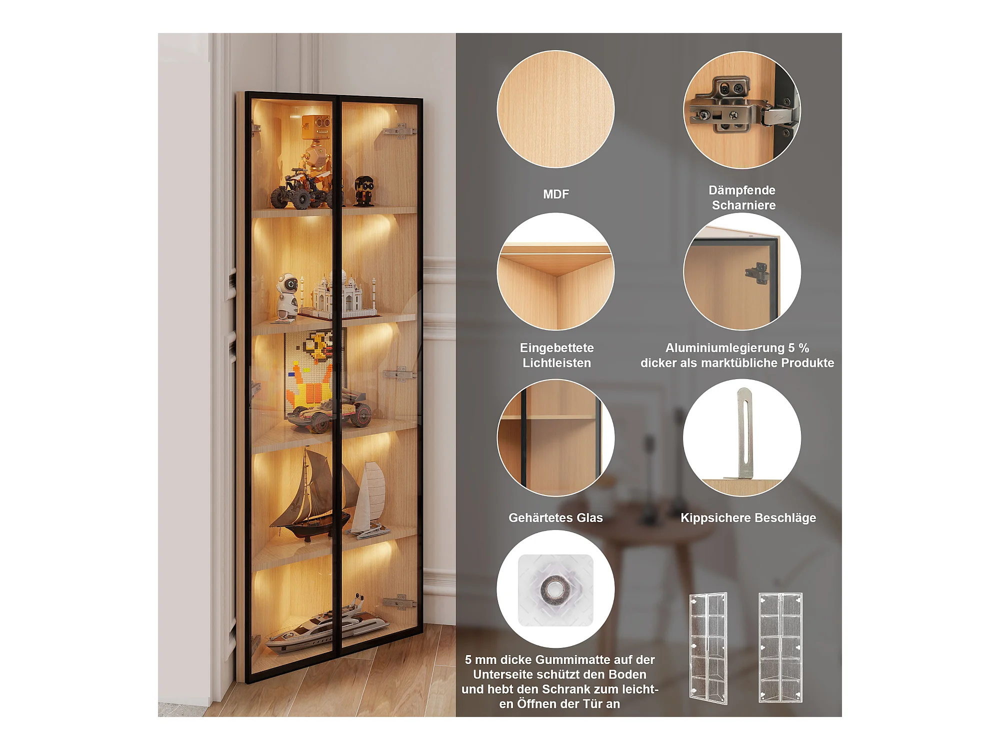 Nowoczesna witryna - 80 x 35 x 160 cm - 8 półek + 2 drzwi + diody LED - płyta wiórowa - kolor naturalny