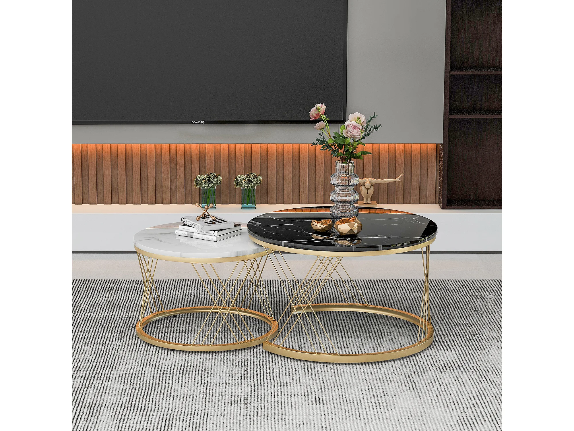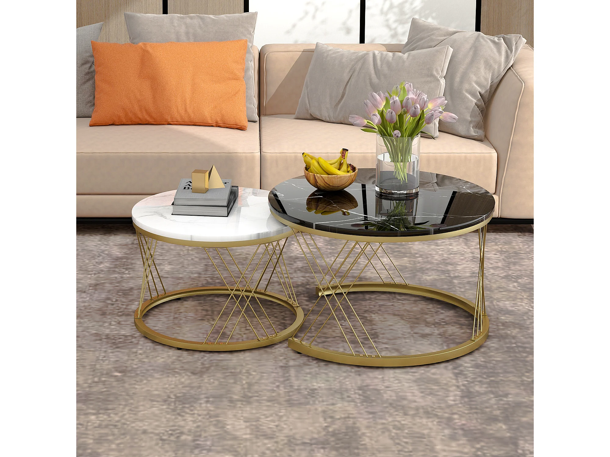 Wkładane stoliki kawowe z drewna - Biała okleina imitująca marmur i złoty metal - MDF - do salonu - Czarny + biały