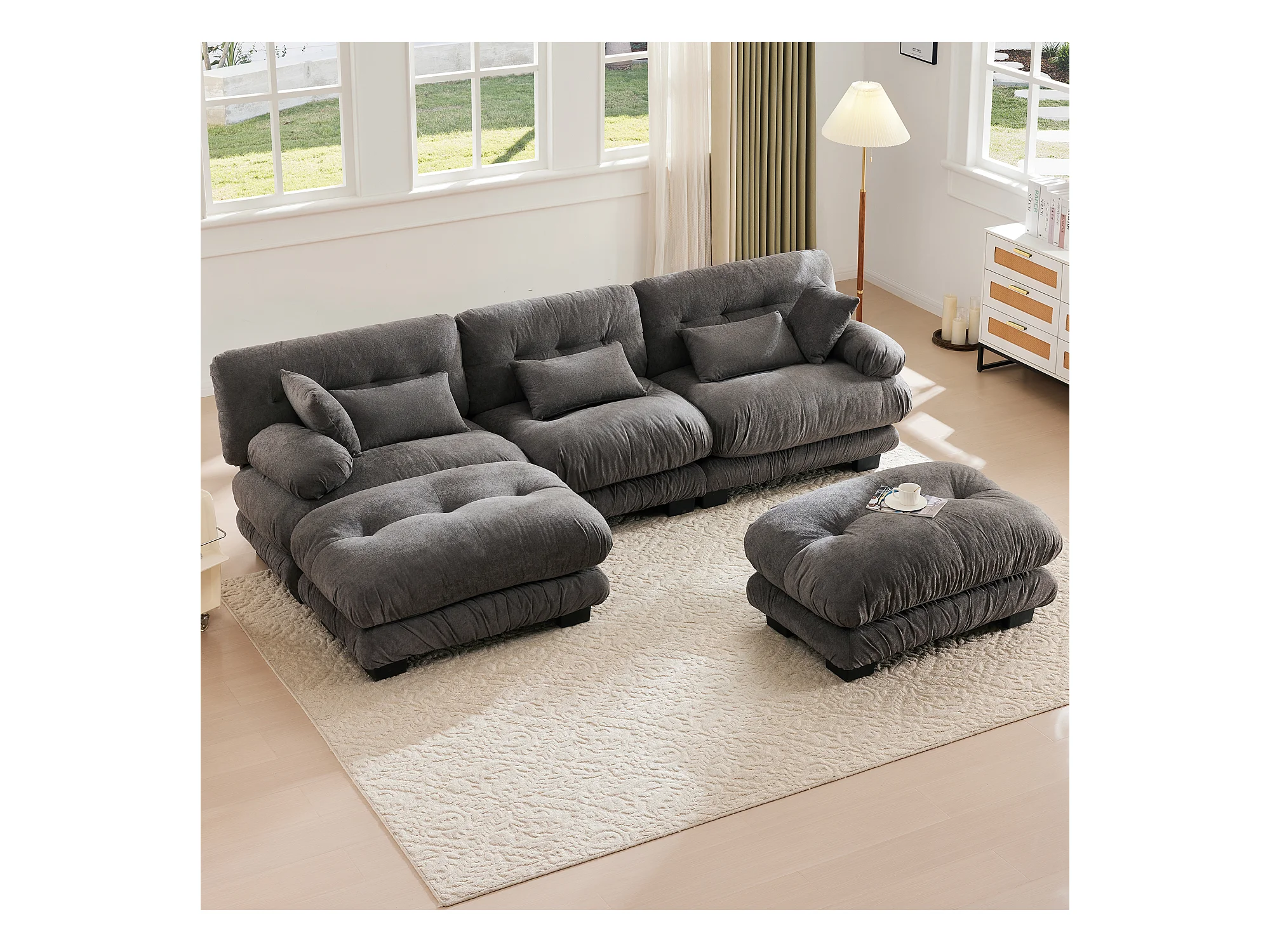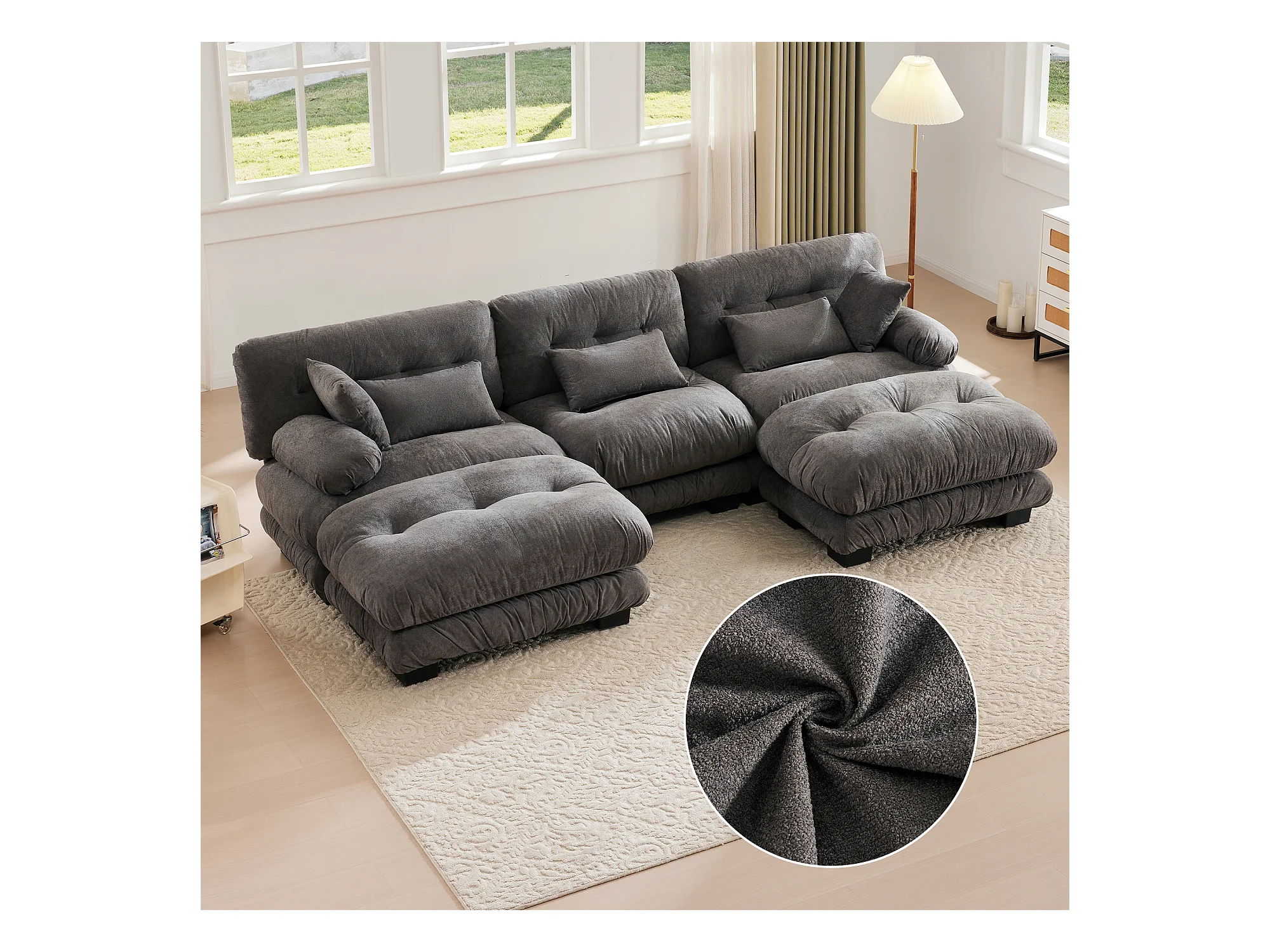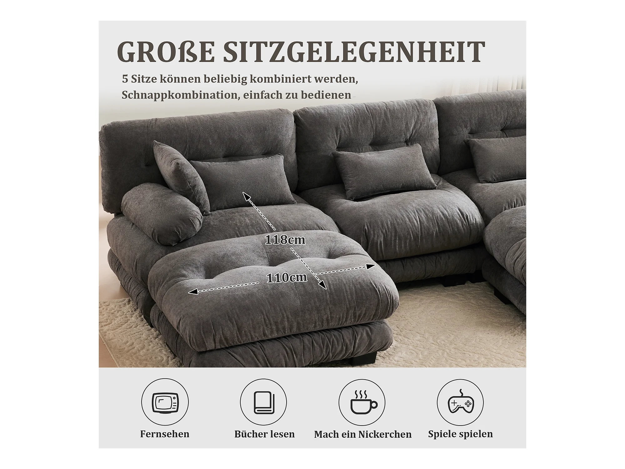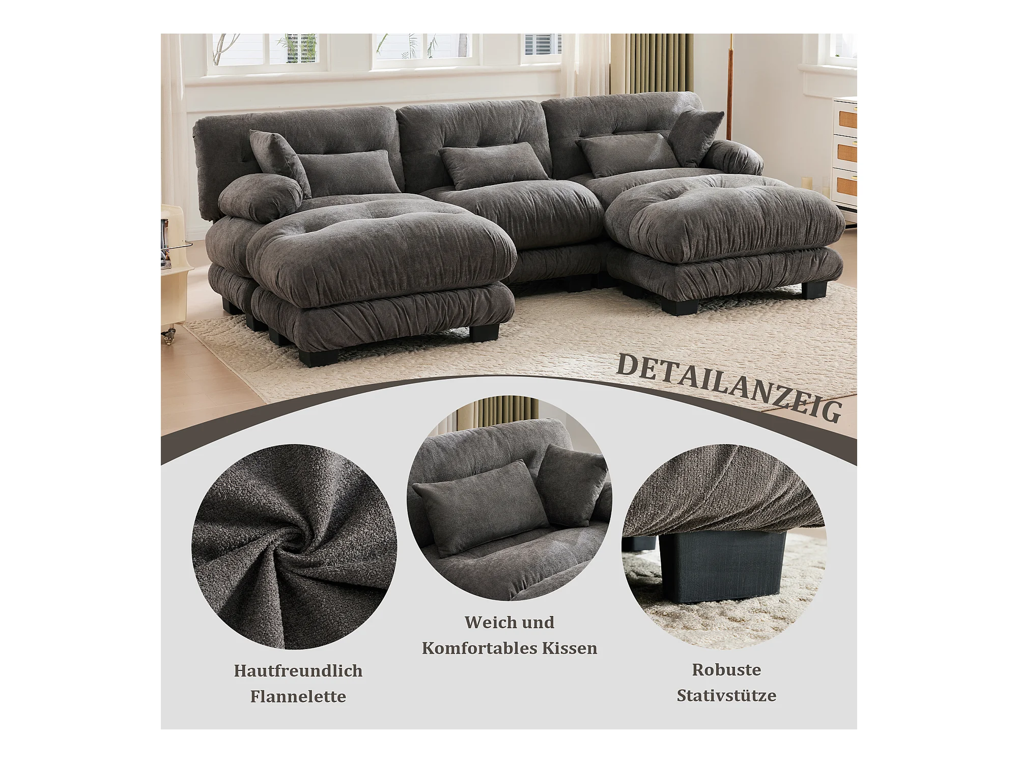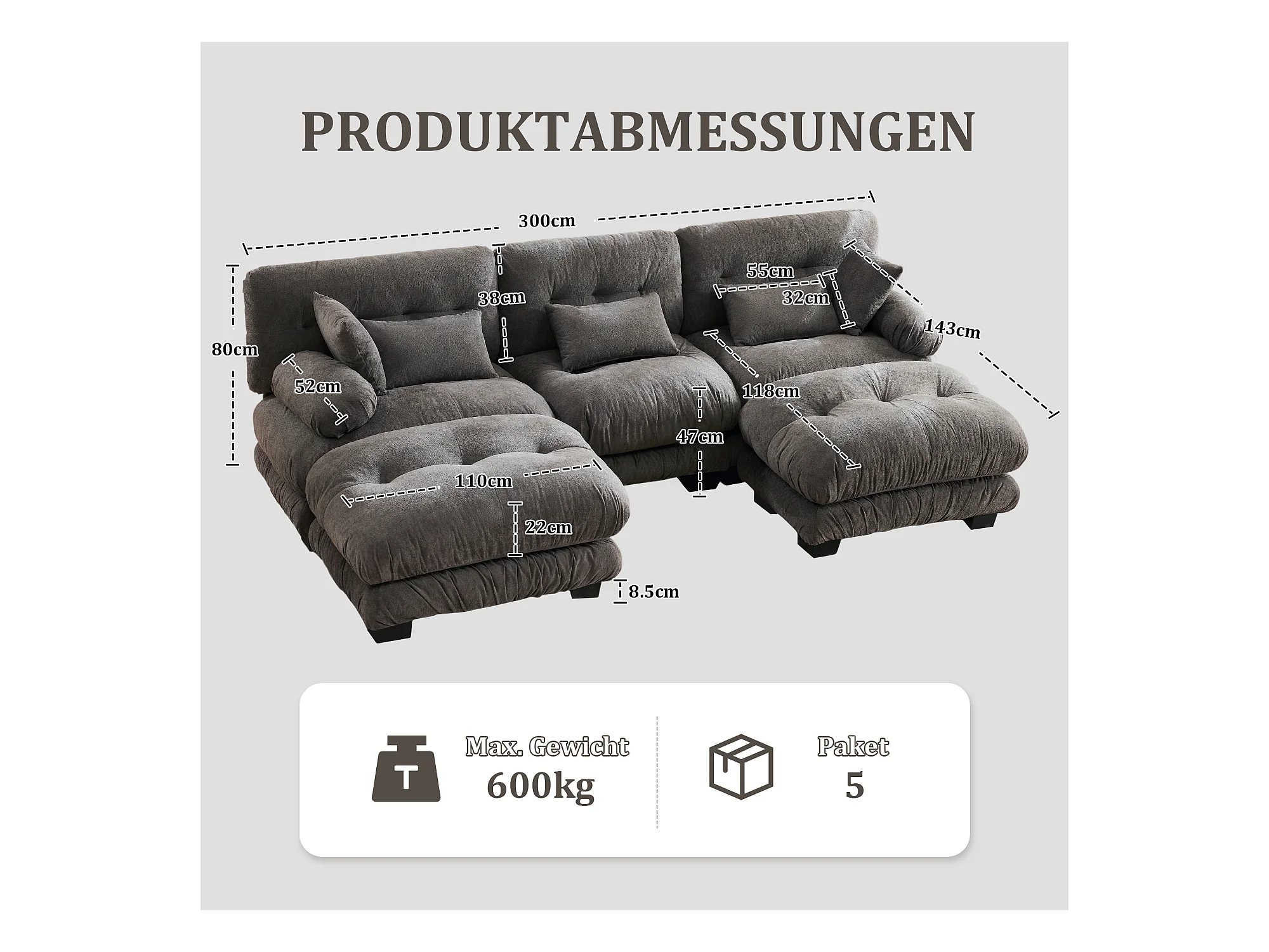 Wygodna sofa modułowa 5-osobowa - 300 x 143 x 80 cm - z 5 poduszkami - welur - szara