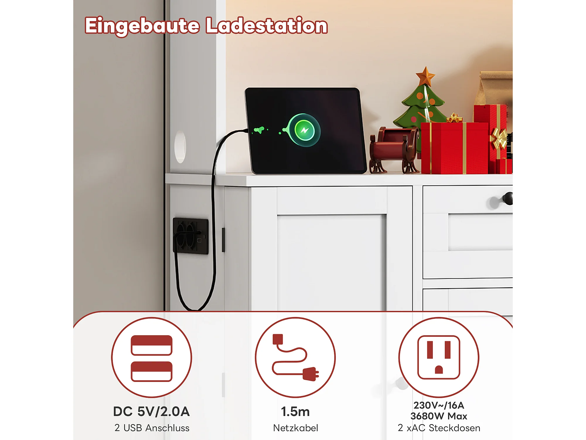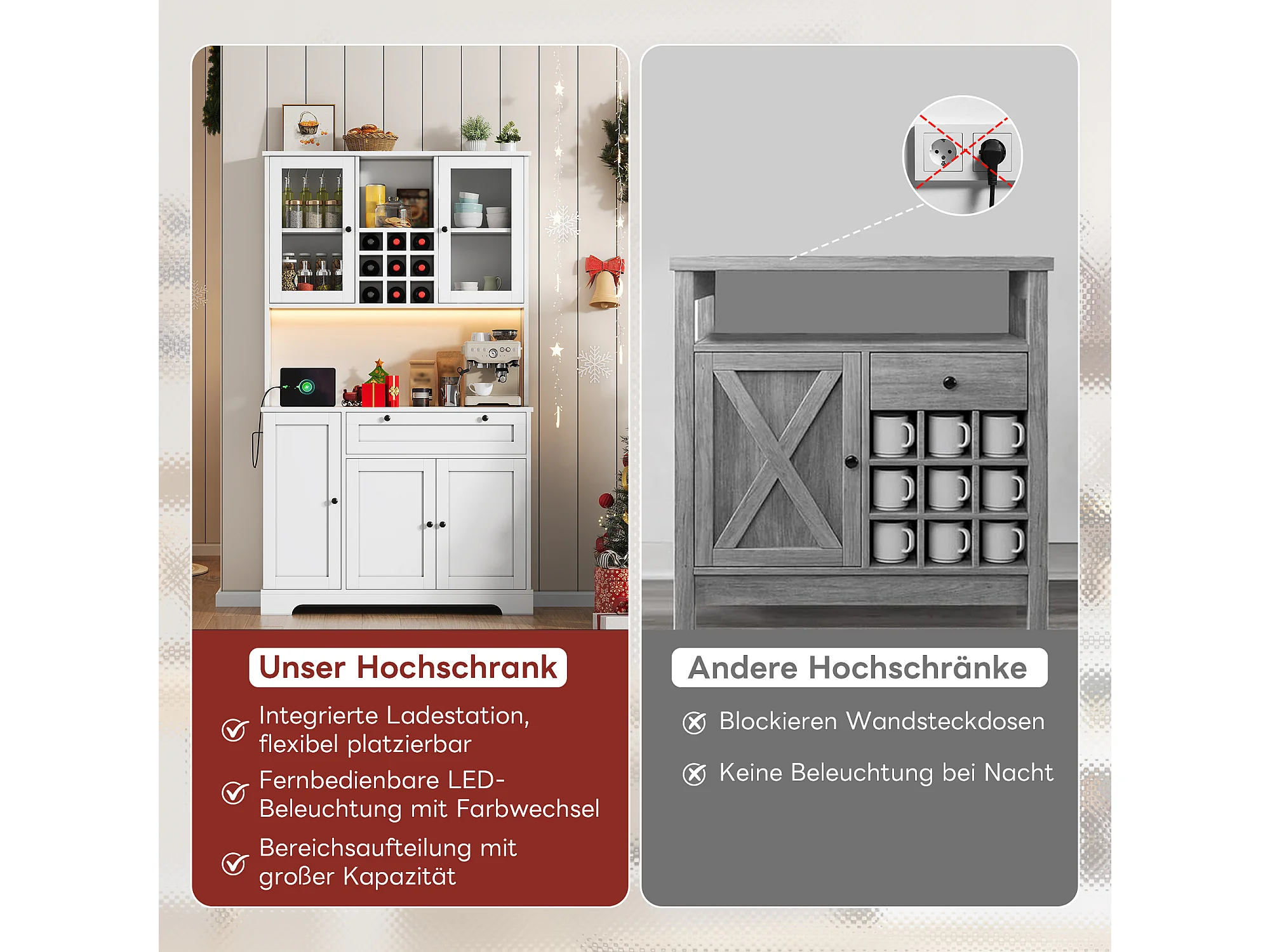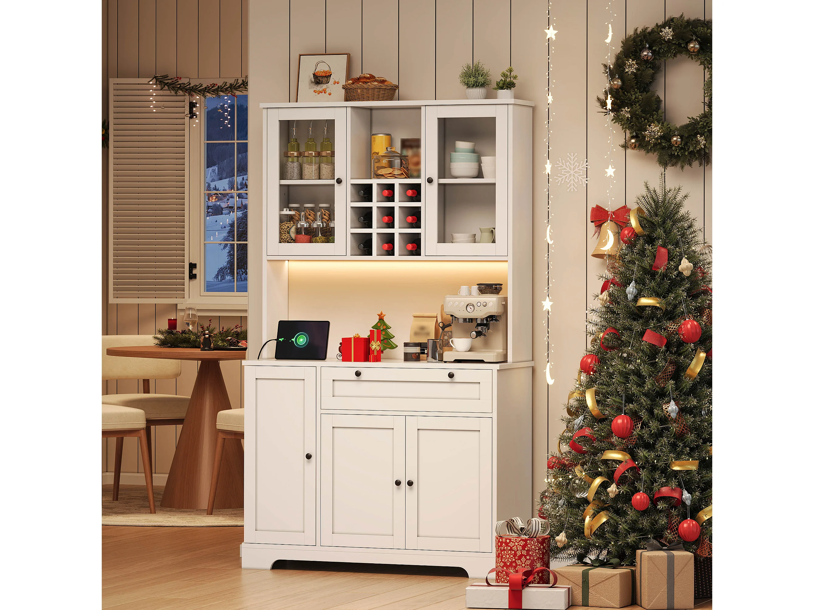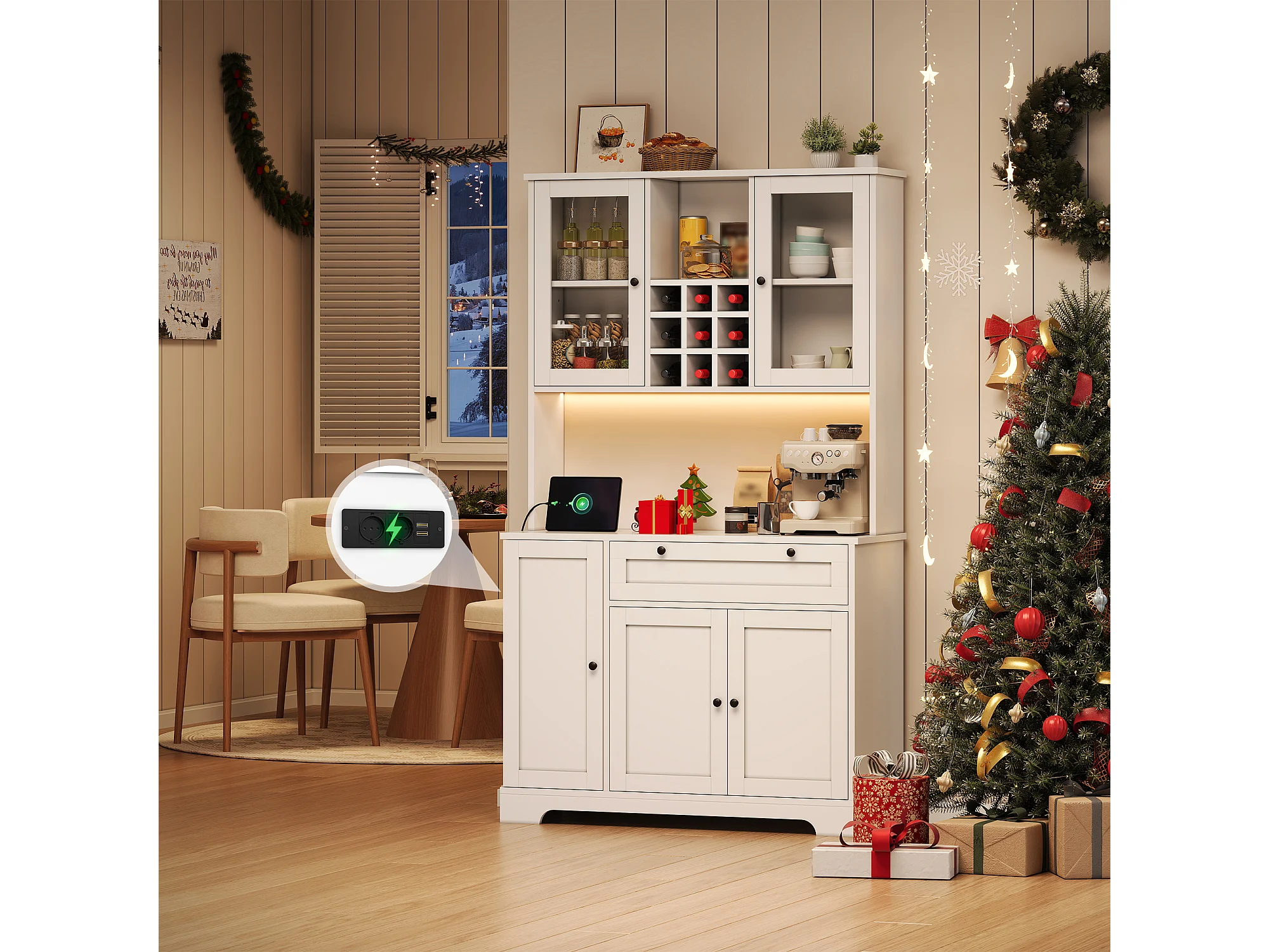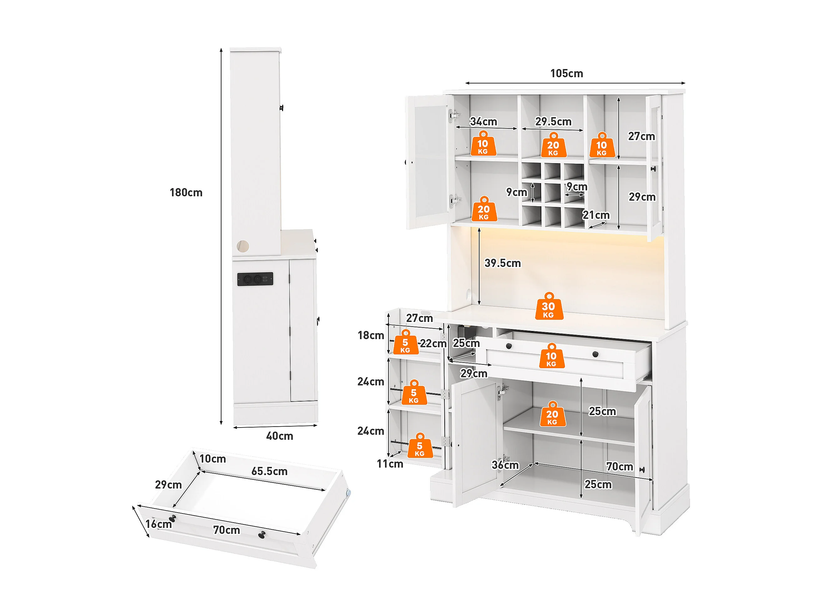 Wysoka komoda kuchenna - 105 x 40 x 180 cm - z szufladą + 5 drzwi + półki + diody + gniazdka - MDF - biała
