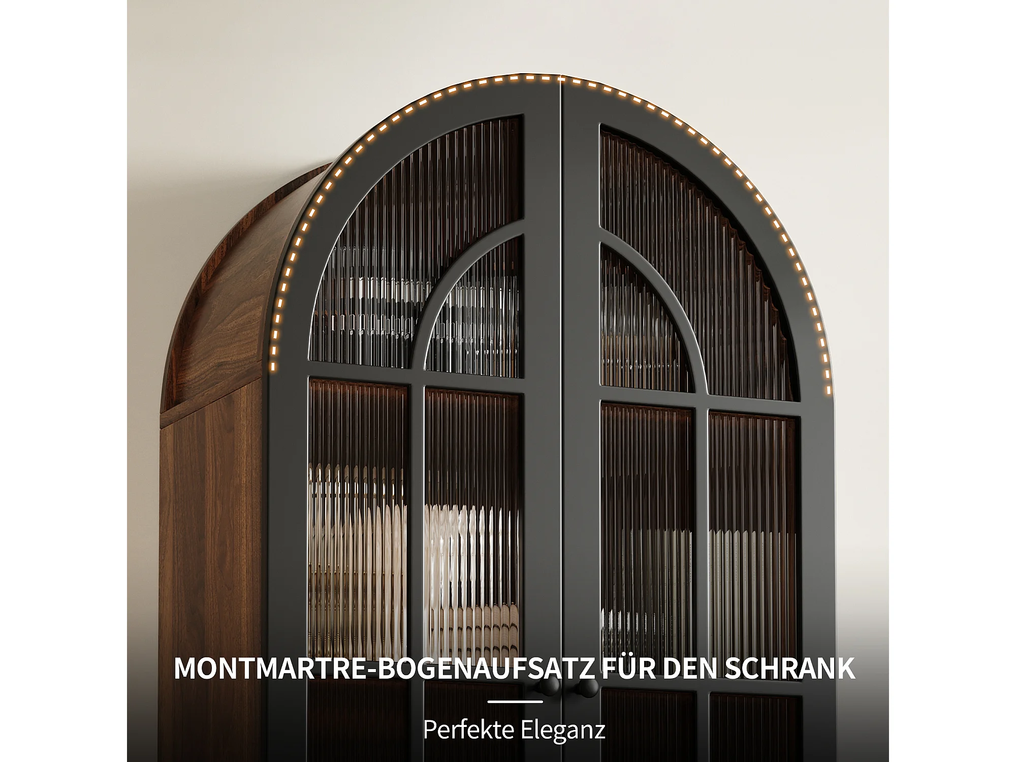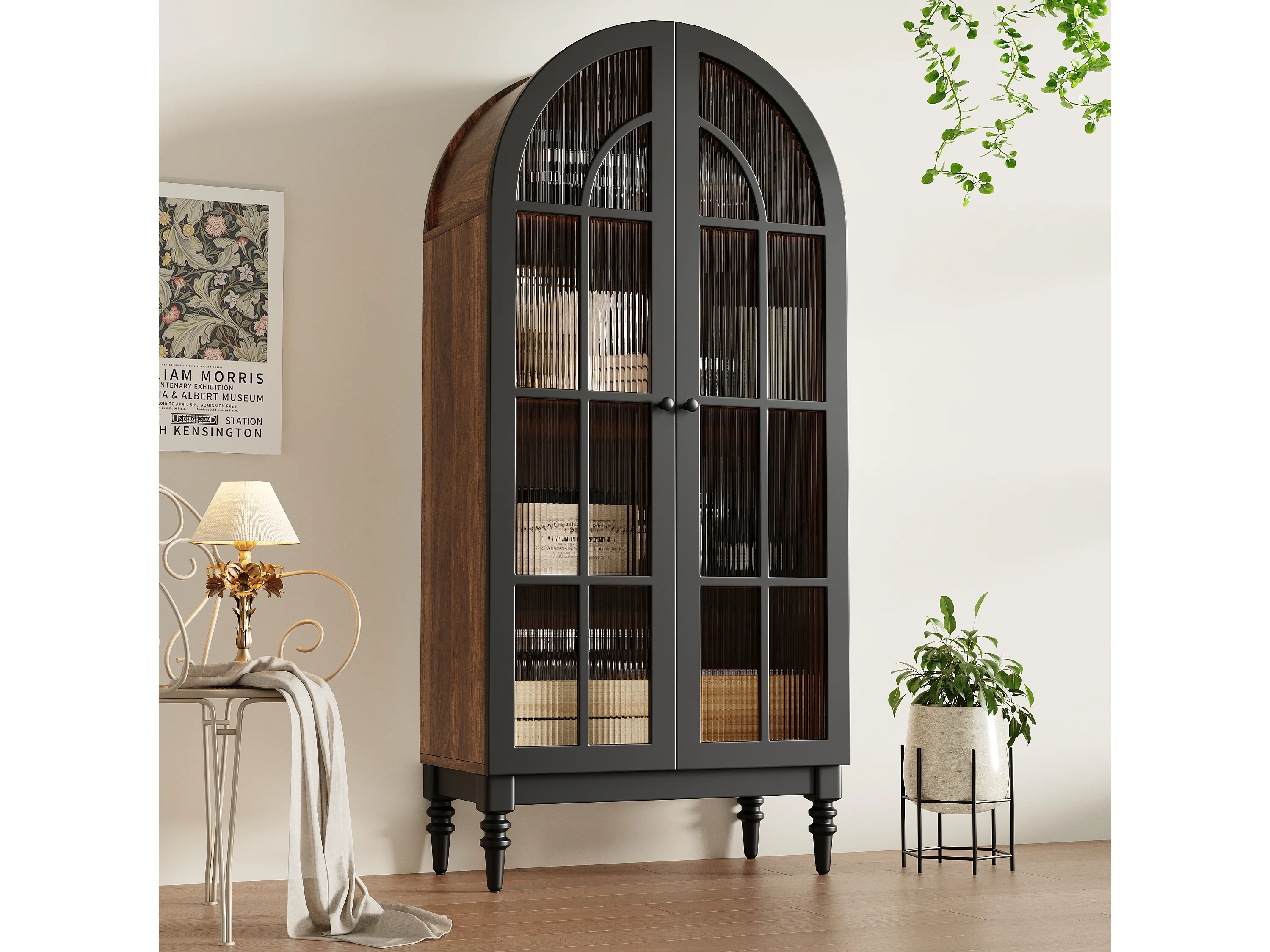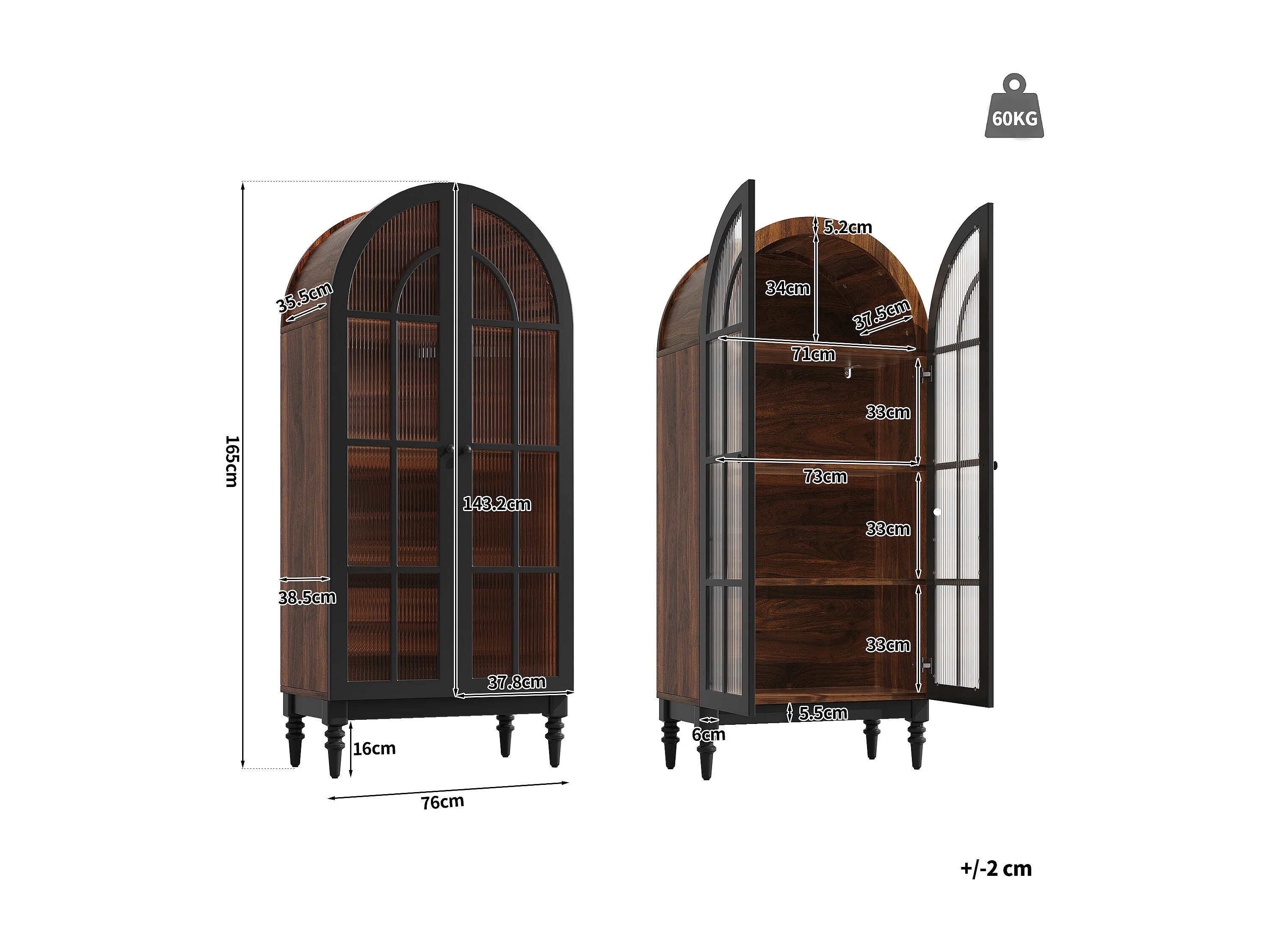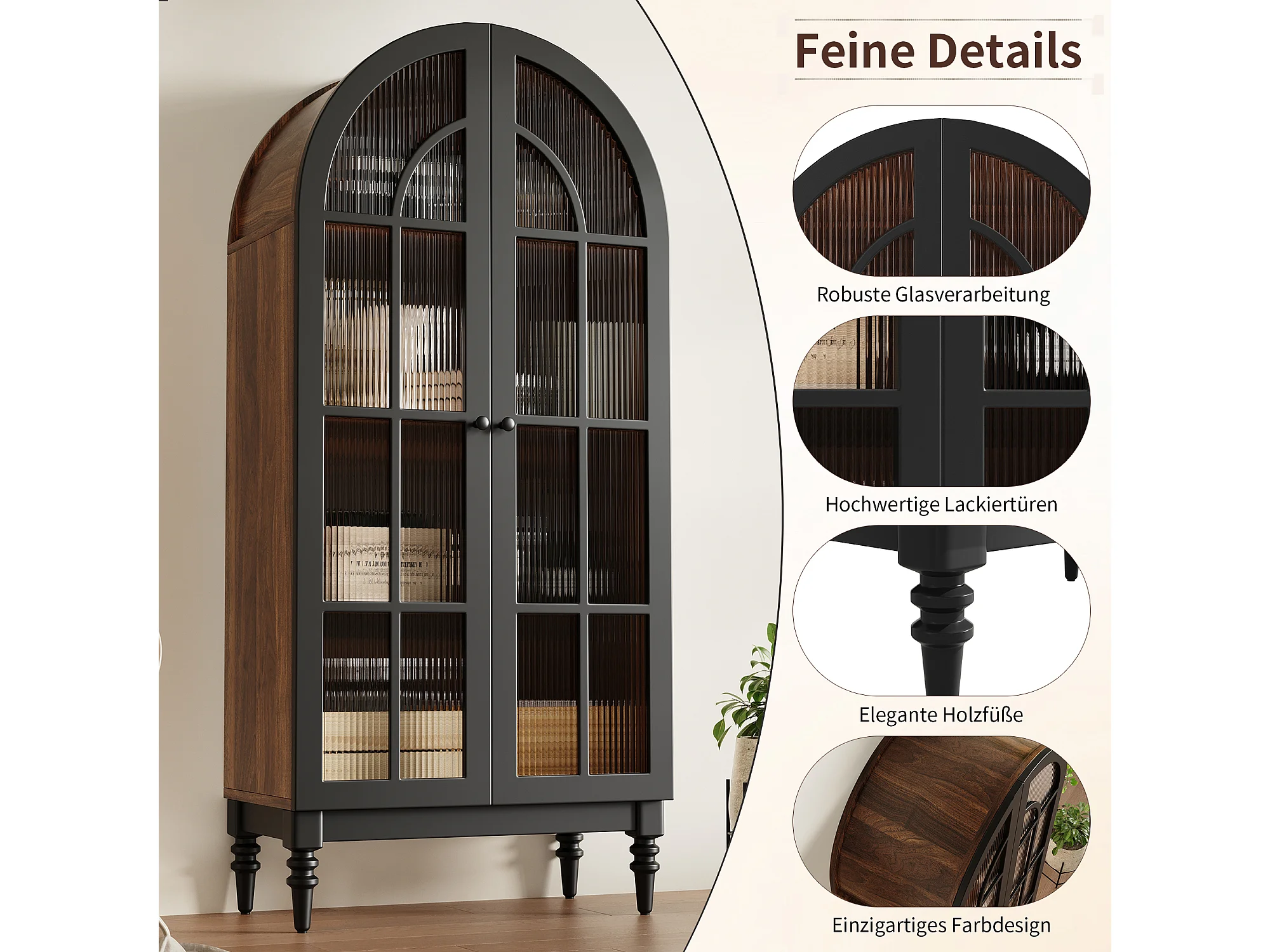 Wysoka, zakrzywiona komoda z wykończeniem imitującym drewno – 76 x 35,5 x 165 cm – z drzwiami szklanymi – do kuchni i salonu – MDF – czarna