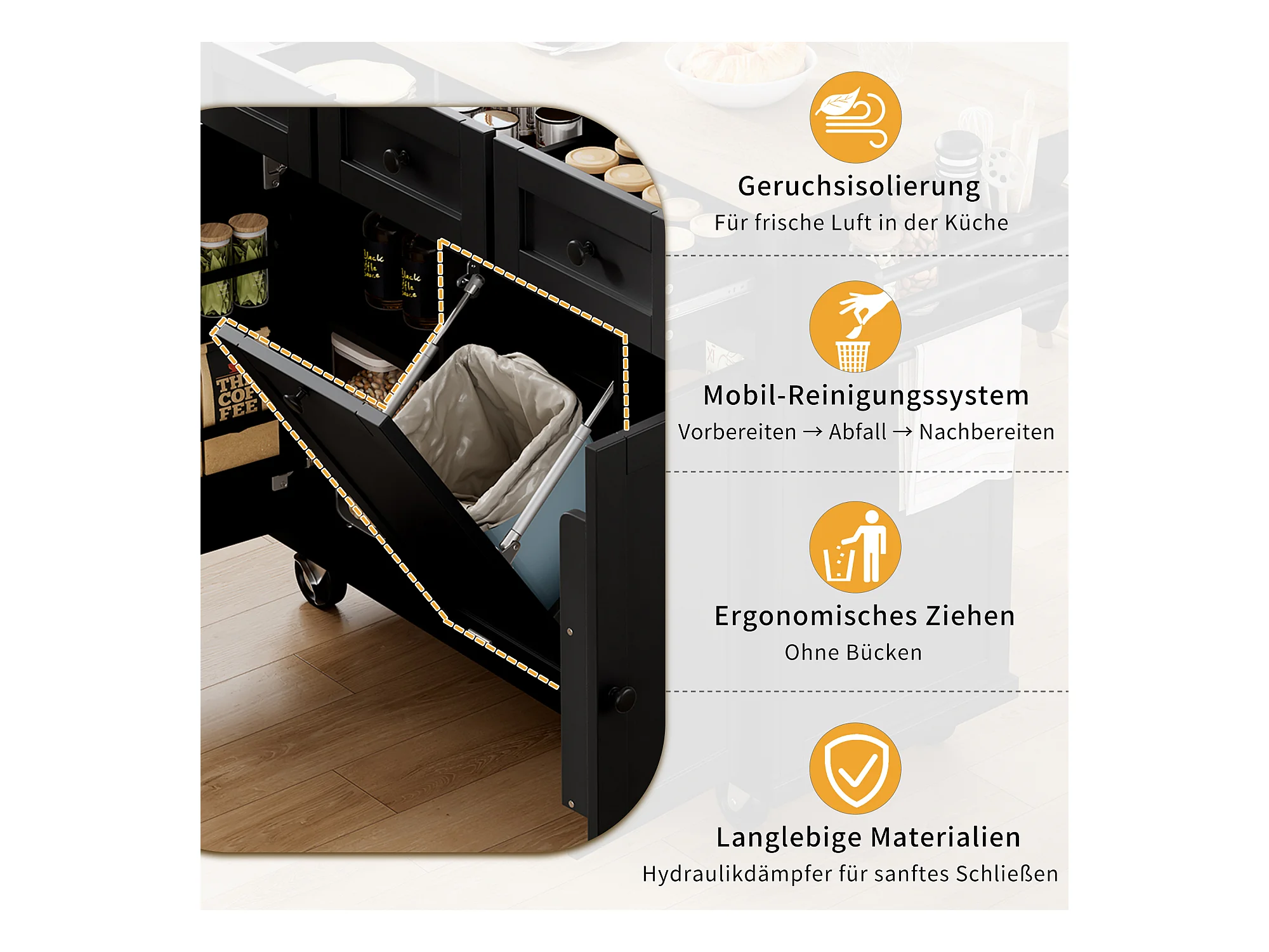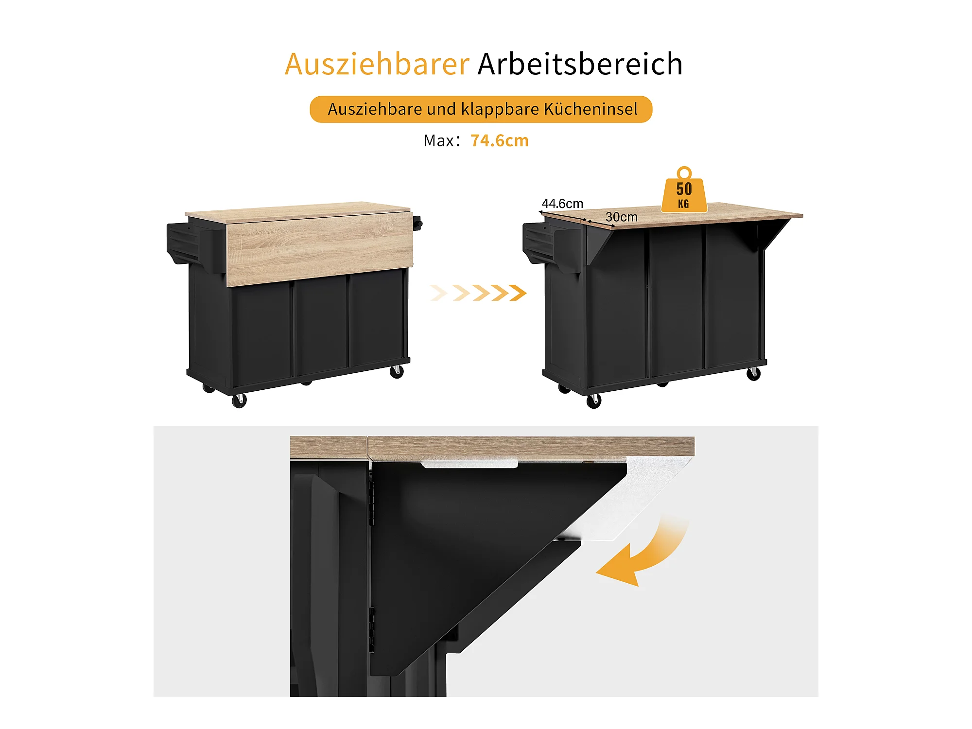 Wyspa centralna na kółkach - 130 x 45/75 x 92 cm - wózek rozkładany + 3 drzwi - MDF - czarny