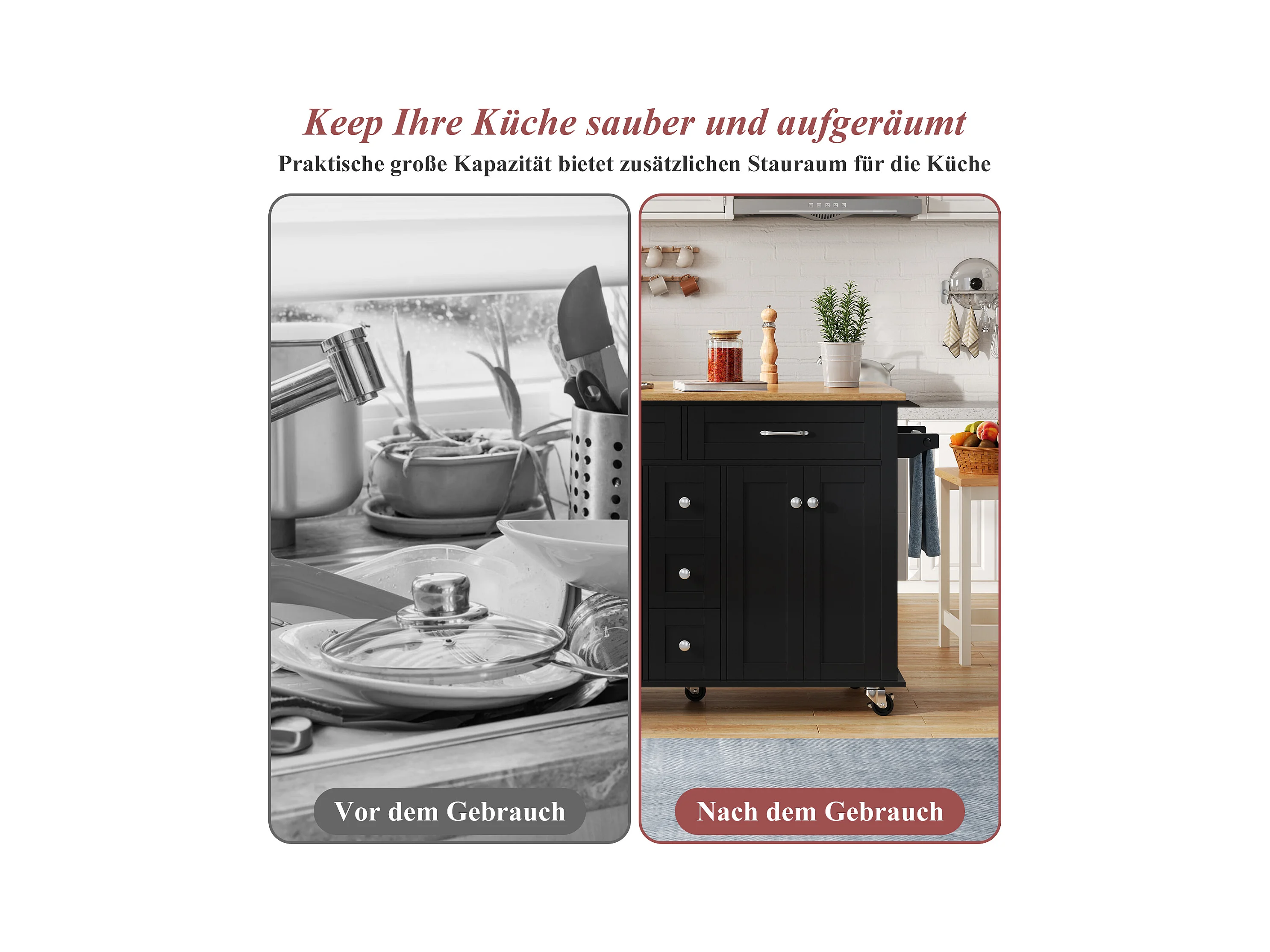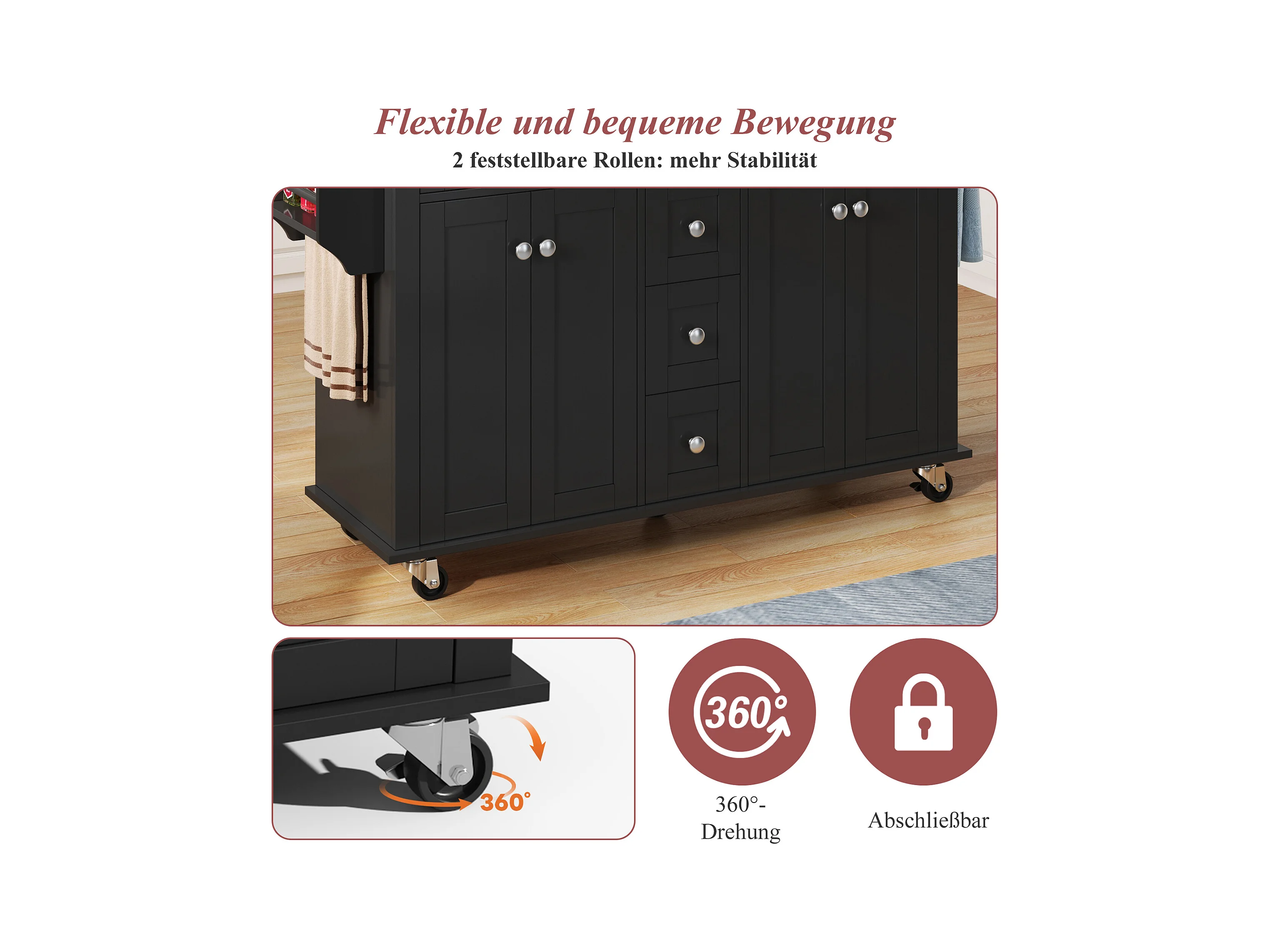 Mobilna wyspa kuchenna - blat rozsuwany - 5 szuflad i 4 drzwi - z wieszakiem na ręczniki - MDF - czarny