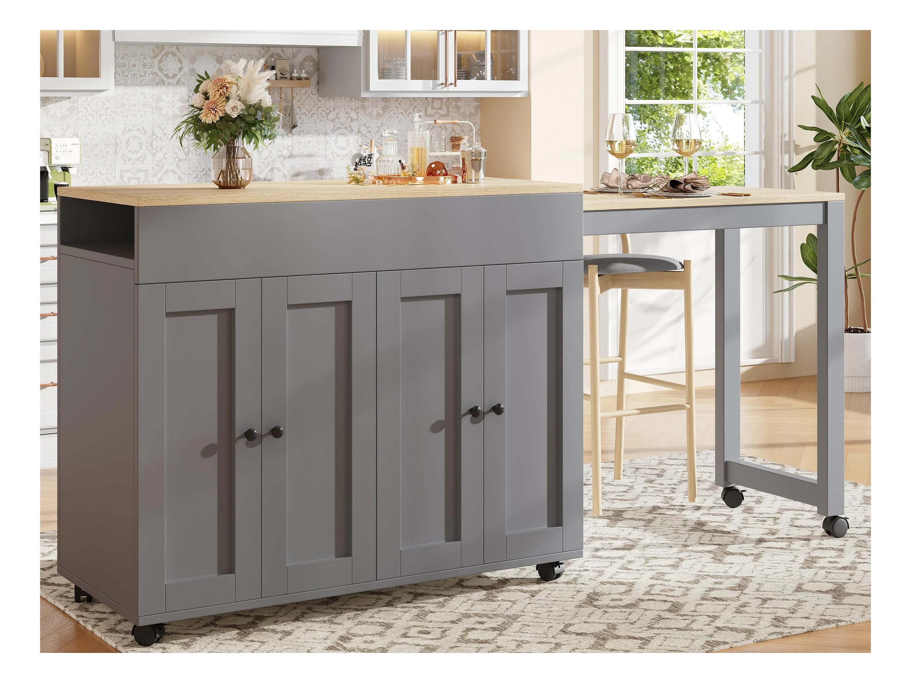 Mobilna wyspa kuchenna z 3 drzwiami i 1 szufladą - Rozkładany blat - 132,5x44(70)x90 cm - Drewno MDF - Szary i naturalny