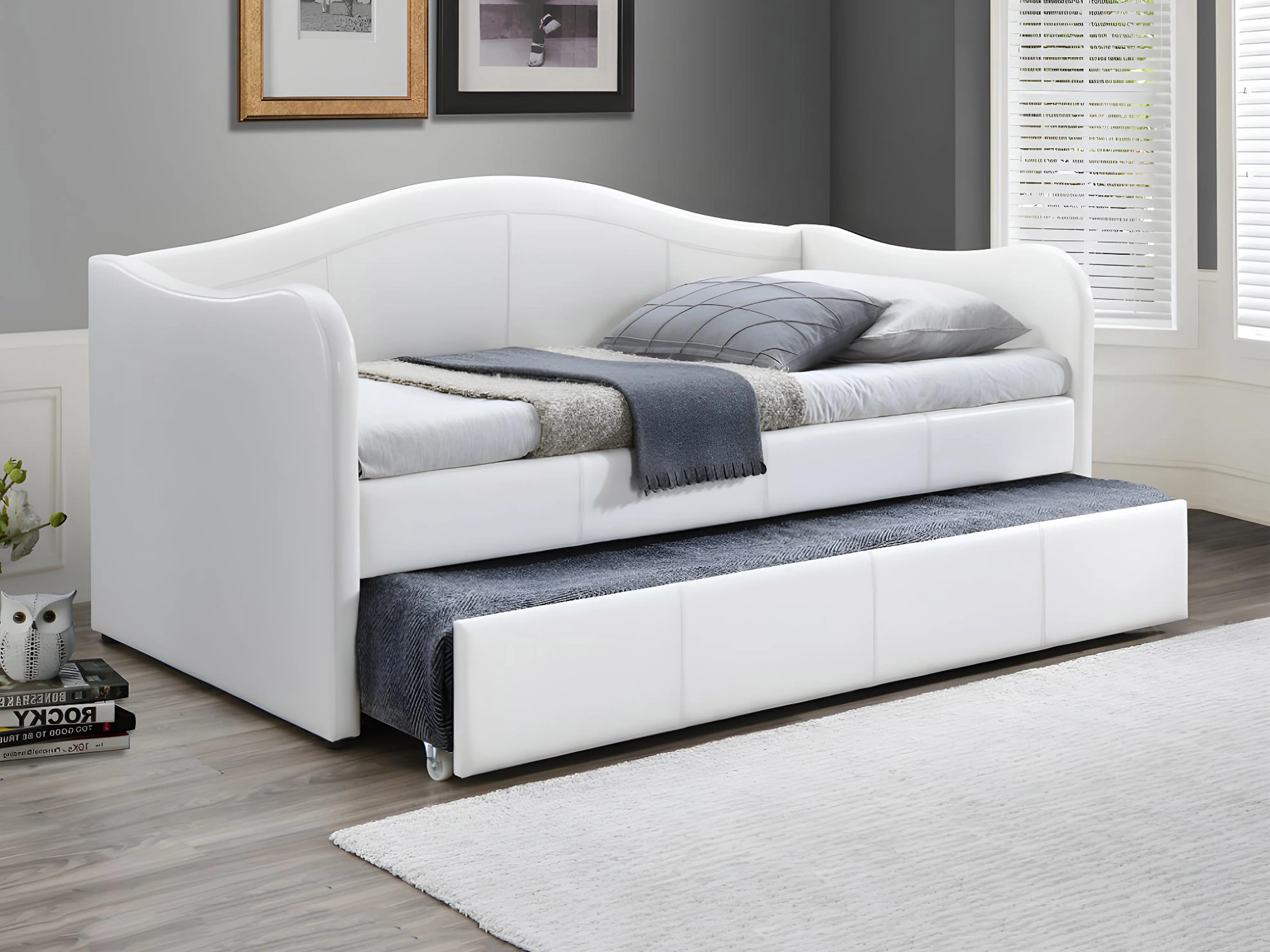 Wysuwane łóżko MATHILDE – 2 × 90 × 190 cm – ekoskóra – kolor biały, materac w zestawie