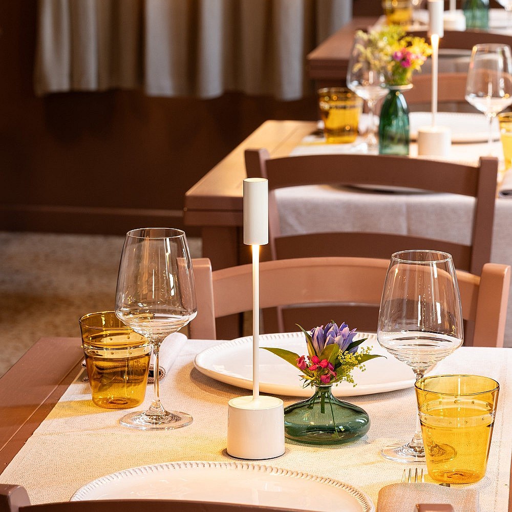 Zafferano Carolina - Lampa stołowa LED z akumulatorem, dotykowa ściemniana, 9h pracy, biały połysk, indoor/outdoor