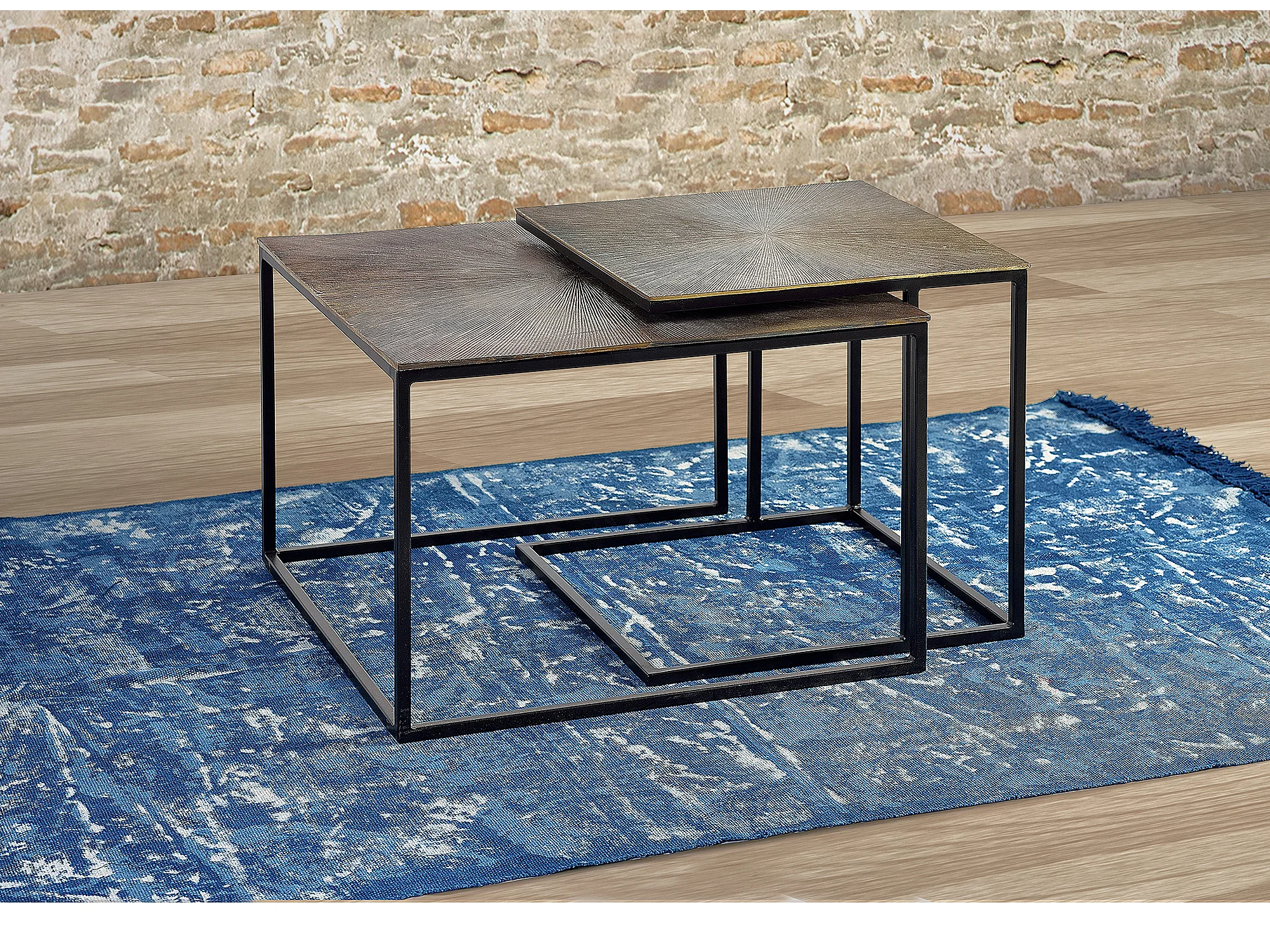 Komplet dwóch stolików z podstawami, brązem i metalowymi nogami.