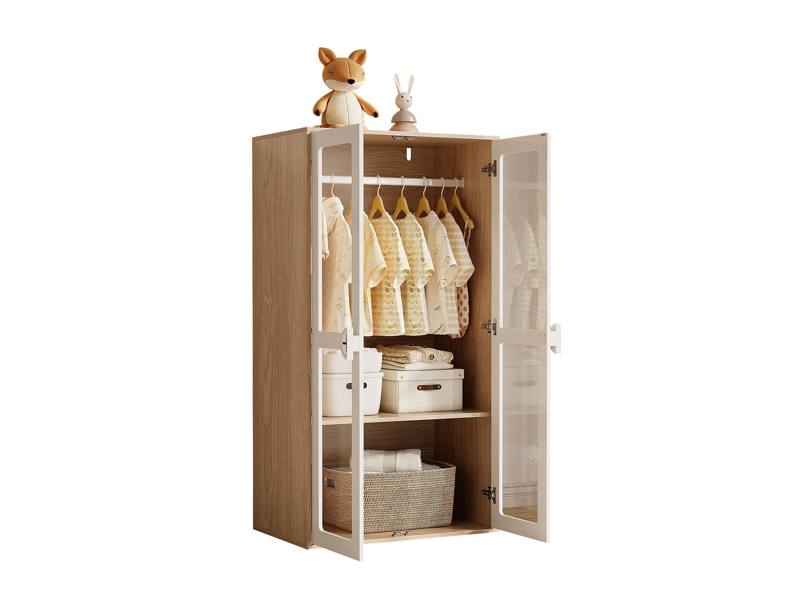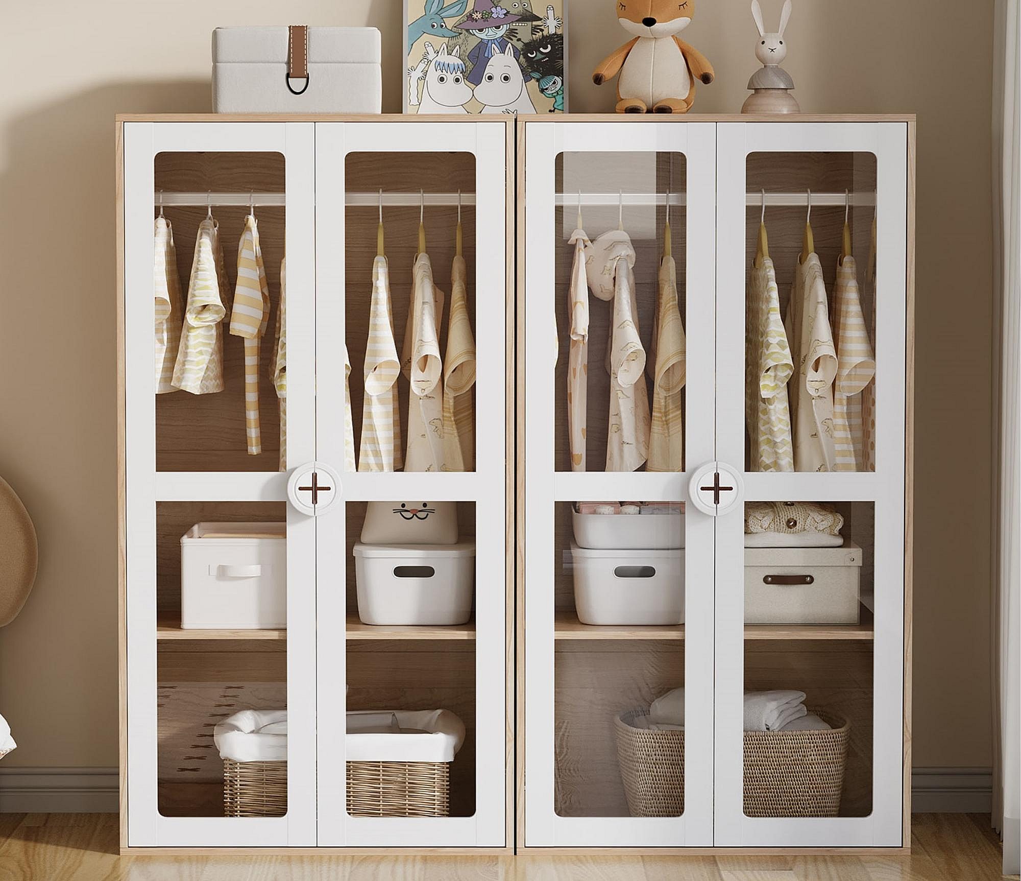 Zestaw 2 szaf dziecięcych 160x50x150 cm - 4 szklane drzwi - z wieszakami na ubrania - regulowane półki - biały + naturalny