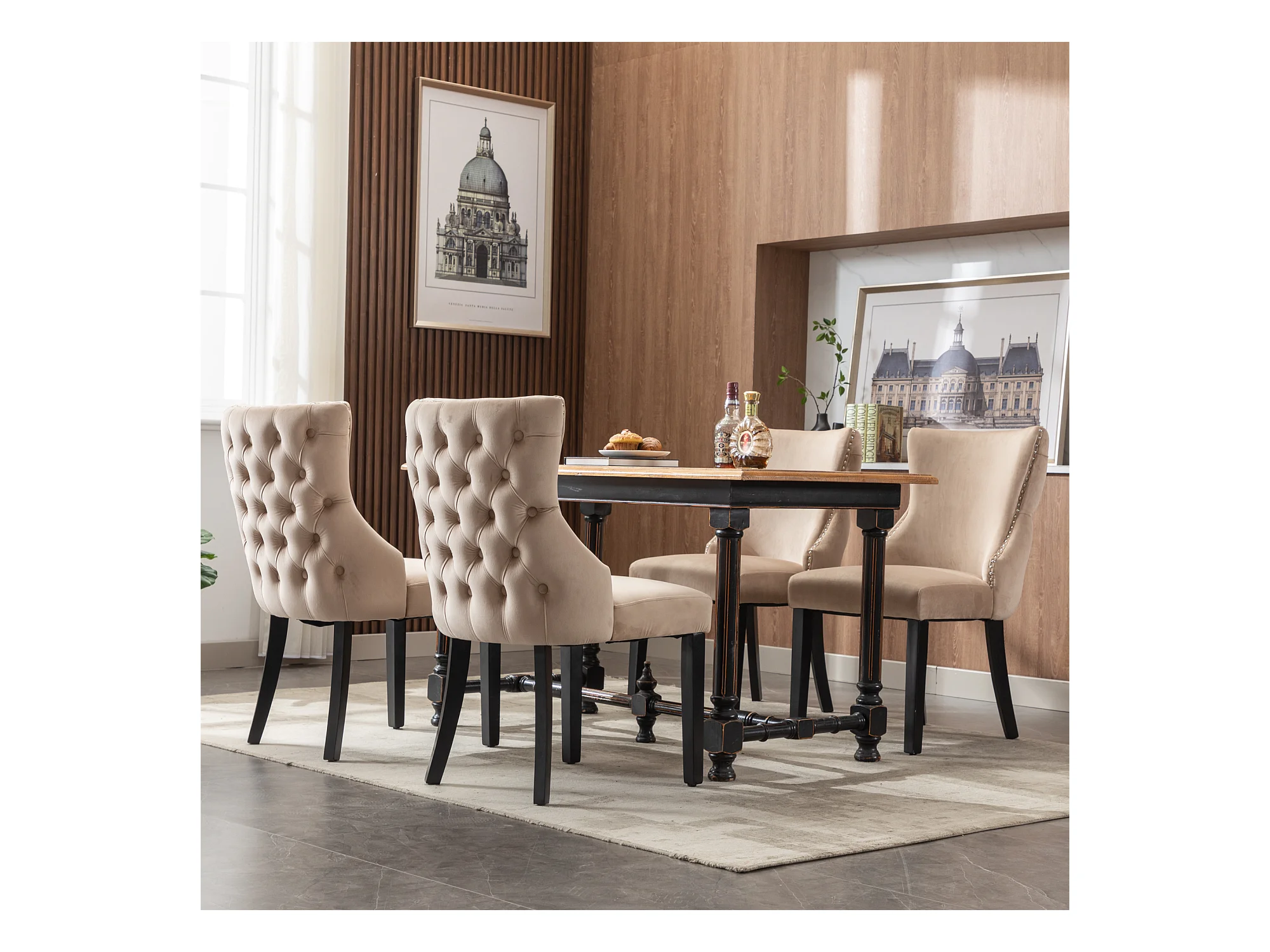 Zestaw 4 krzeseł do jadalni - jasnobeżowy aksamit - oparcie tapicerowane - dekoracja guzikami - nogi drewniane