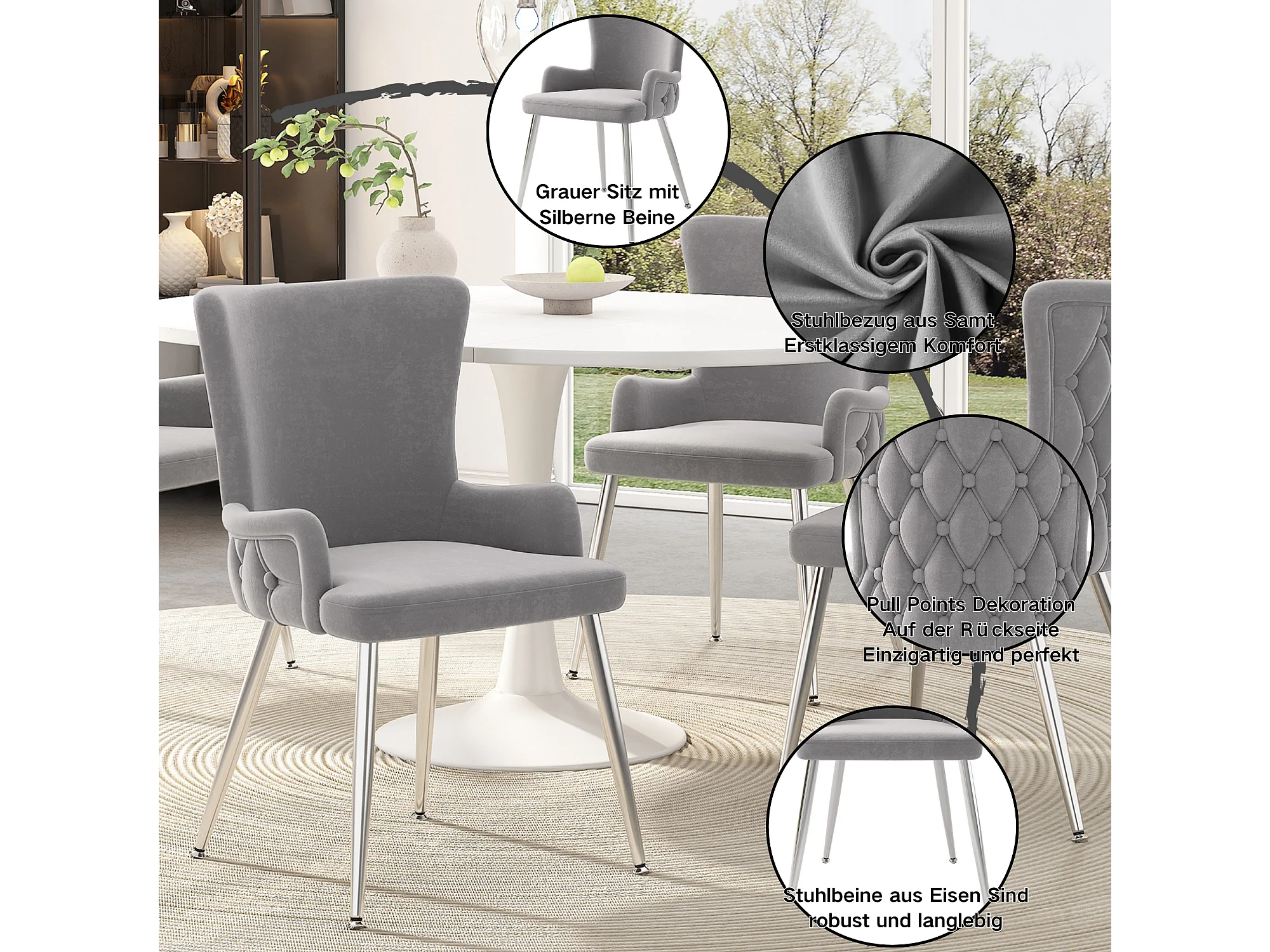 Zestaw 4 luksusowych krzeseł welurowych - 85 x 47 x 49 cm - z czterema srebrnymi metalowymi nogami - szary