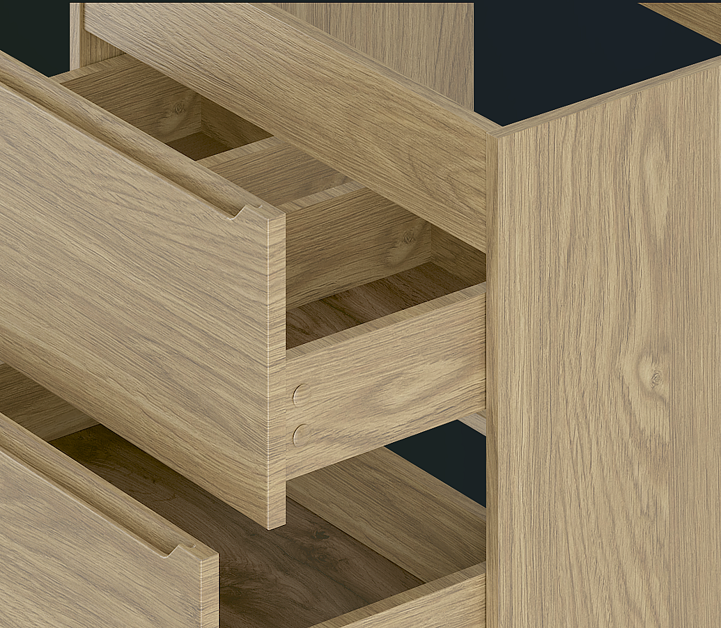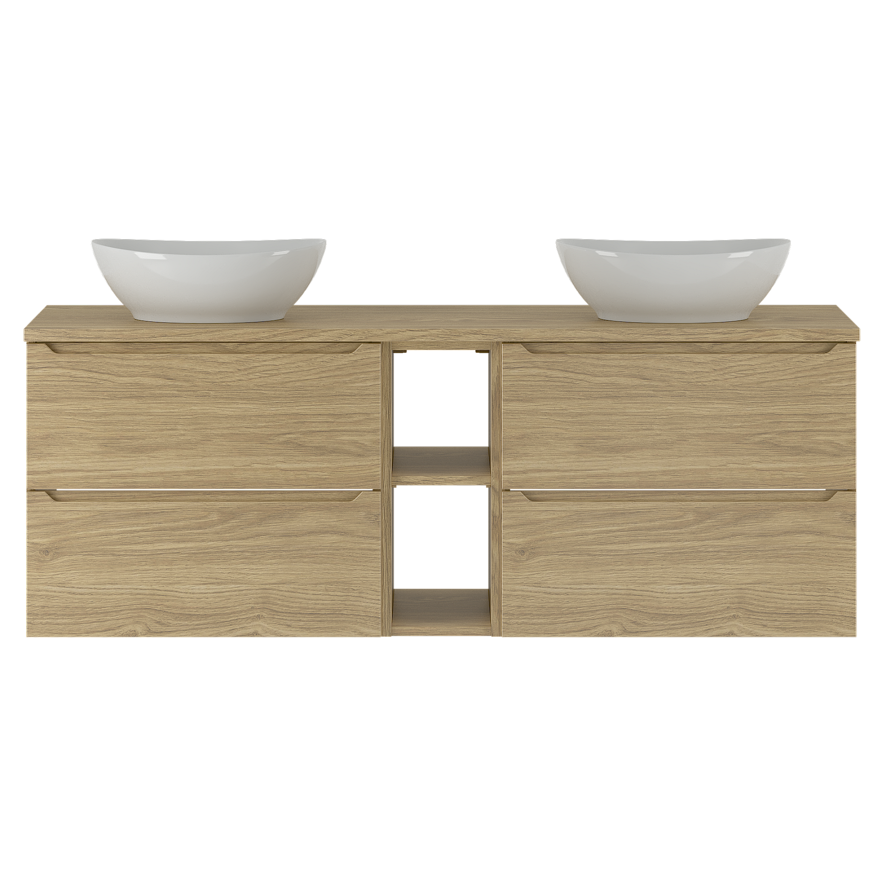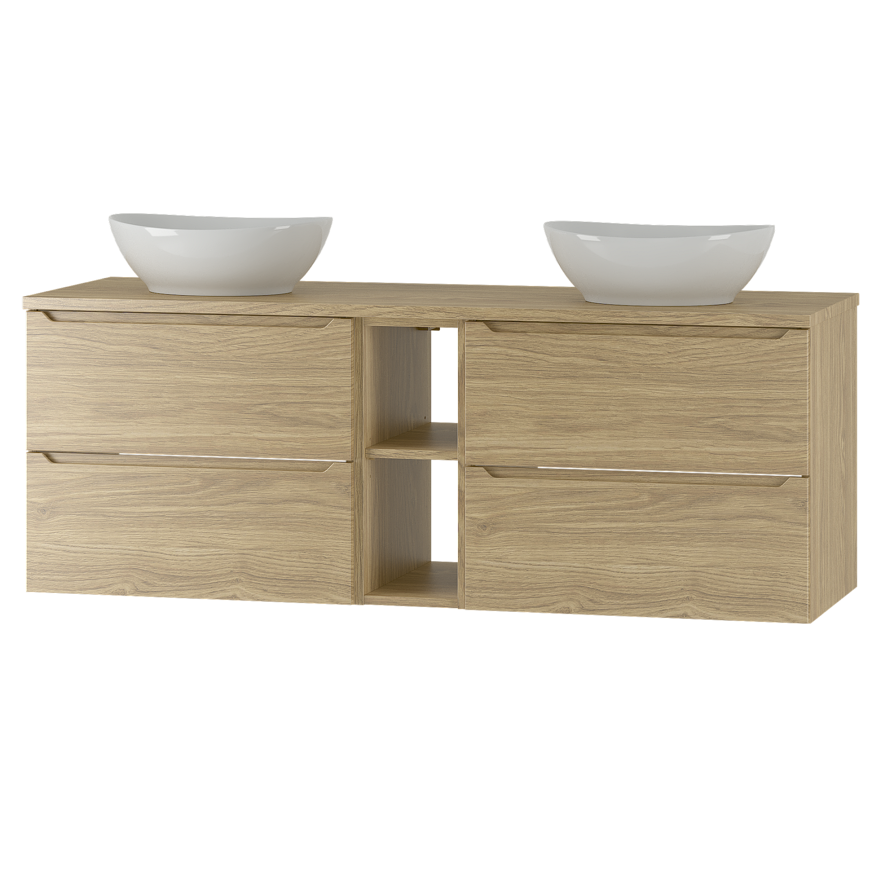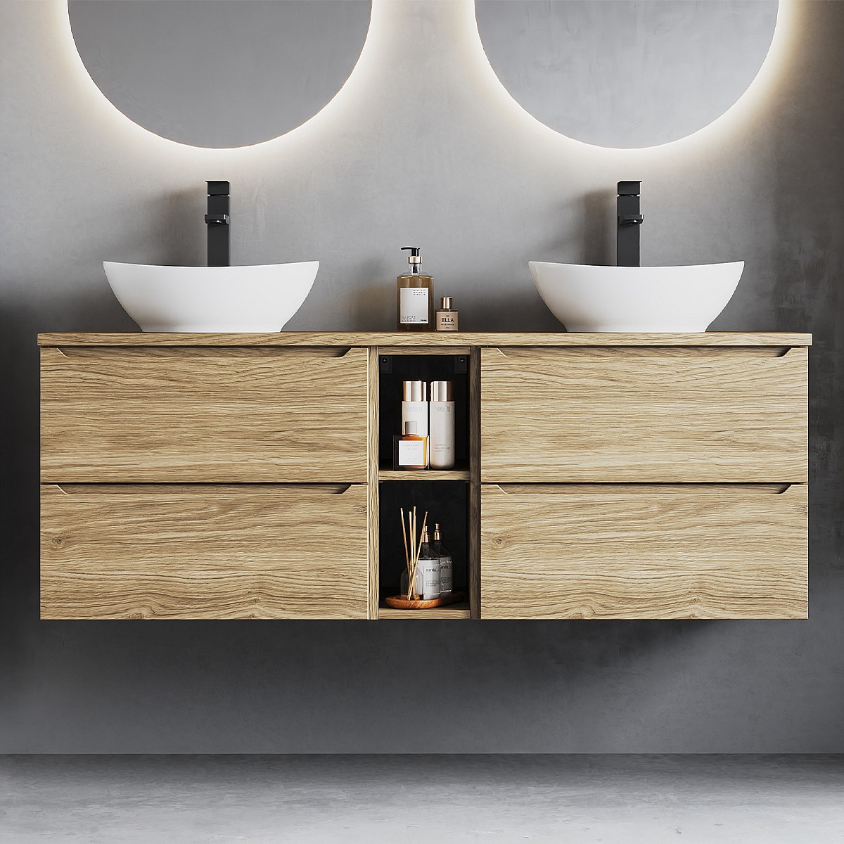 Szafka łazienkowa wisząca ryflowana z wnękami i dwoma okrągłymi umywalkami nablatowymi - Naturalny jasny - szer. 140 cm - ZEVARA