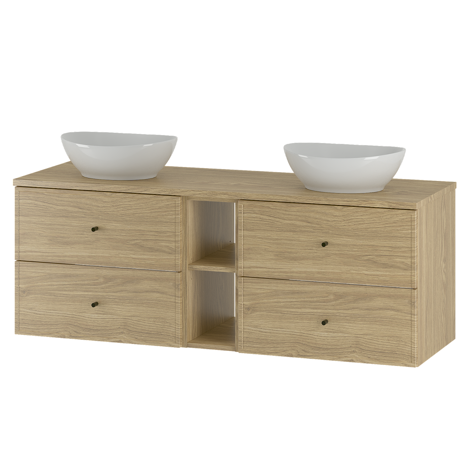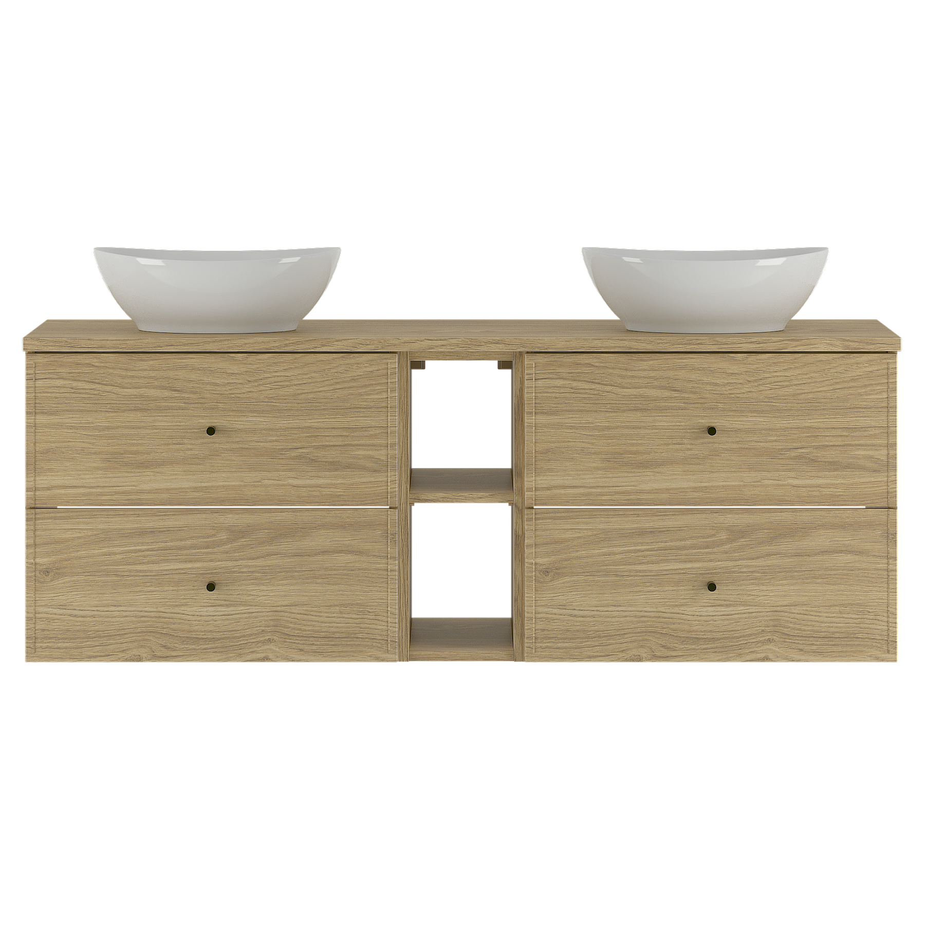 Szafka łazienkowa wisząca ryflowana z wnękami i dwoma okrągłymi umywalkami nablatowymi - Naturalny jasny - szer. 140 cm - ZEVARA