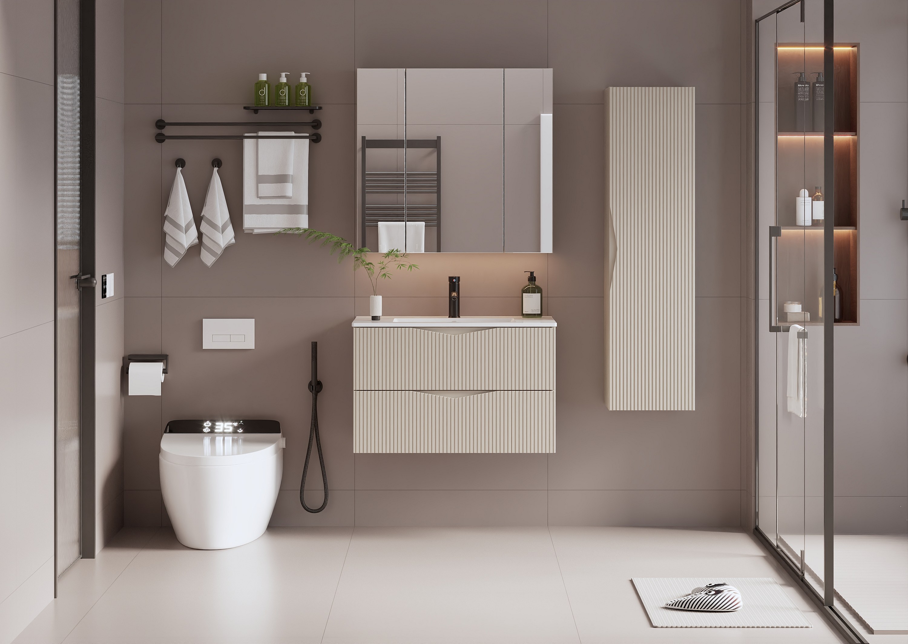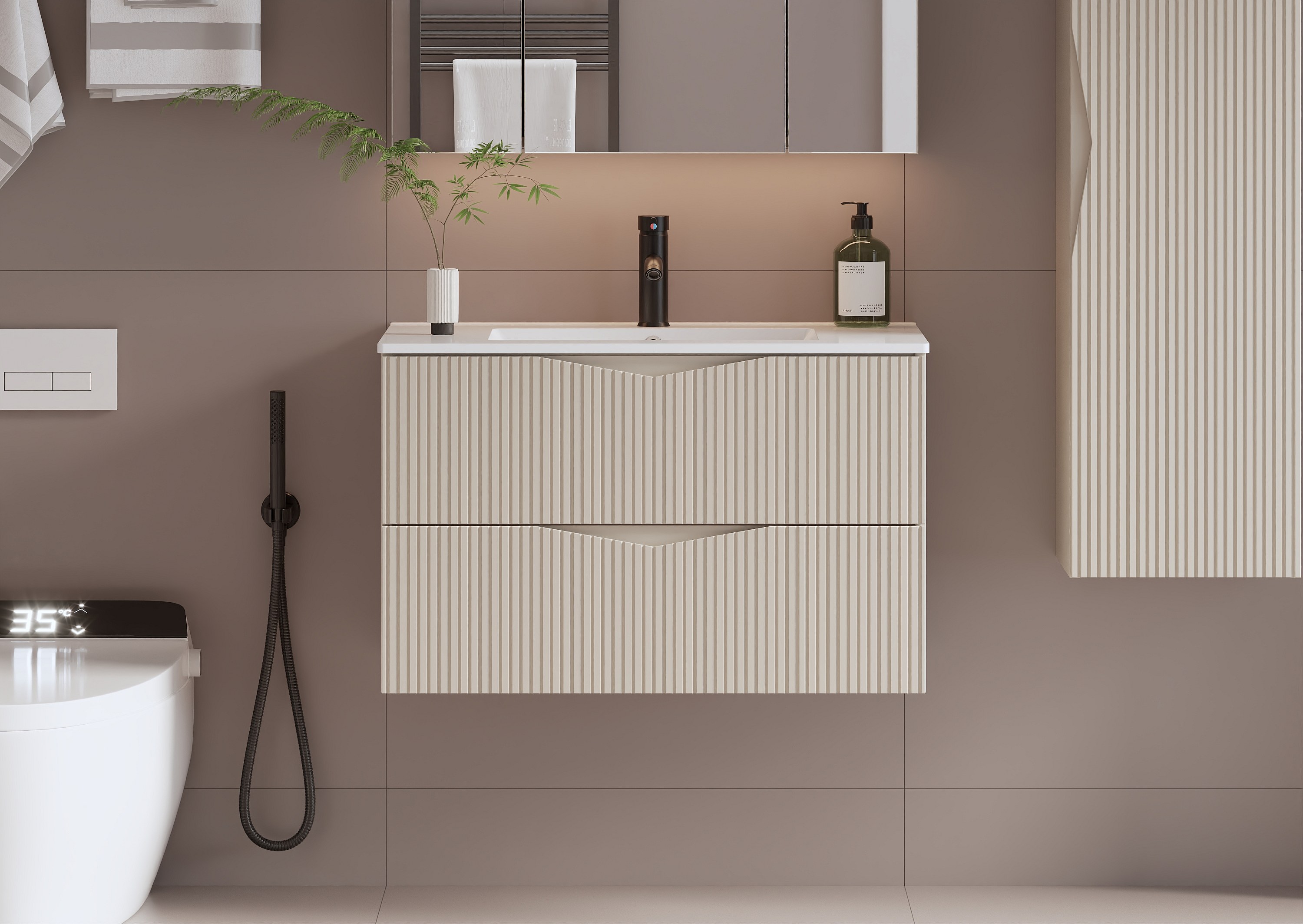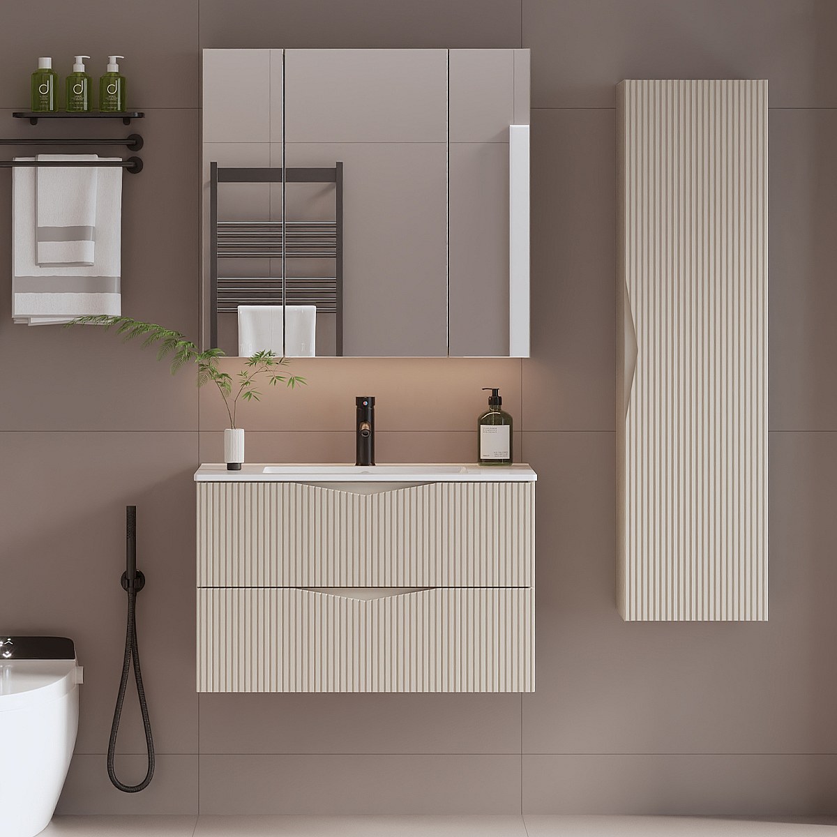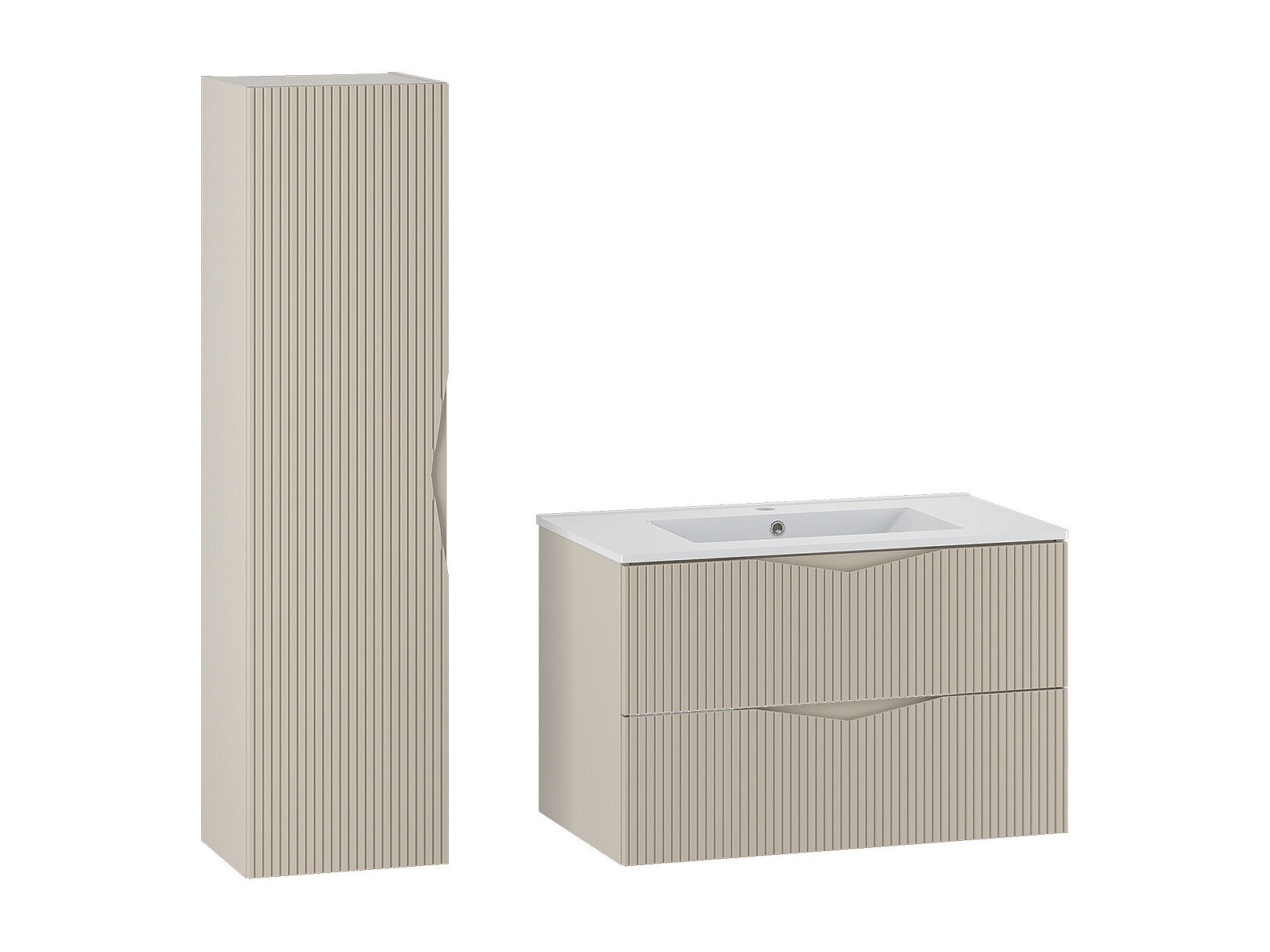 Zestaw do Łazienki 80cm Szafka z Umywalką Słupek Ryflowane Fronty Beż Piaskowy Cleo