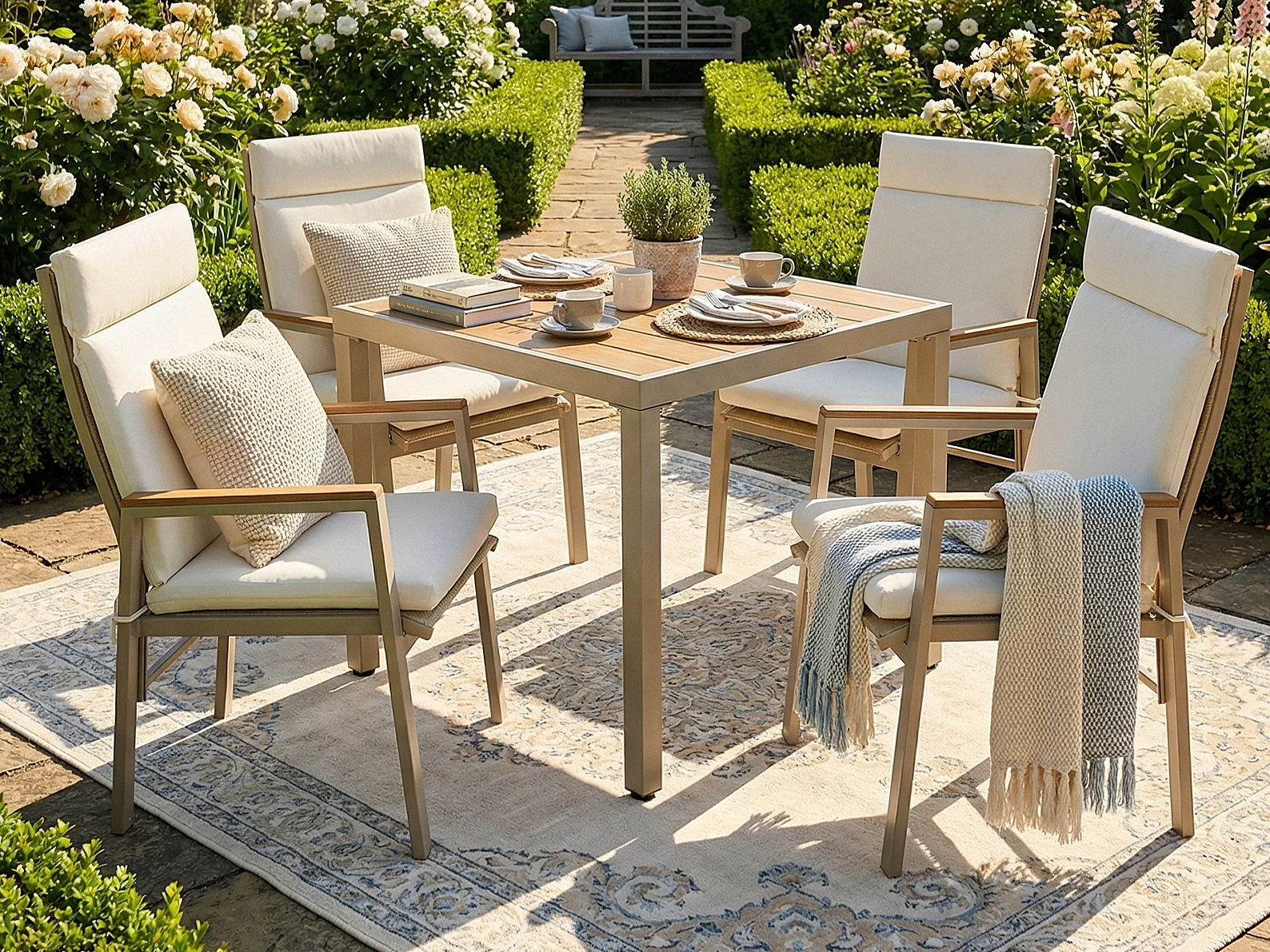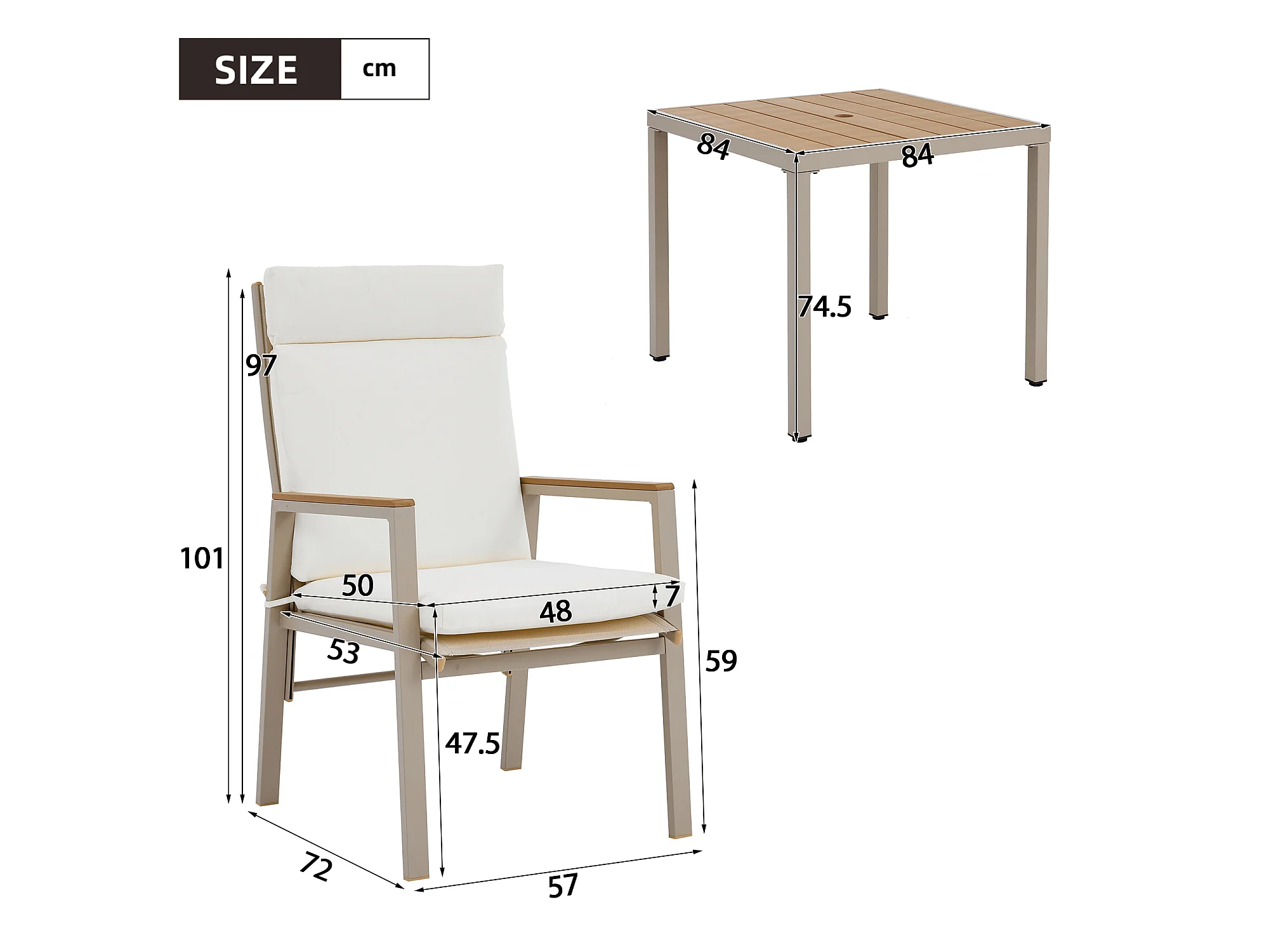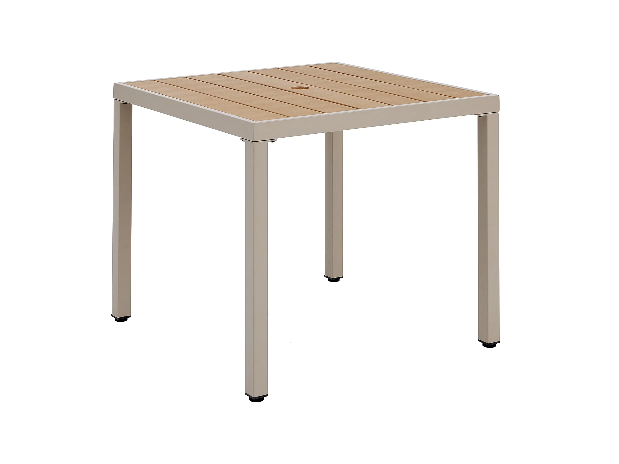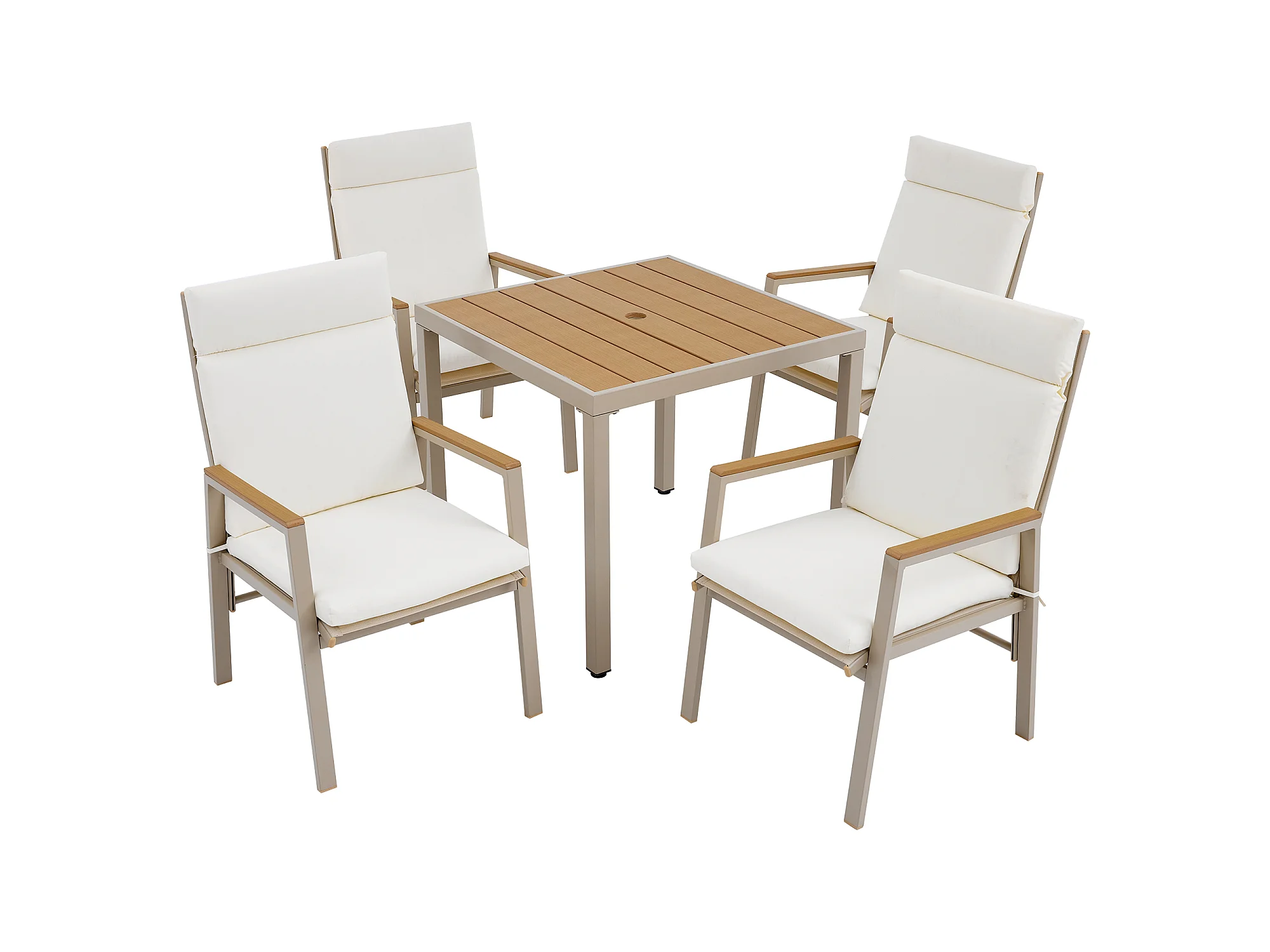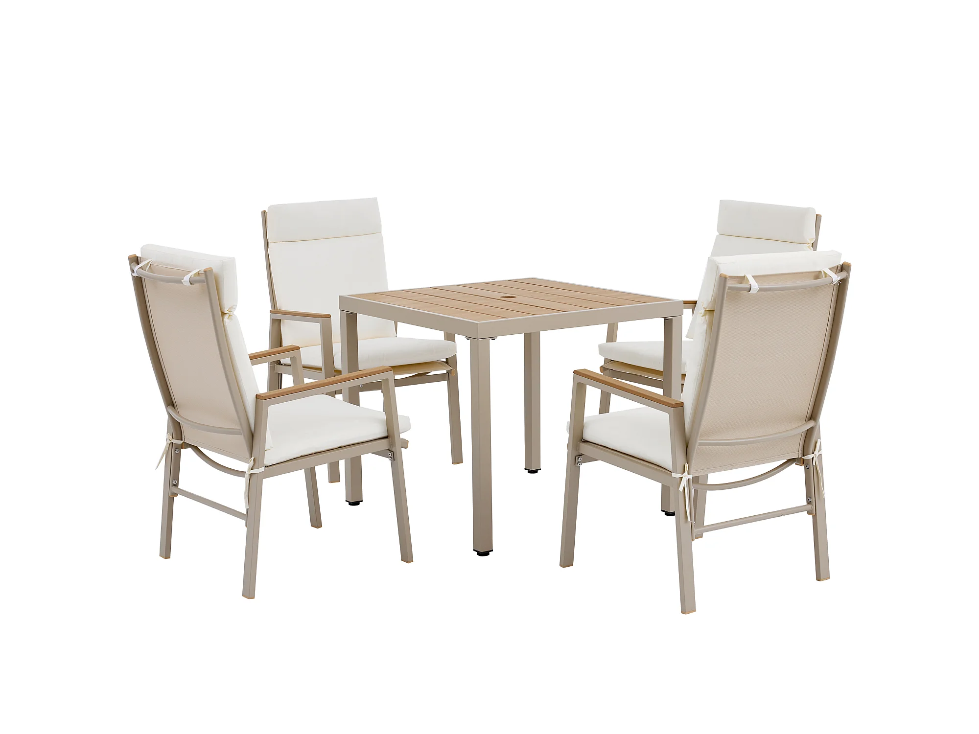 Zestaw jadalniany do ogrodu dla 4 osób - 1 stół i 4 krzesła - Stal ocynkowana, blat kompozytowy drewno-plastik - Khaki i beżowy
