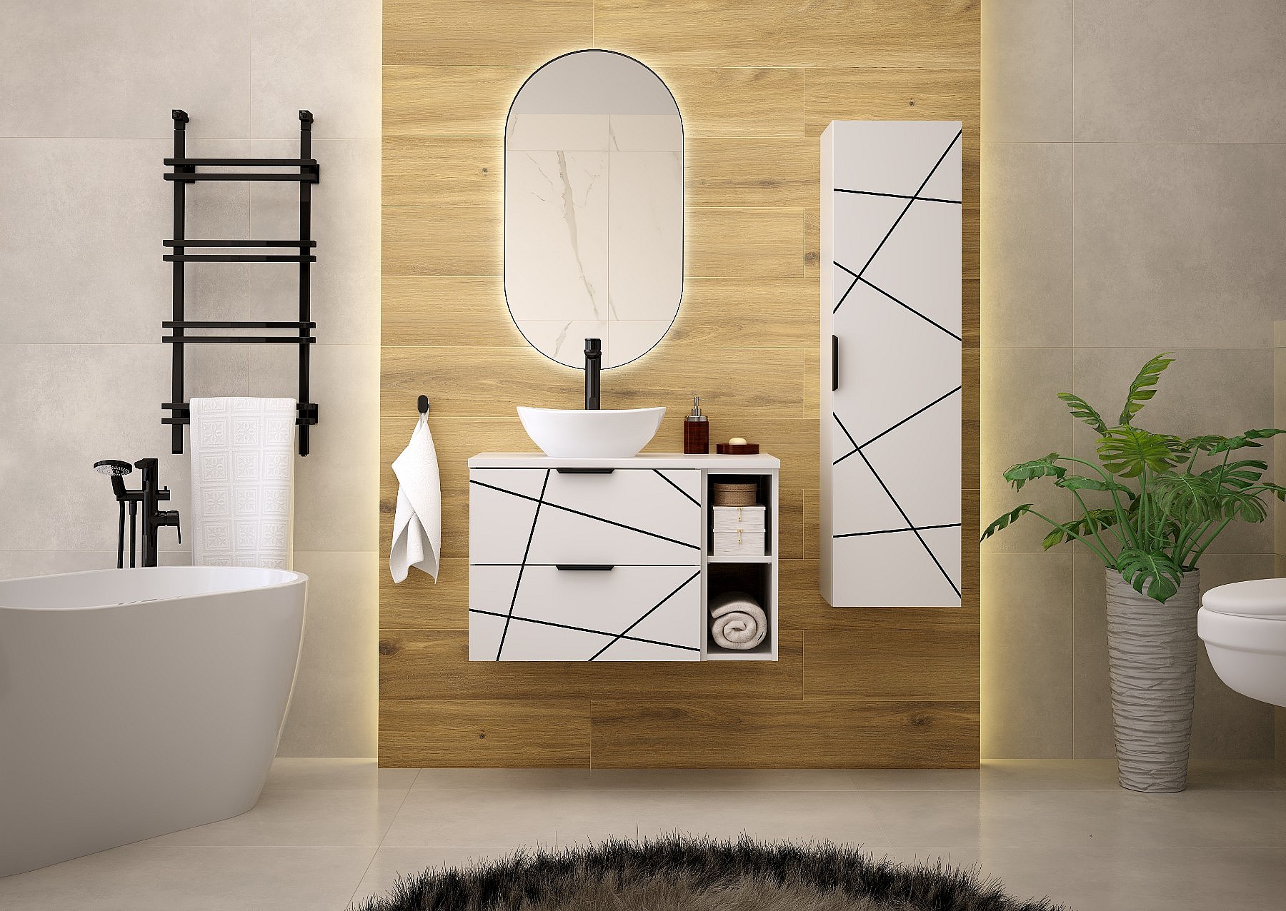 Biały Zestaw do Łazienki 80cm Szafka Regał Blat Umywalka Słupek Marco