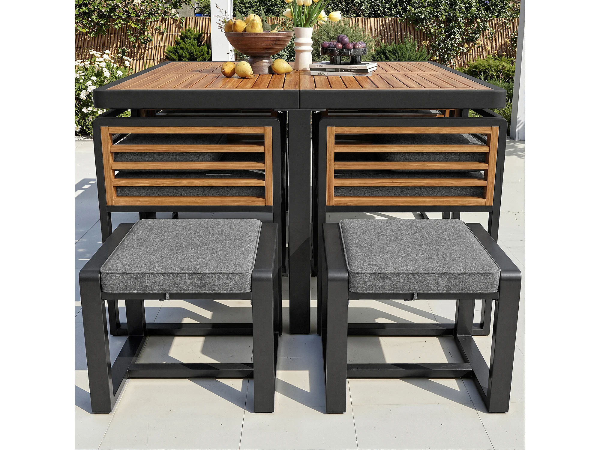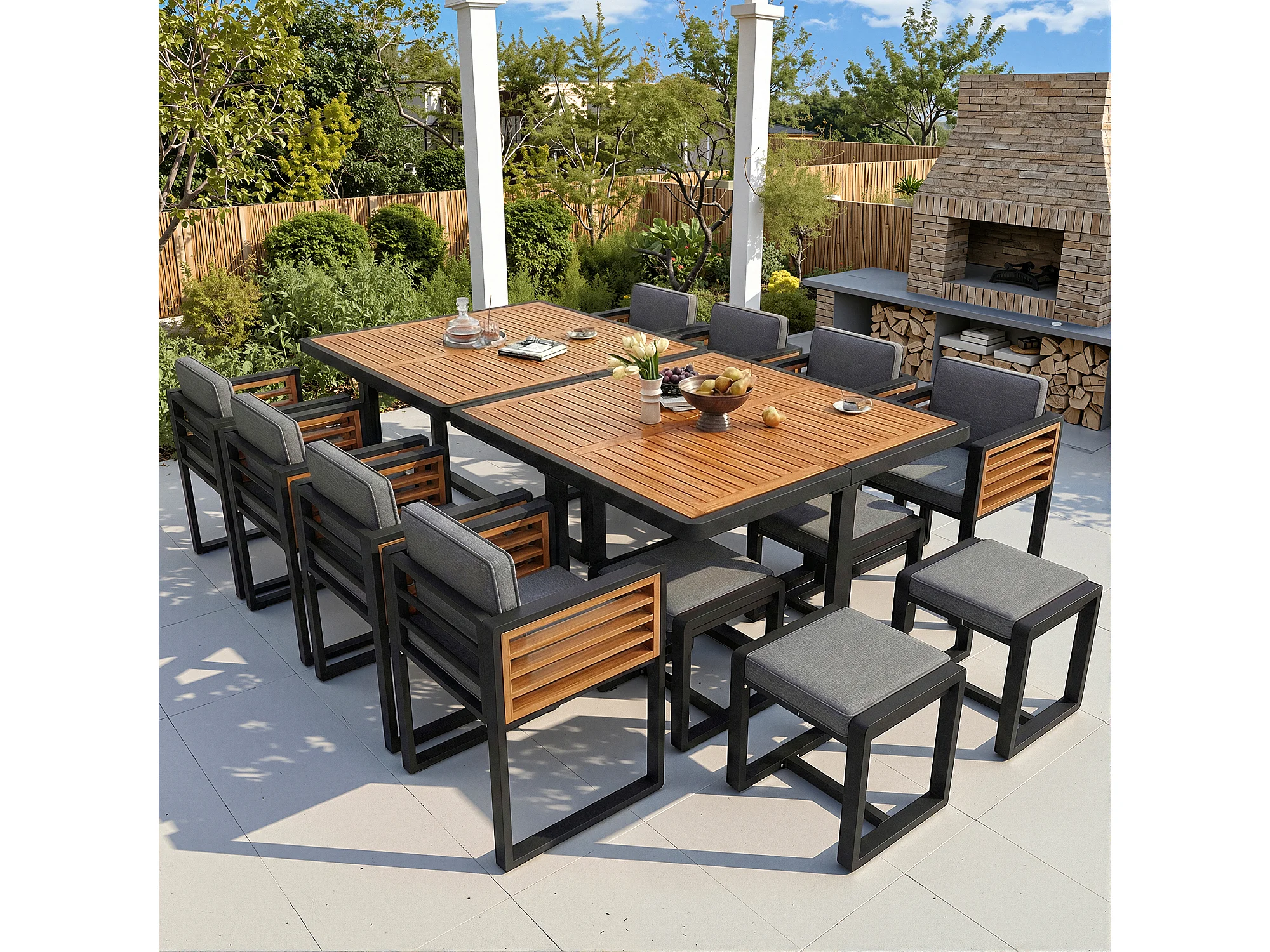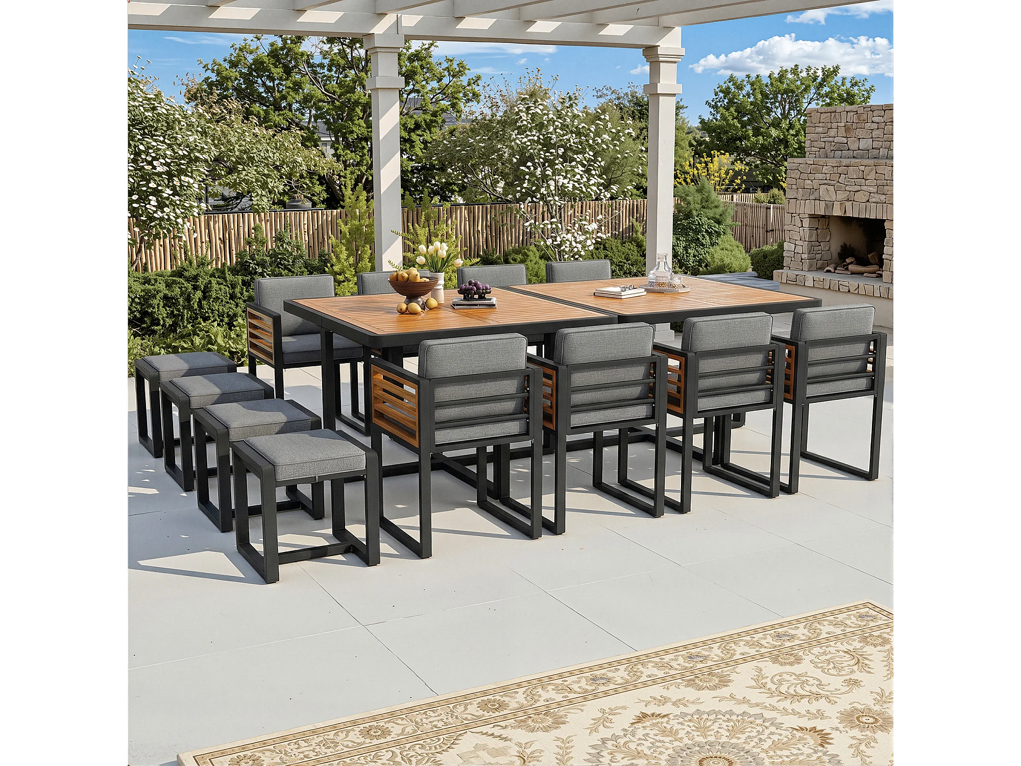 Zestaw mebli ogrodowych 12-osobowy - 8 krzeseł + 4 stołki + 2 stoły - blat z litego drewna - drewno + metal - szary