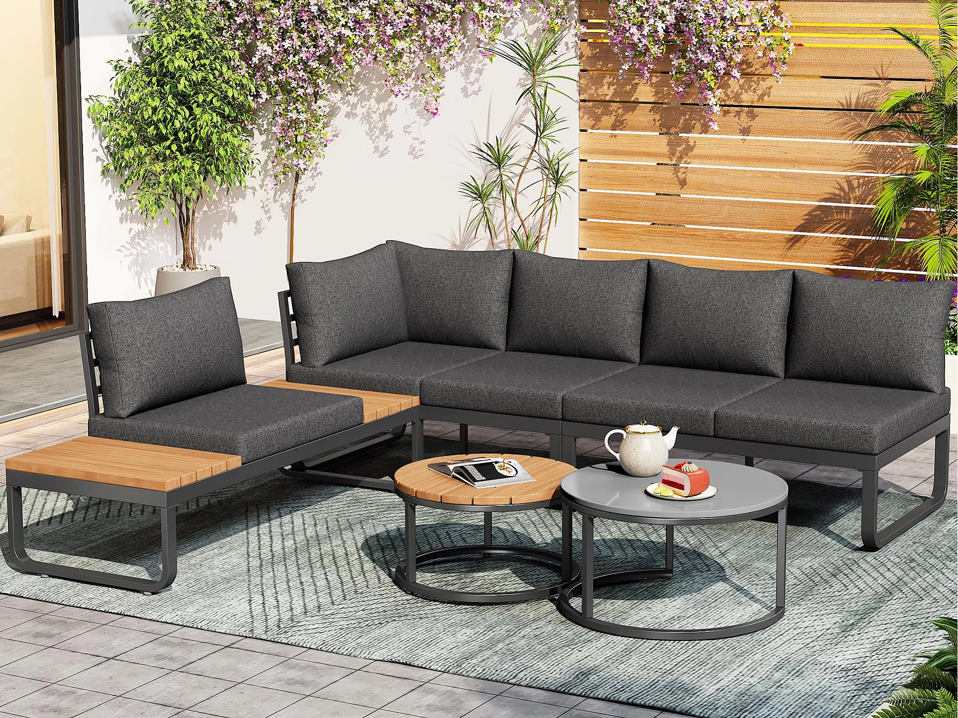 Zestaw mebli ogrodowych - 4 miejsca - z ocynkowanej stali - narożna sofa - 2 stoliki kawowe - z poduszkami i regulowanymi nogami - Szary