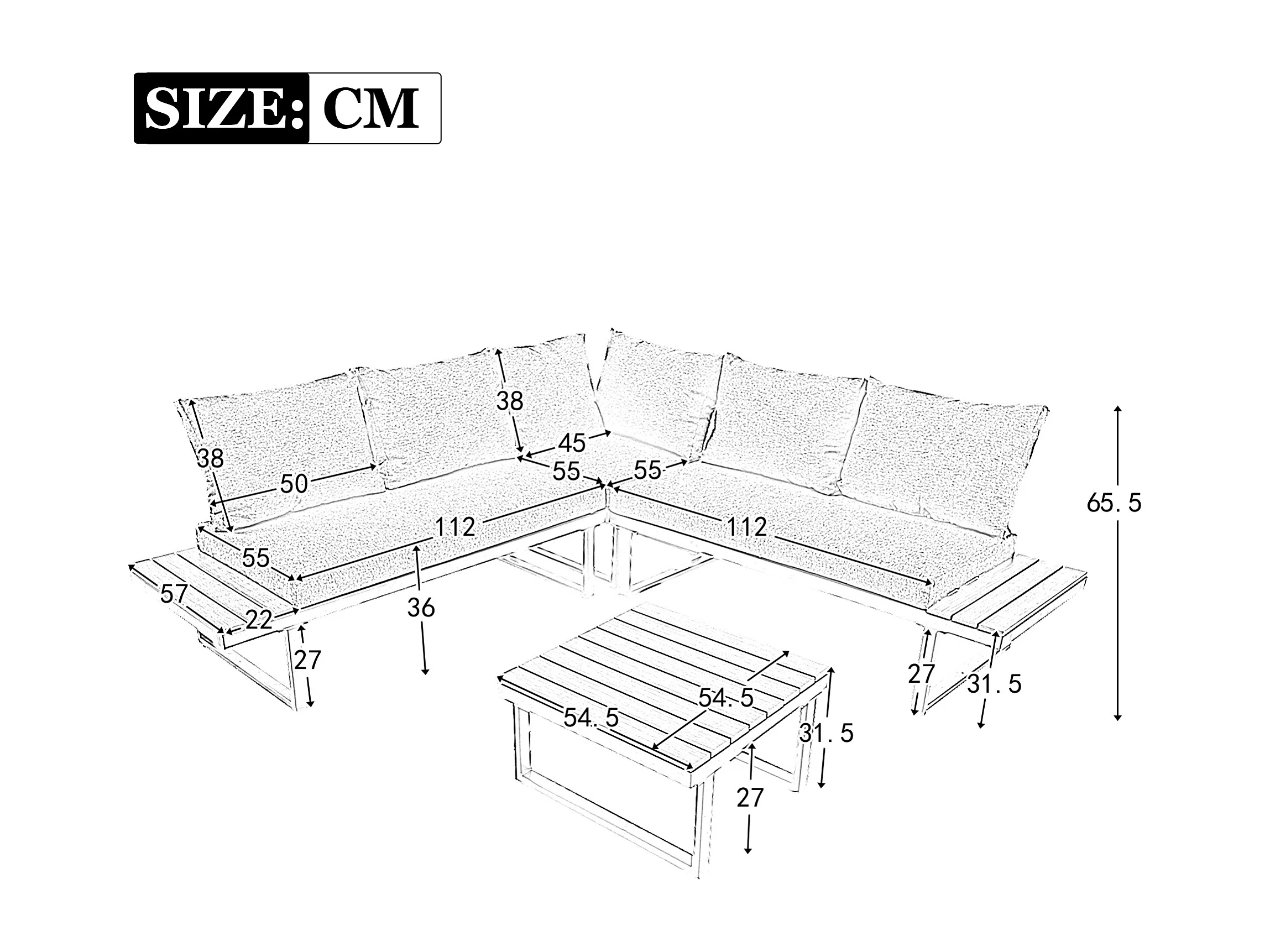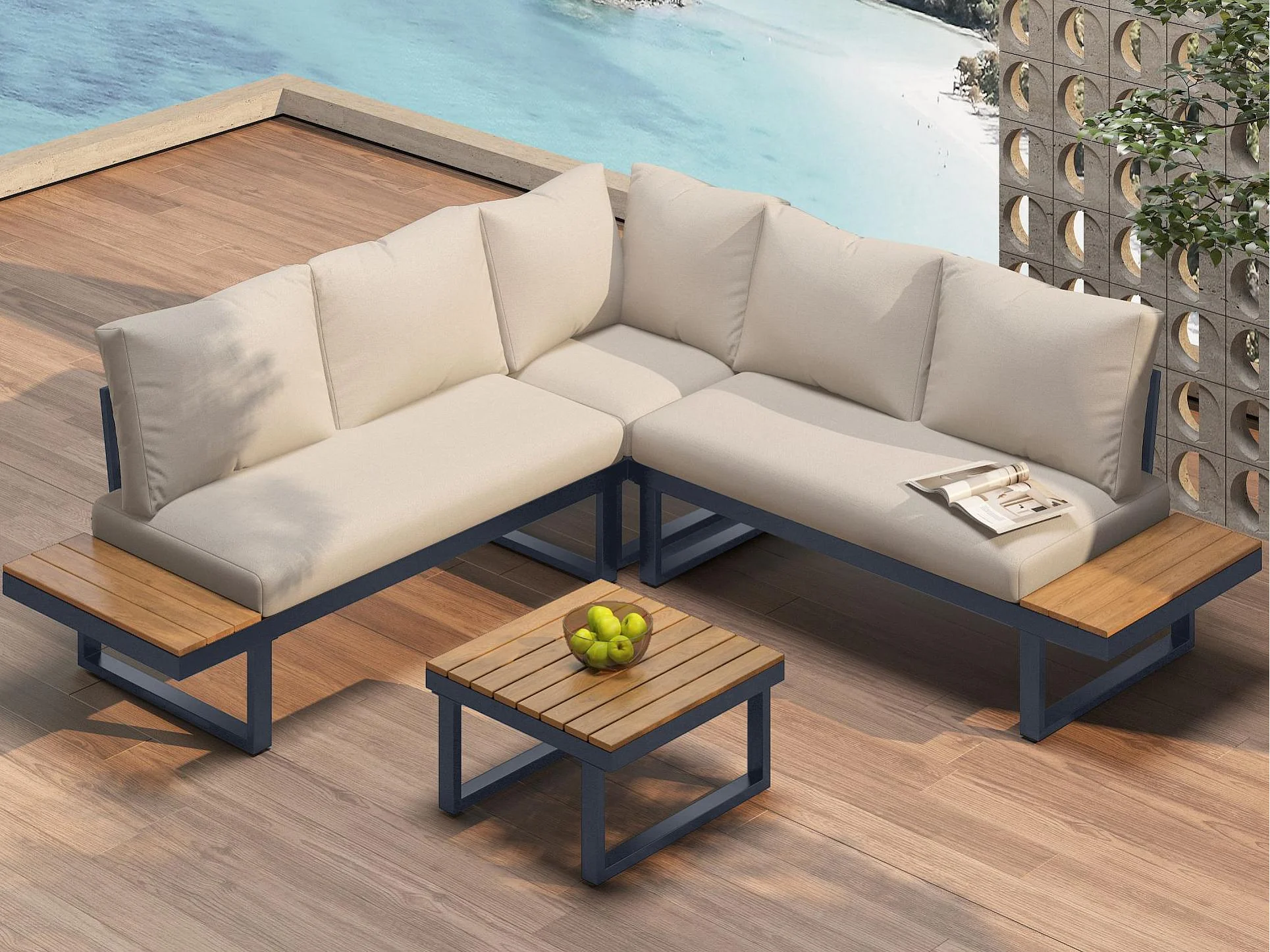 Wielofunkcyjny zestaw mebli ogrodowych ze stali ocynkowanej i dekorowany drewnem akacjowym - 4 miejsca - narożna sofa i 1 stolik kawowy - Beżowy