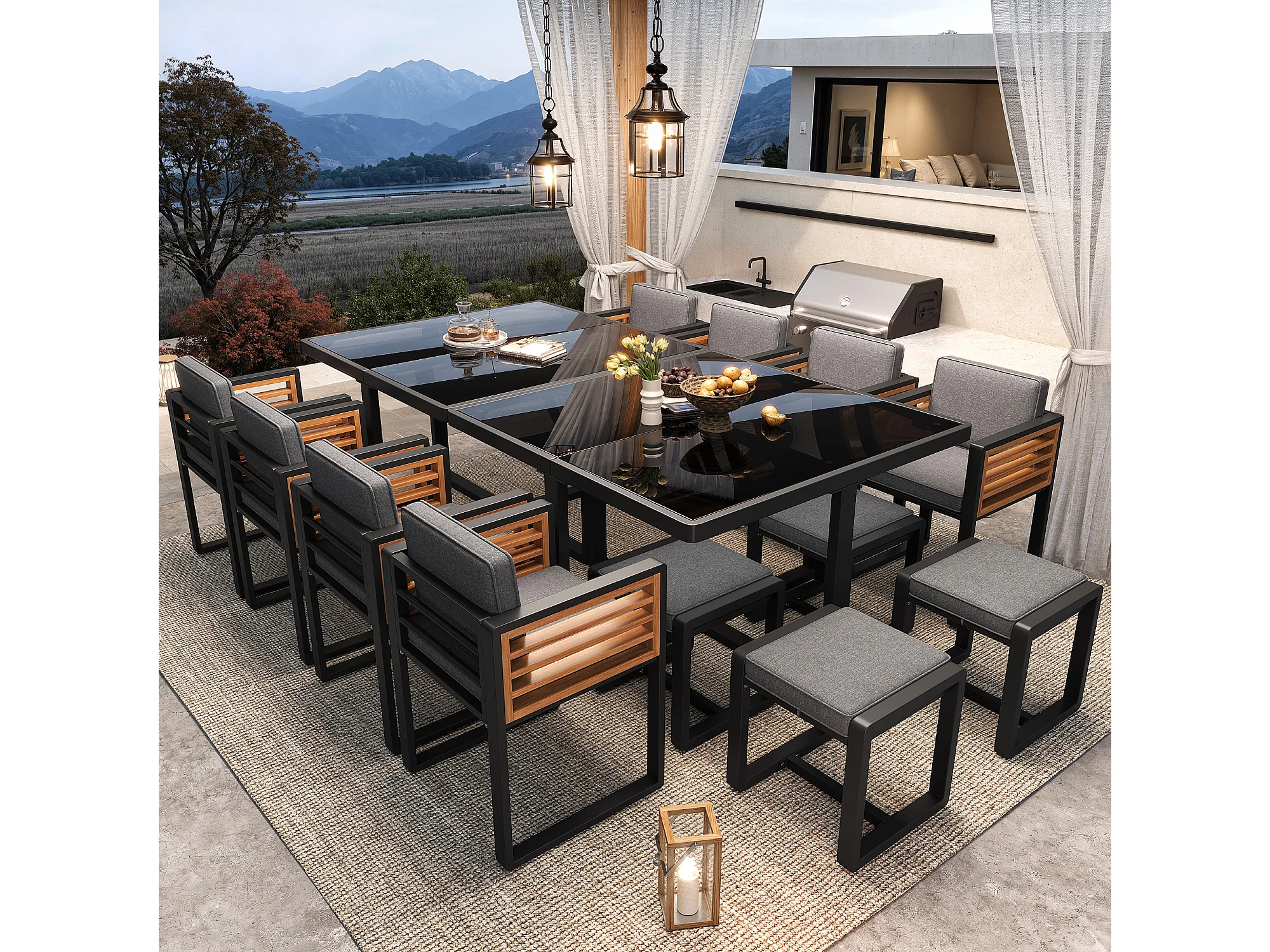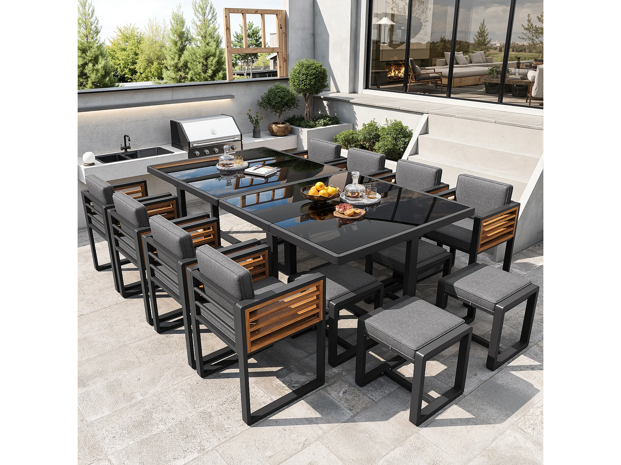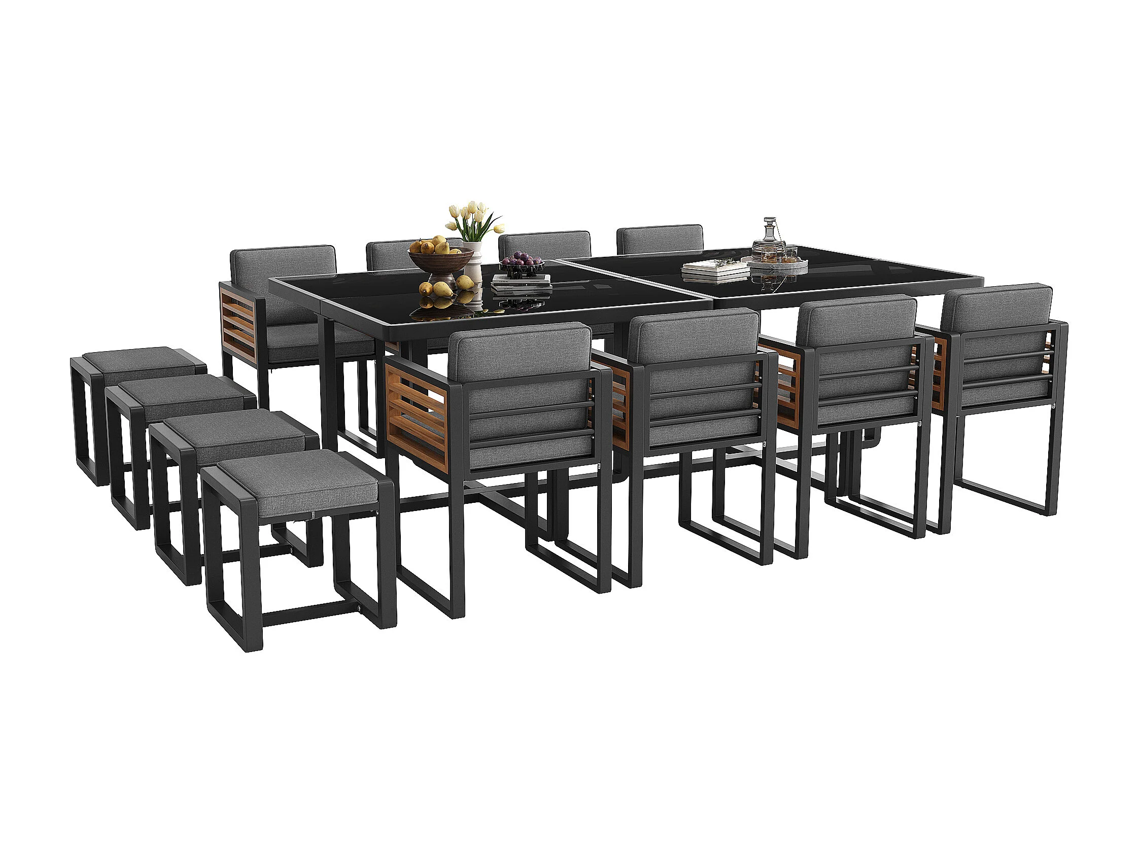 Zestaw mebli ogrodowych 6-osobowy - 8 krzeseł + 4 stołki + 2 stoły - blat szklany - szkło + metal - szary