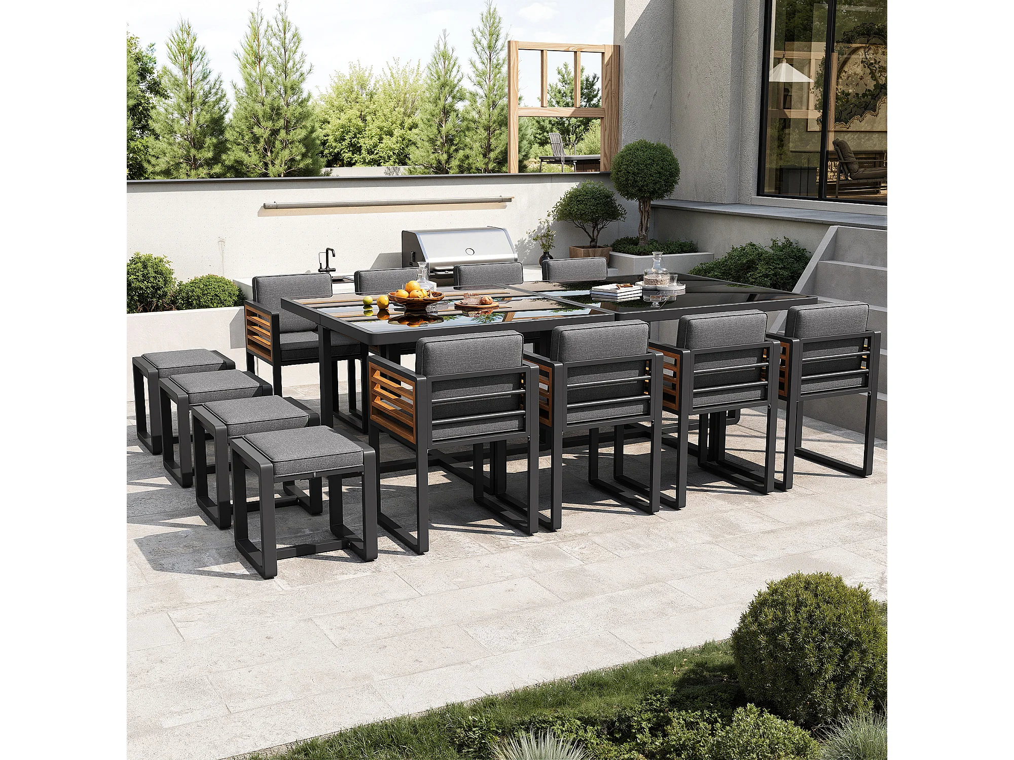 Zestaw mebli ogrodowych 6-7-osobowy - zestaw wypoczynkowy ze stołem + poduszki na siedzisko i oparcie - metalowy - szary