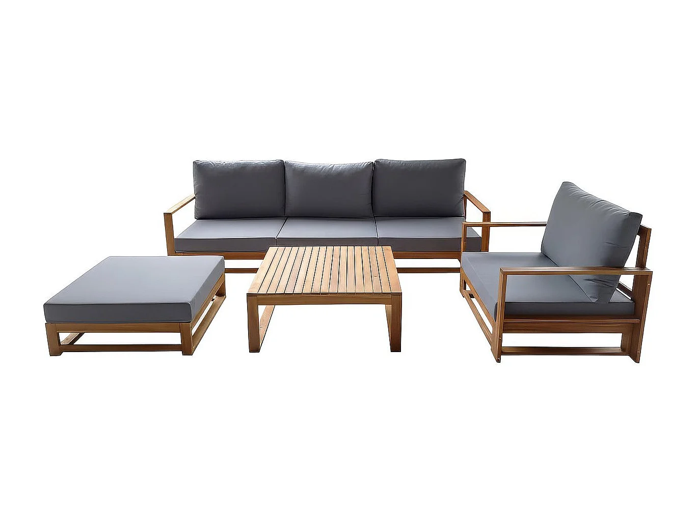 Zestaw mebli ogrodowych Bellingham na 5 osób z szarego drewna akacjowego z grubymi poduszkami i wielofunkcyjnym podnóżkiem