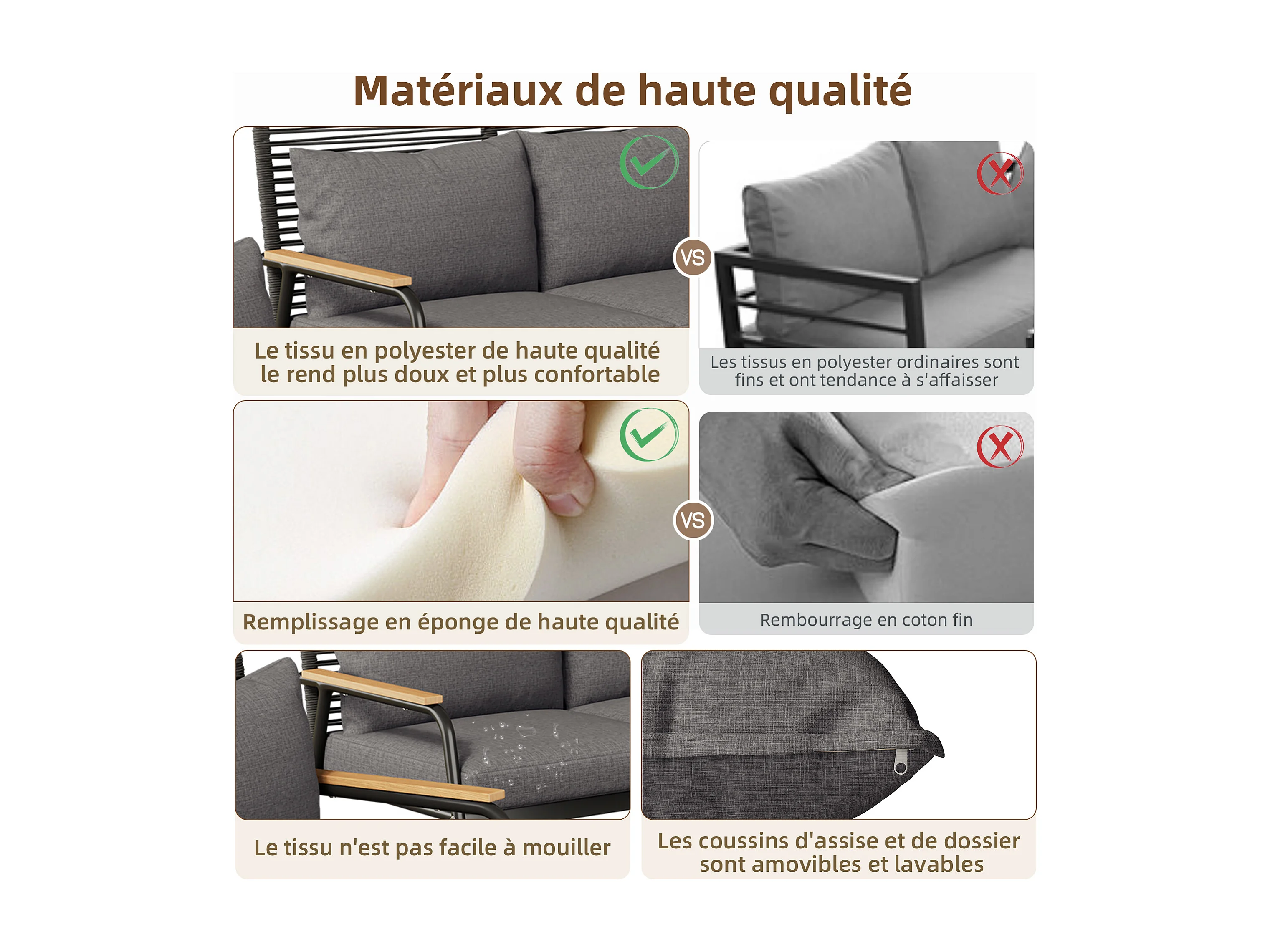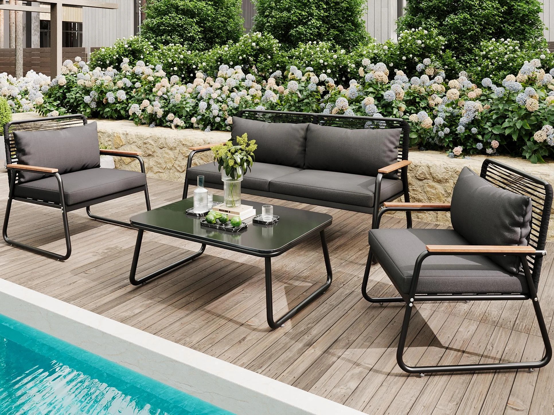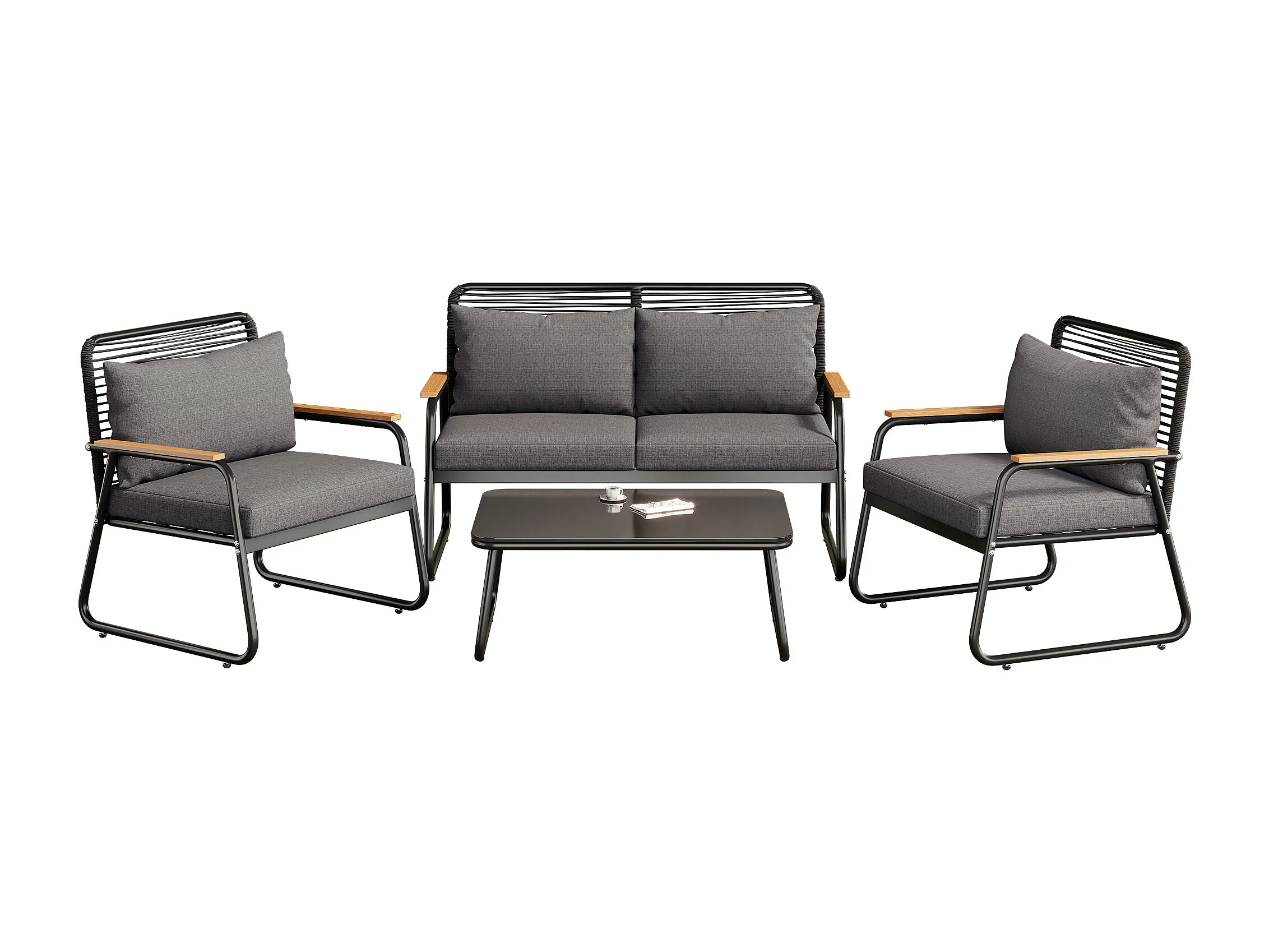 Zestaw mebli ogrodowych dla 4 osób, konstrukcja z ocynkowanej stali, regulowane nogi, 1 kanapa - 2 fotele i 1 stolik kawowy, czarny