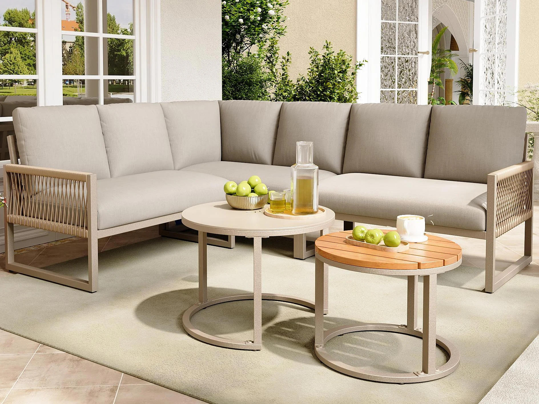 Zestaw mebli ogrodowych dla 6-7 osób, narożna sofa - z galwanizowanej stali, regulowane nogi, 2 stoliki nocne, beżowy