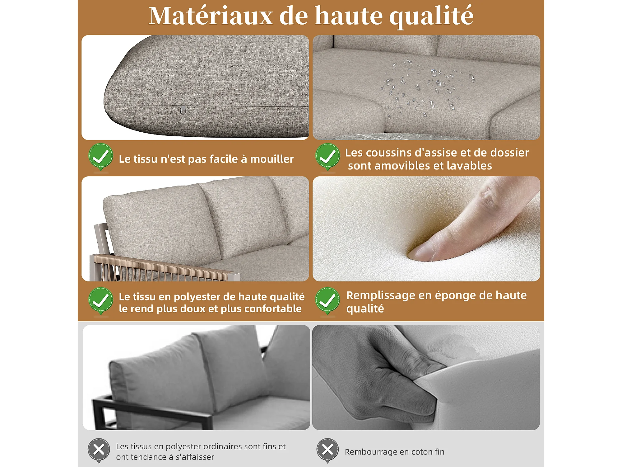 Zestaw mebli ogrodowych dla 4 osób, konstrukcja z ocynkowanej stali, regulowane nogi, 1 kanapa - 2 fotele i 1 stolik kawowy, beżowy