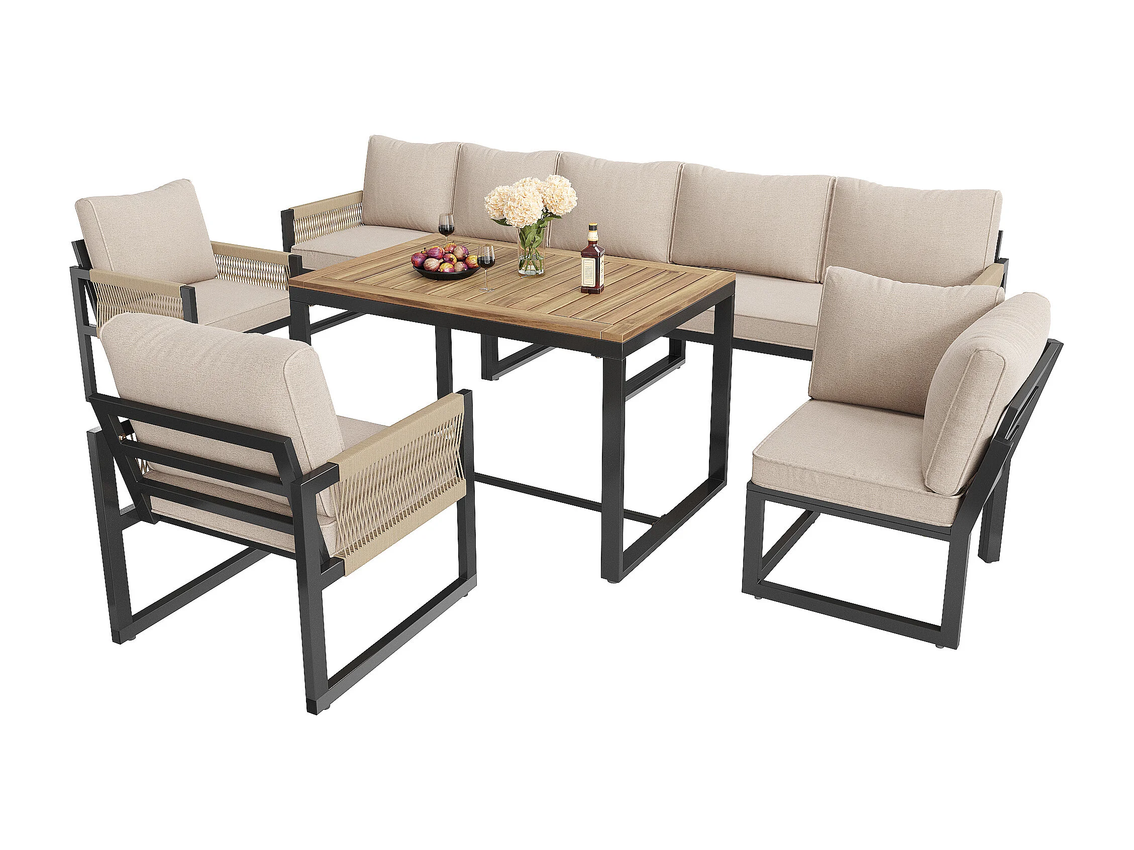 Modułowy zestaw ogrodowy 7-osobowy beżowy z plecionej żywicy z zmywalnymi poduszkami i regulowanym stołem ze szkła hartowanego