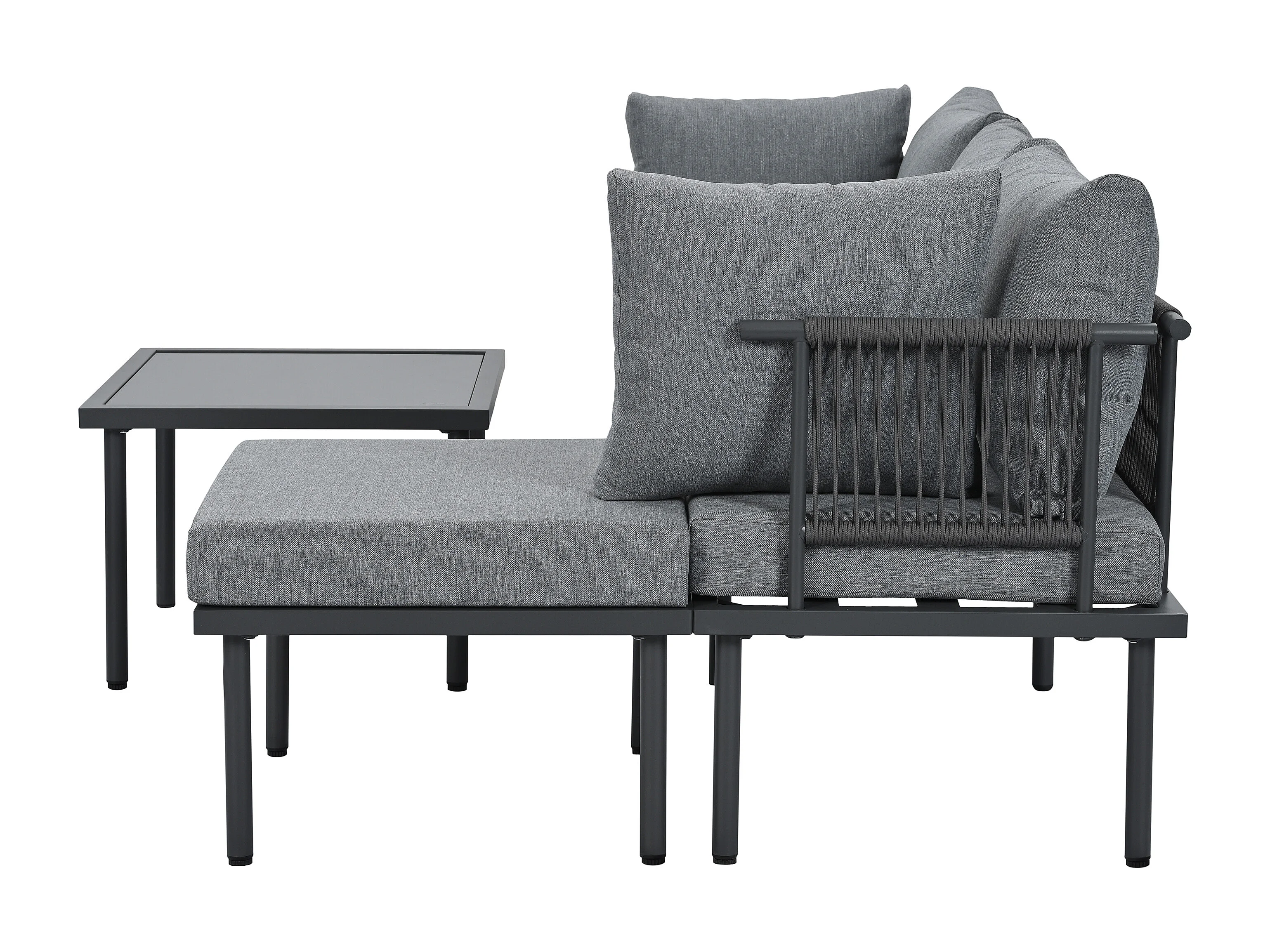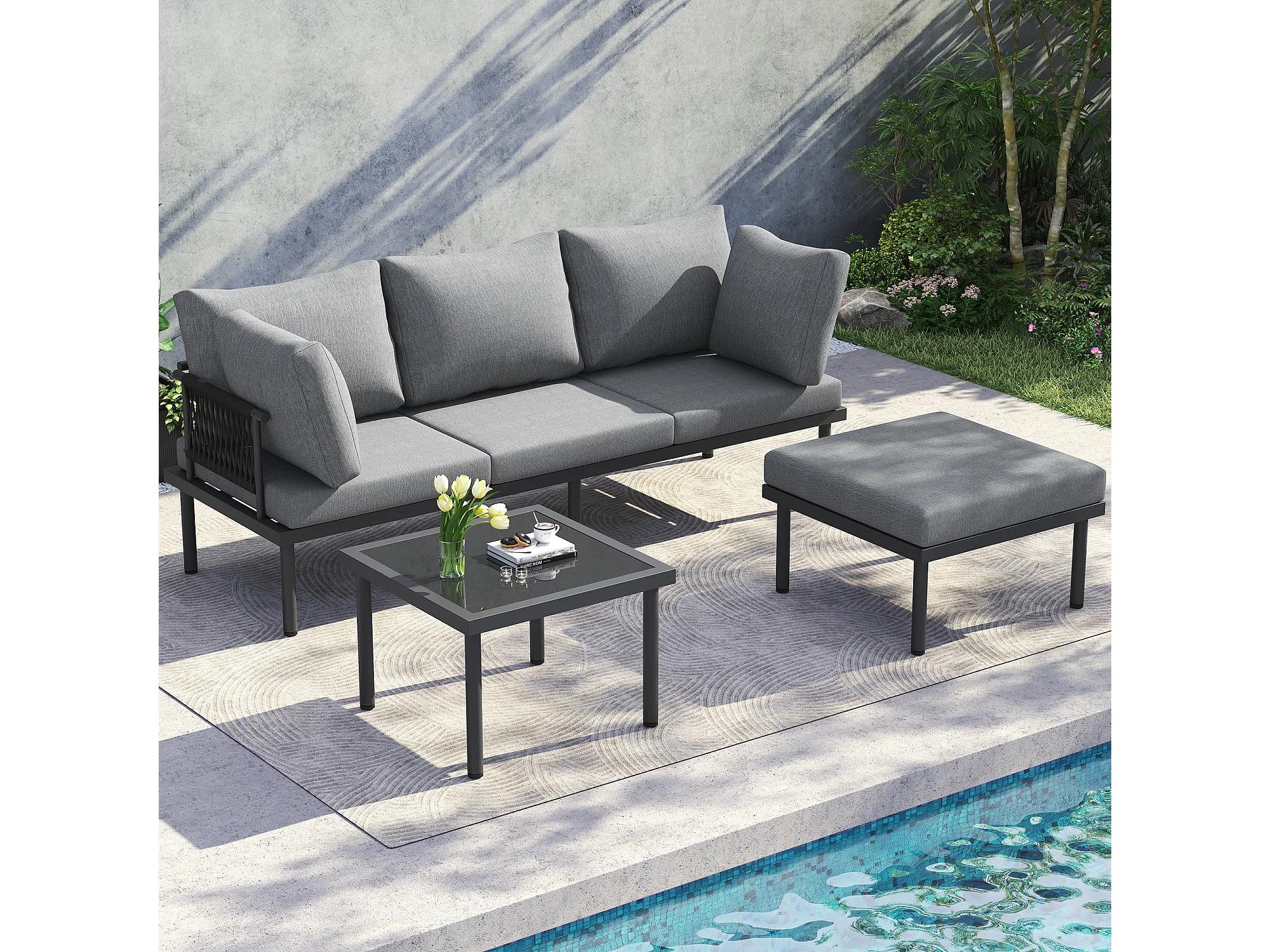 Zestaw mebli ogrodowych modułowych z litego drewna: 1 sofa 3-osobowa + 1 stołek + 1 szklany stolik kawowy - Szary