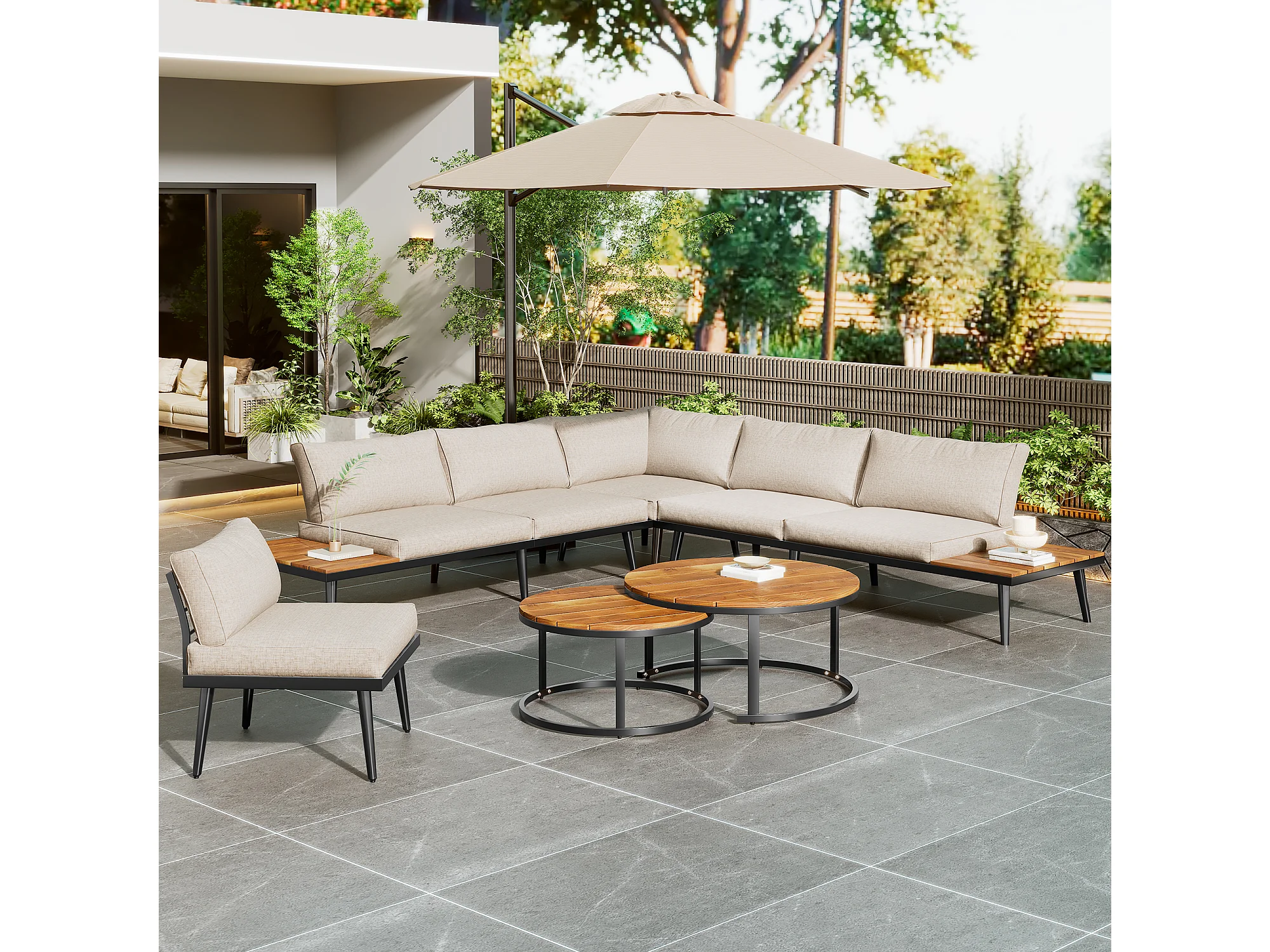 Zestaw mebli ogrodowych modułowych - z poduszkami + 2 stoliki + fotel + stołek + sofy - metalowy - beżowy