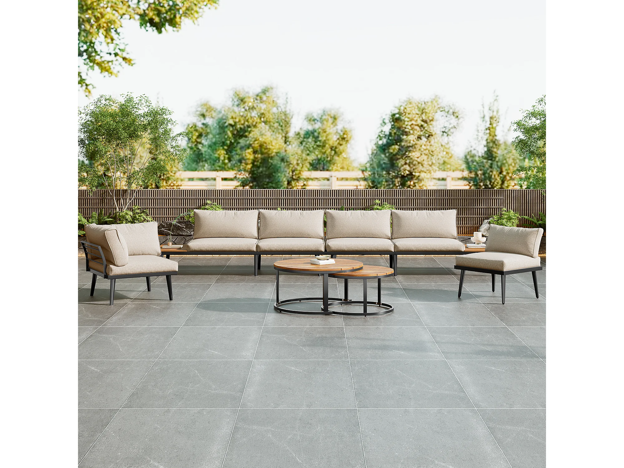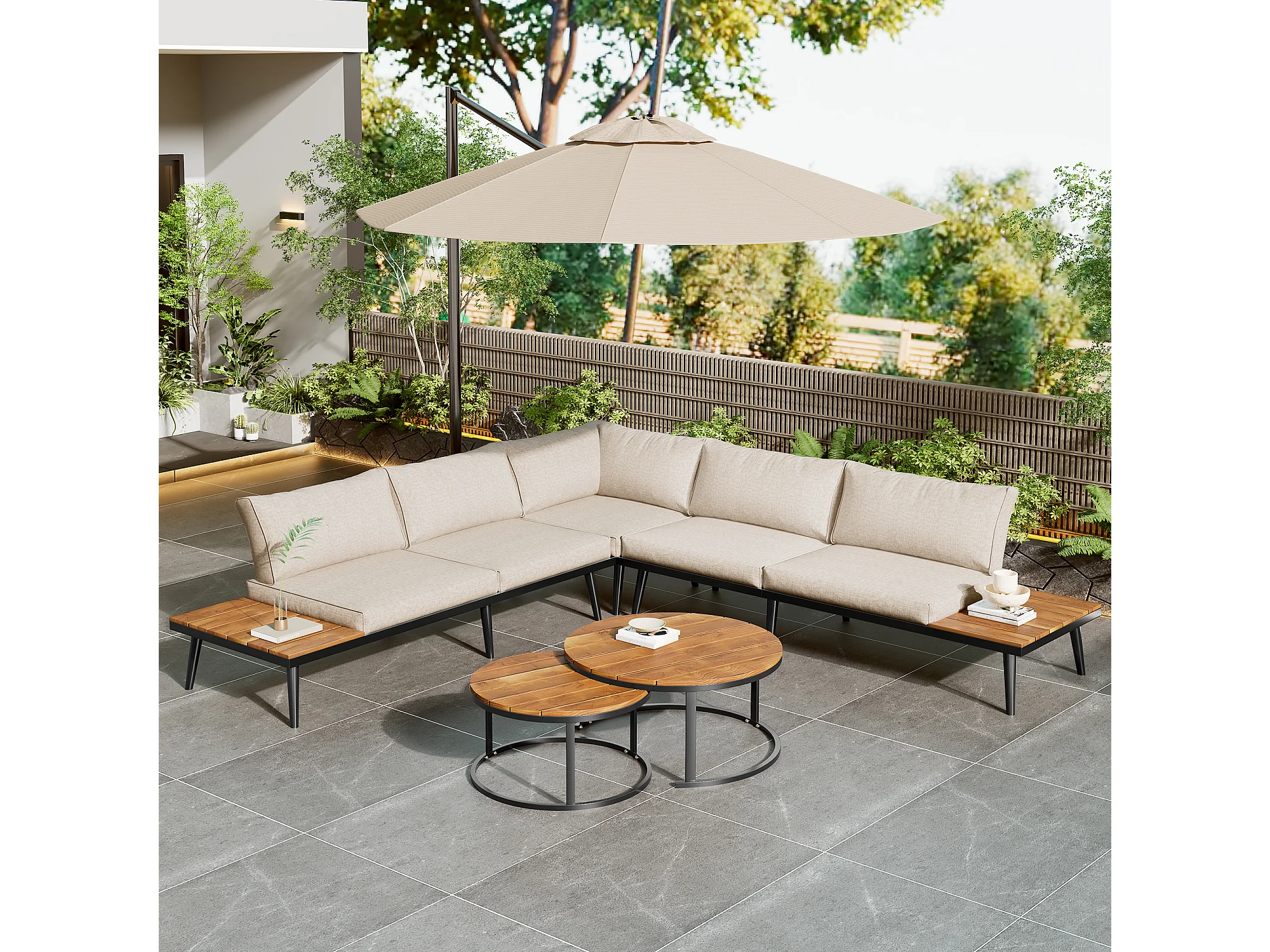 Zestaw mebli ogrodowych dla 6-7 osób - 1 stół + 1 sofa z poduszkami + 2 fotele + 1 ławka - metalowy - beżowy