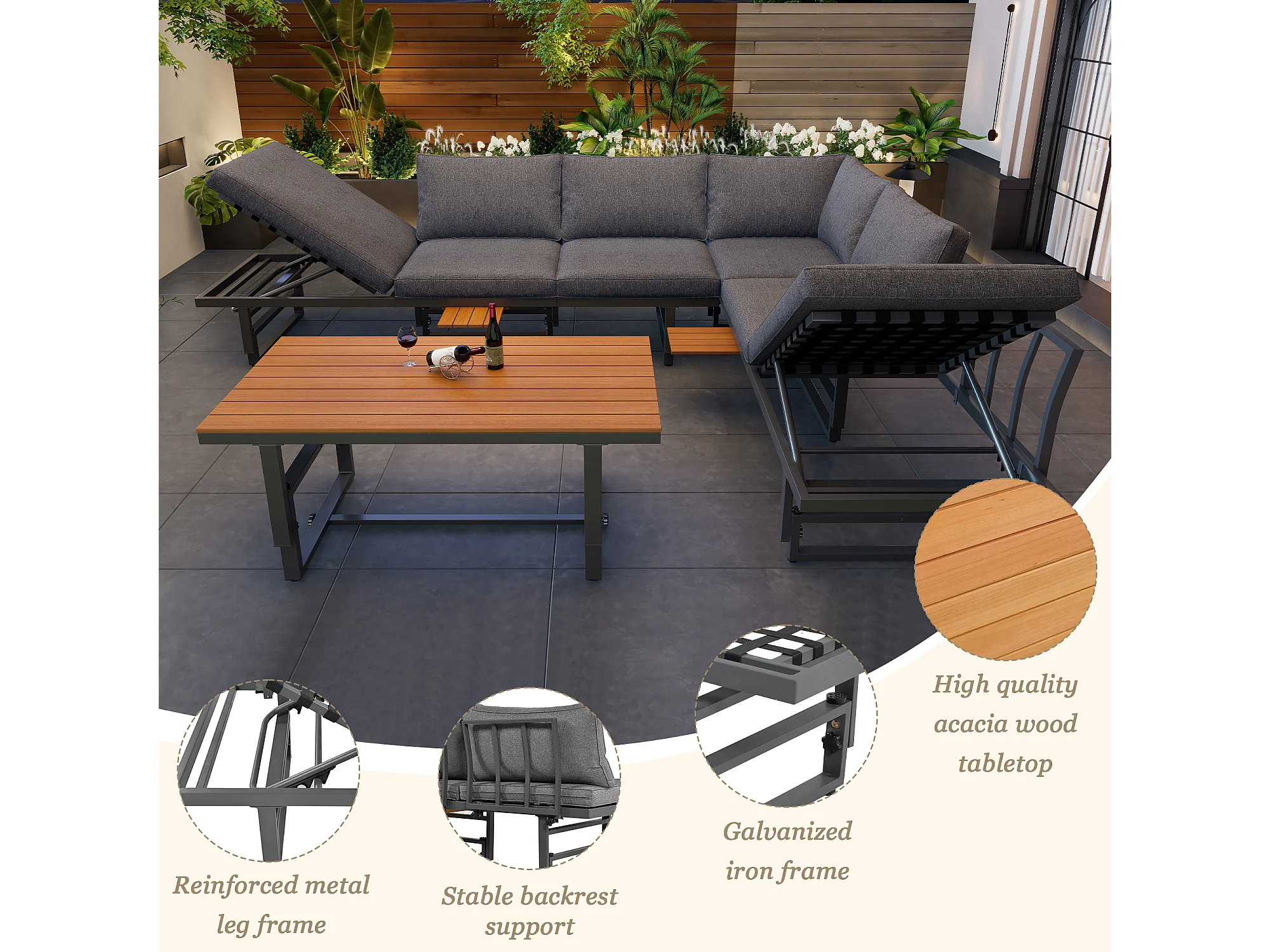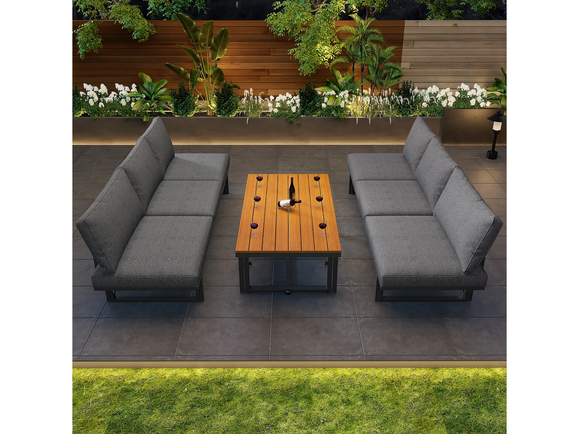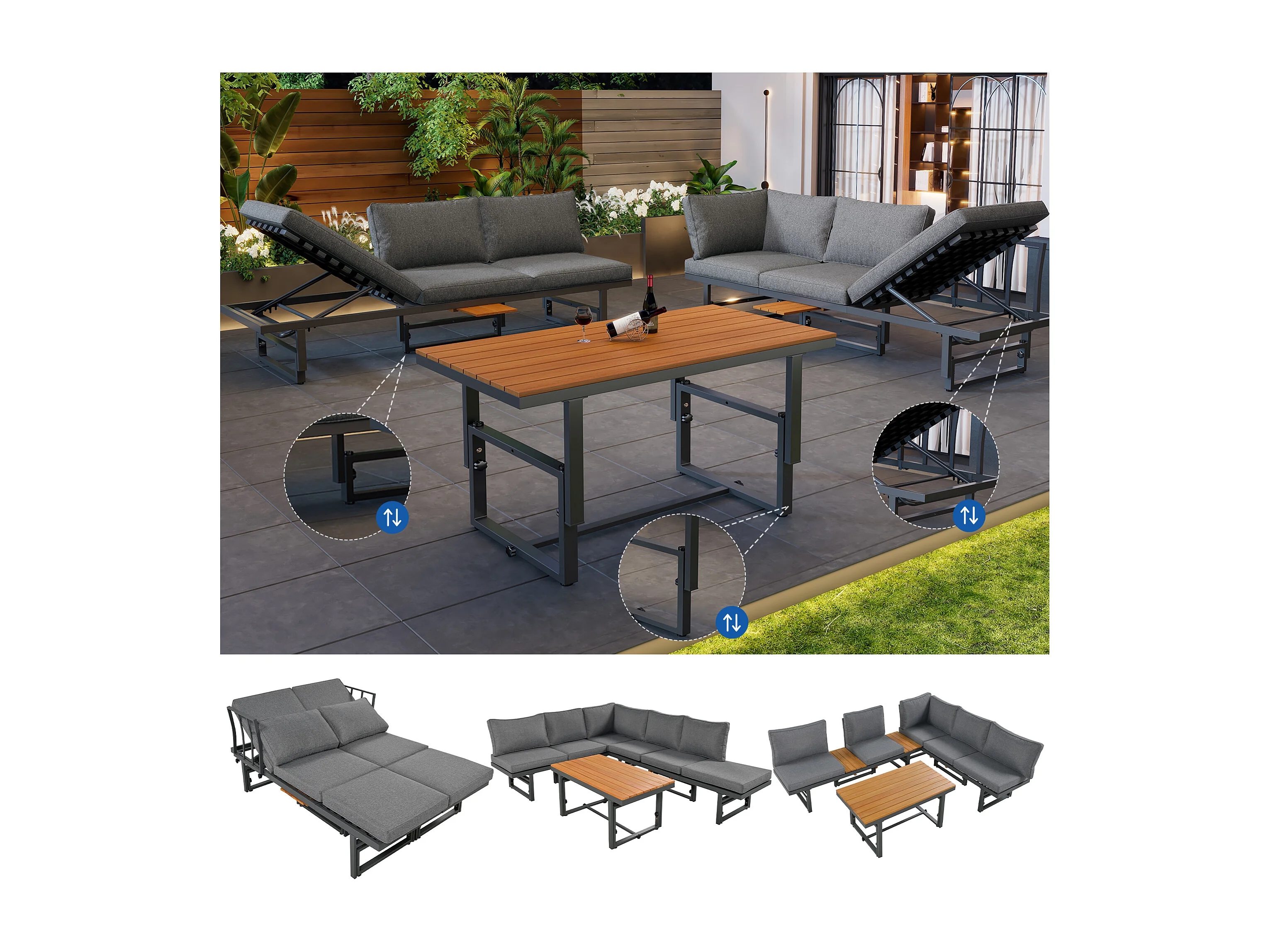 Zestaw mebli ogrodowych modułowych z ocynkowanego żelaza: 2 rozkładane sofy 3-osobowe + 1 stolik kawowy - Szary