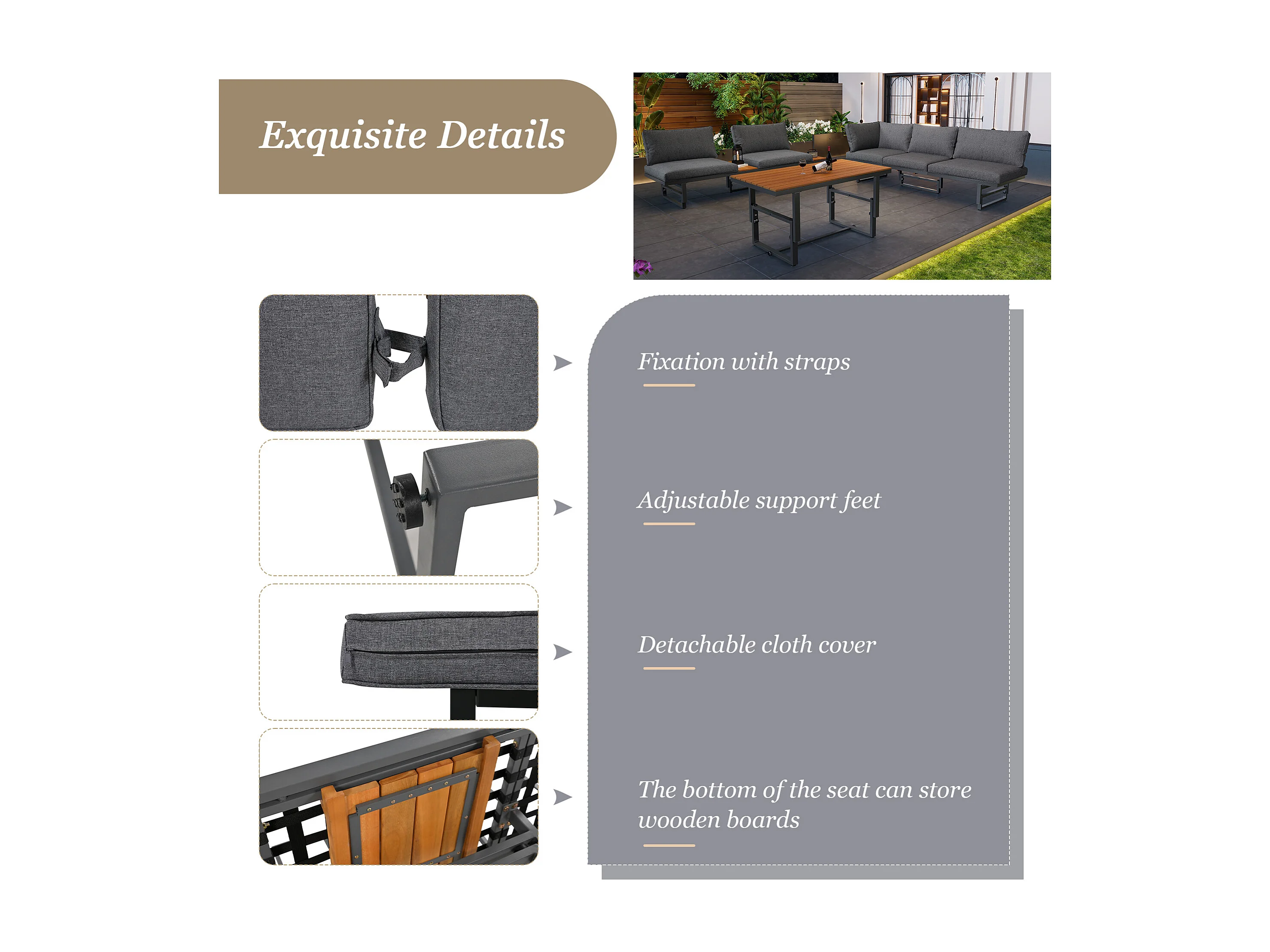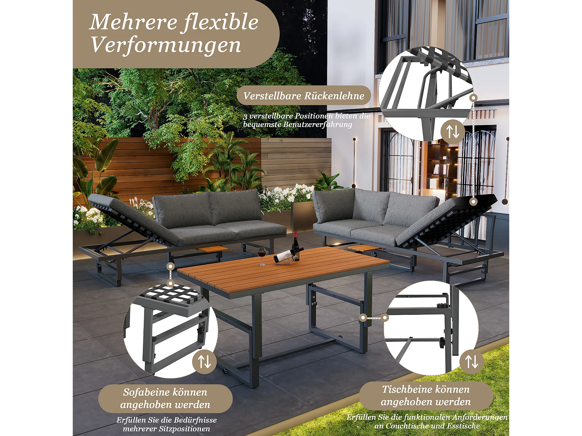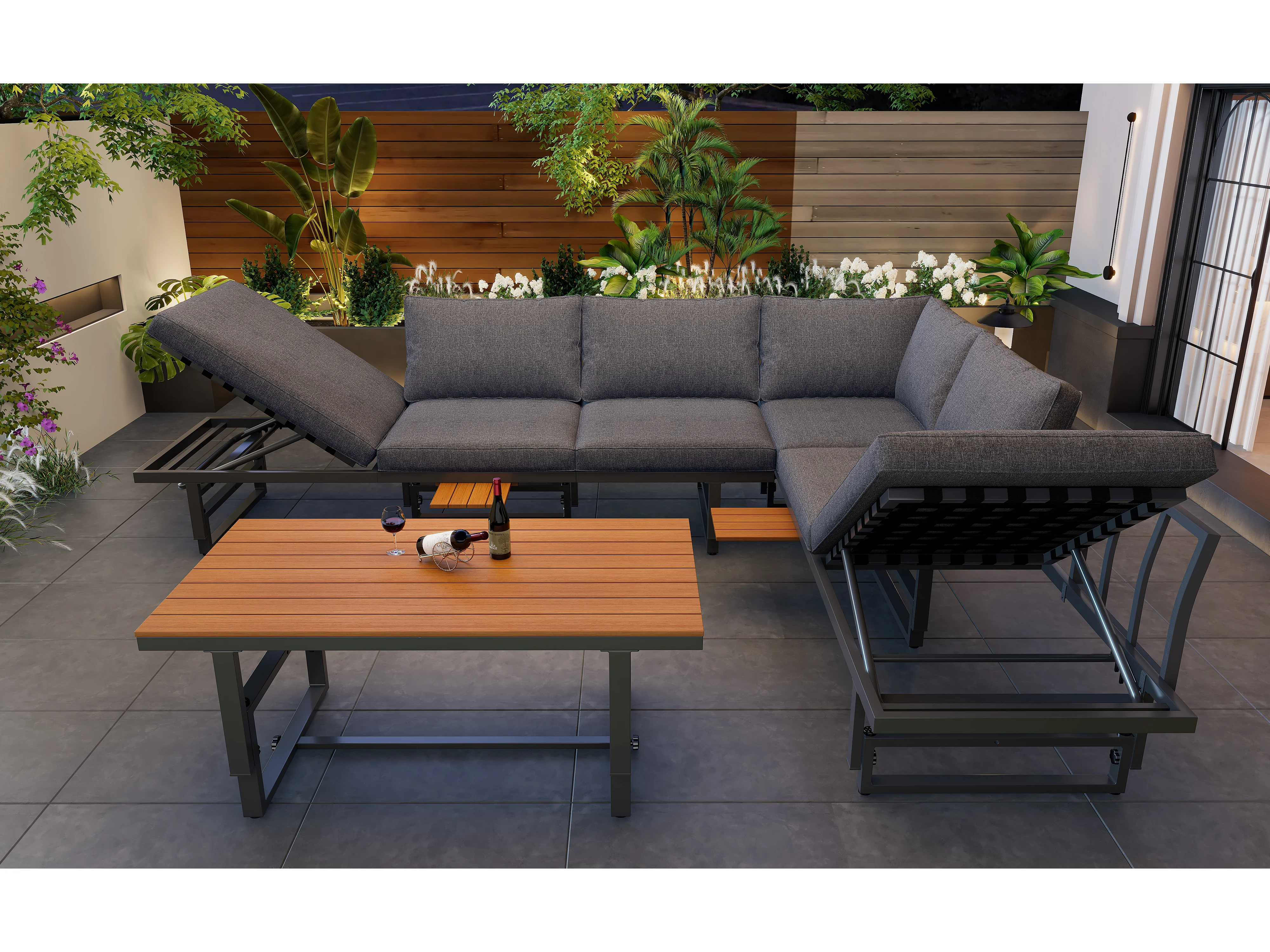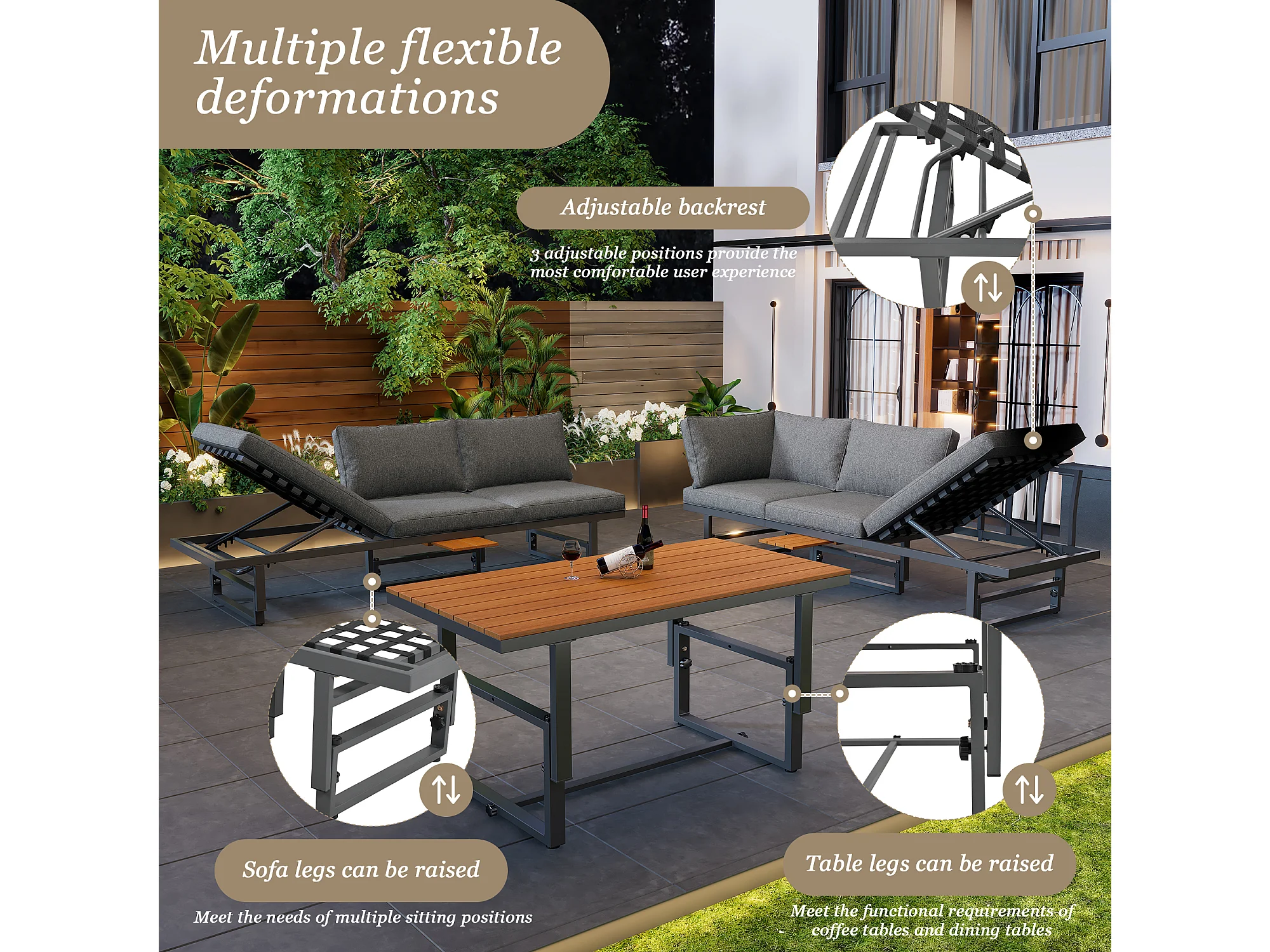 Zestaw mebli ogrodowych modułowych z ocynkowanego żelaza: 2 rozkładane sofy 3-osobowe + 1 stolik kawowy - Szary