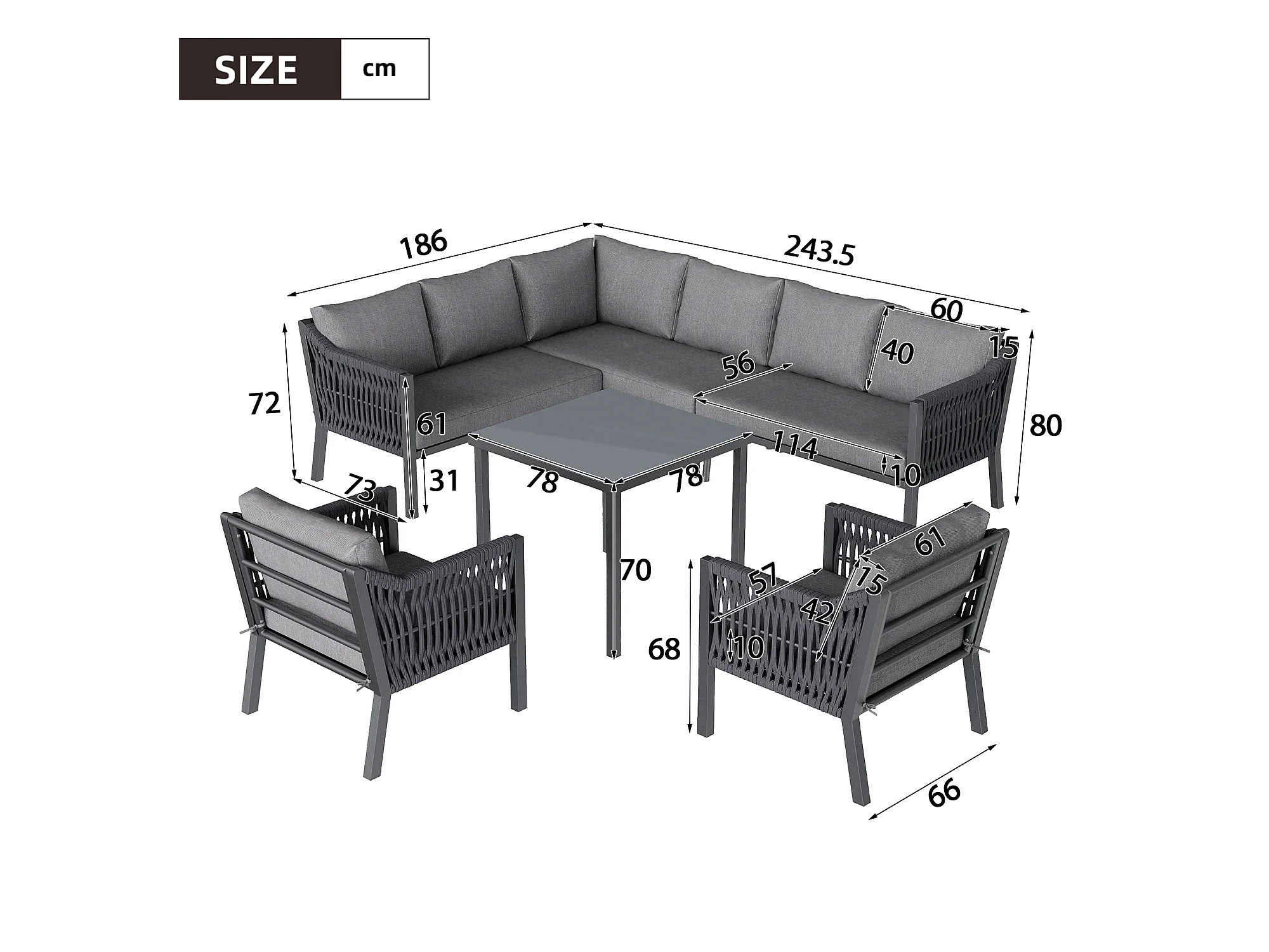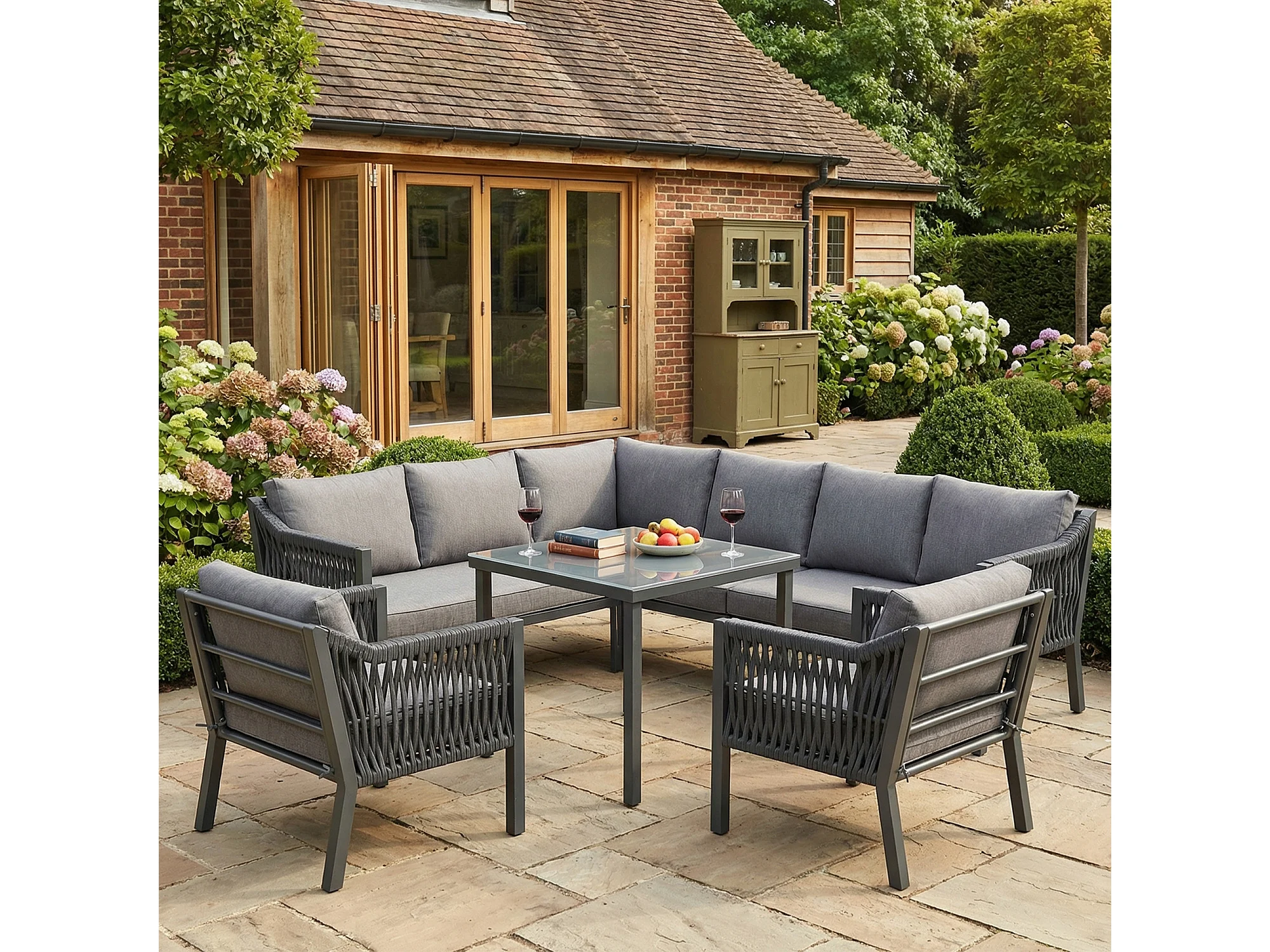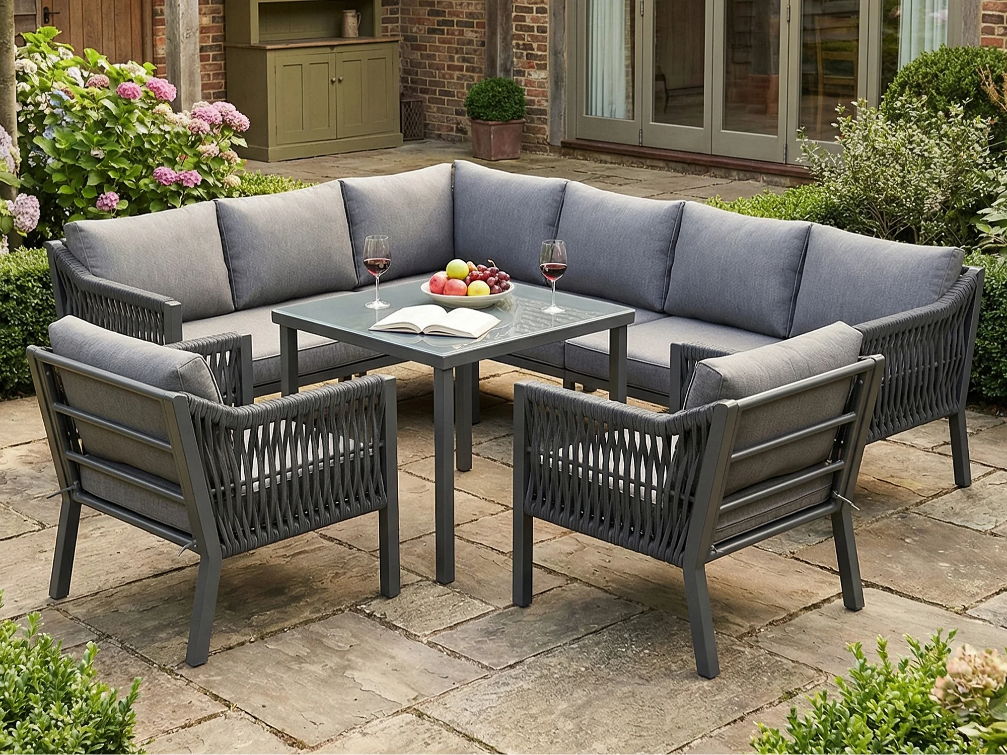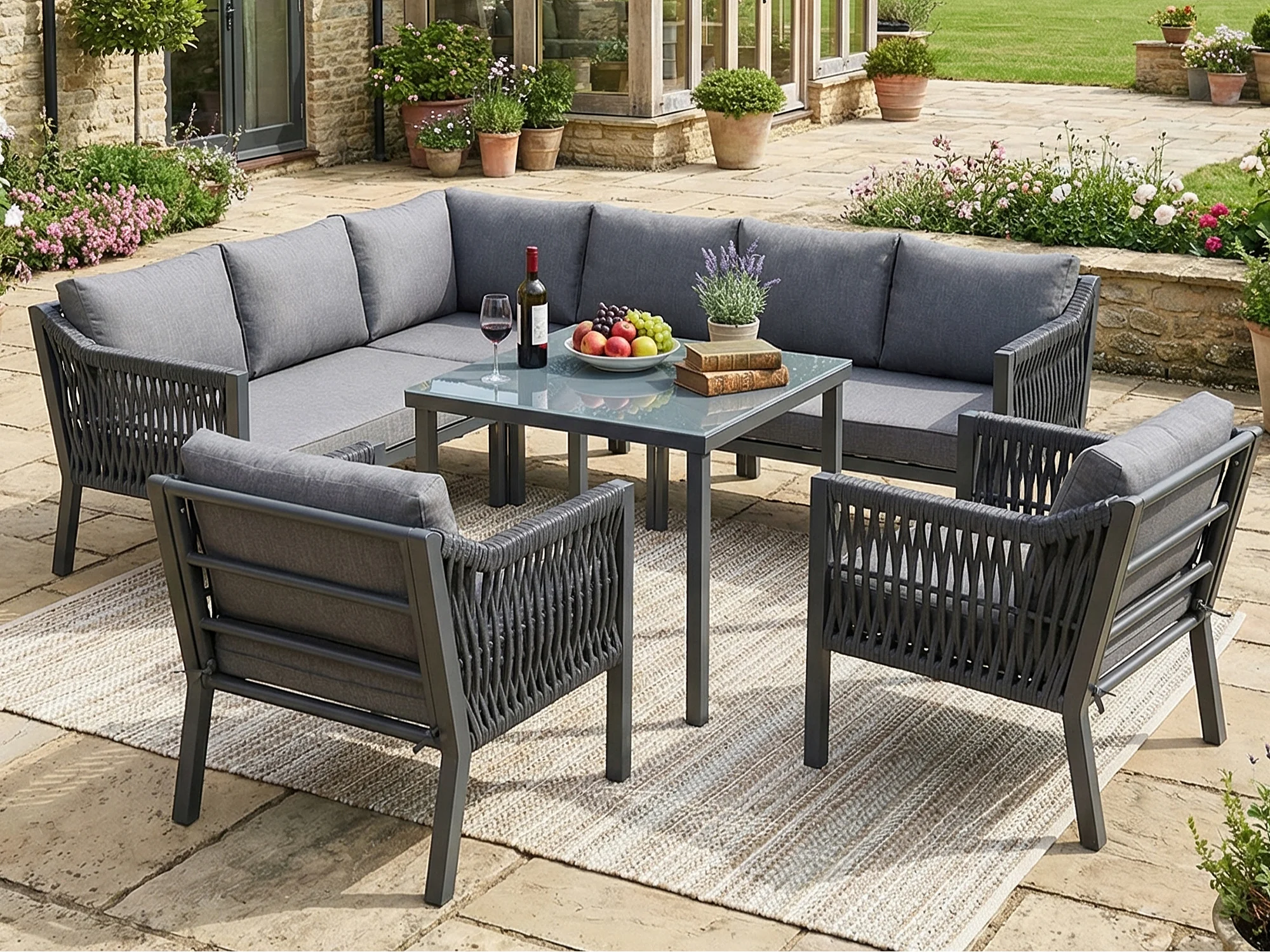 Zestaw mebli ogrodowych na 8 osób, w skład którego wchodzi 1 stół jadalny, 2 fotele i 1 narożnik - Stal ocynkowana - Szara