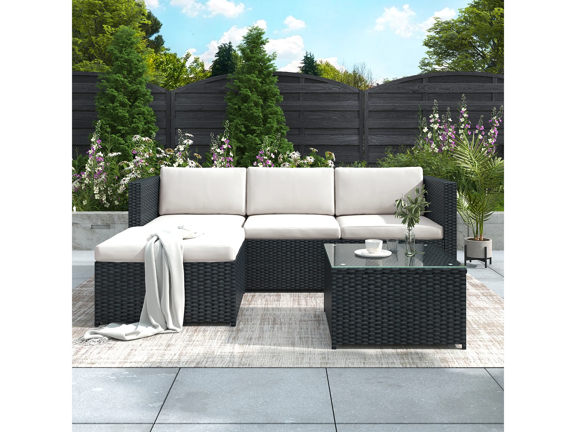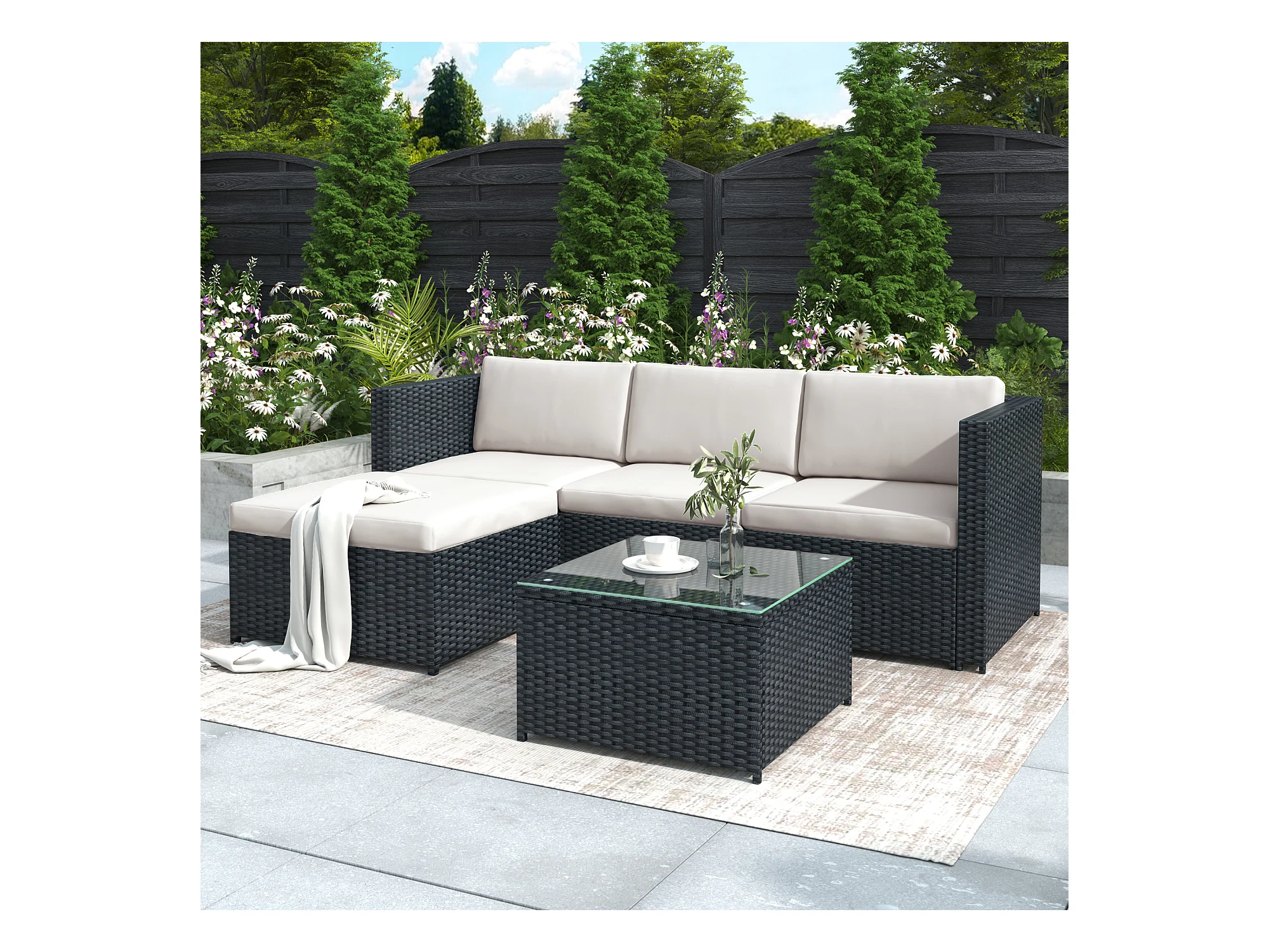 Zestaw mebli ogrodowych narożnych z wikliny żywicy 4-osobowy ze stolikiem kawowym - szklany blat - czarny