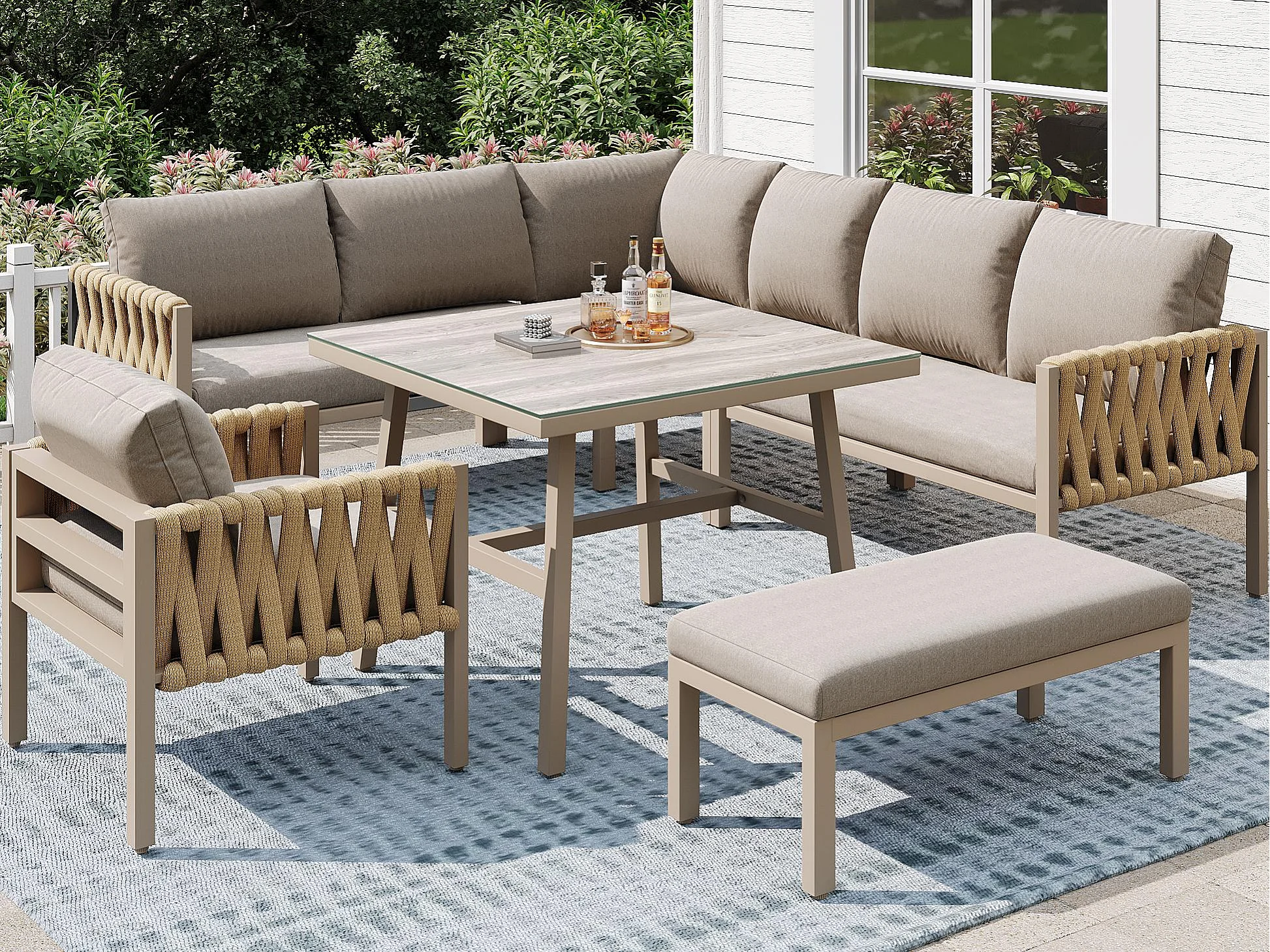 Zestaw ogrodowy, meble rattanowe dla 6-7 osób, narożna kanapa - ze stali ocynkowanej, regulowane nóżki, Beżowy