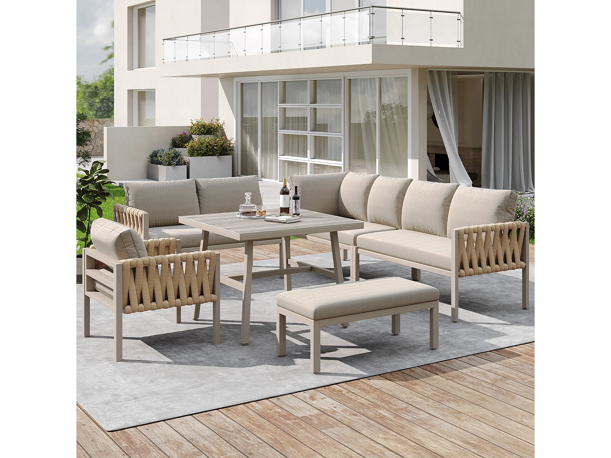 Zestaw mebli ogrodowych dla 6-7 osób, narożna sofa - z galwanizowanej stali, regulowane nogi, 2 stoliki nocne, beżowy
