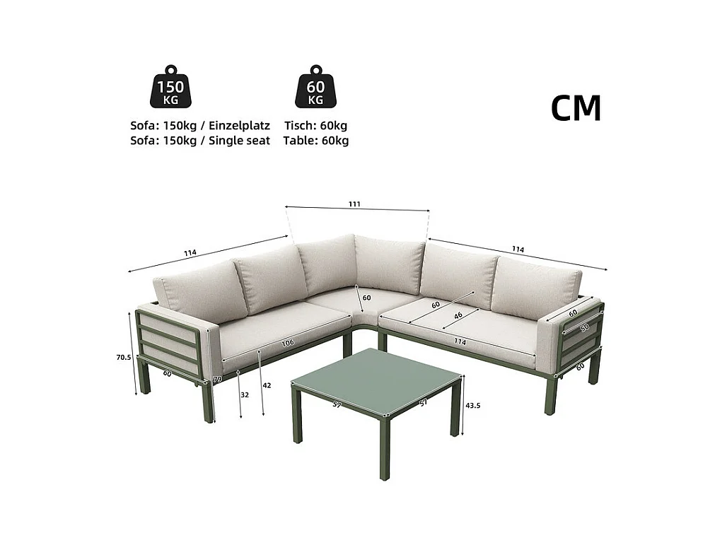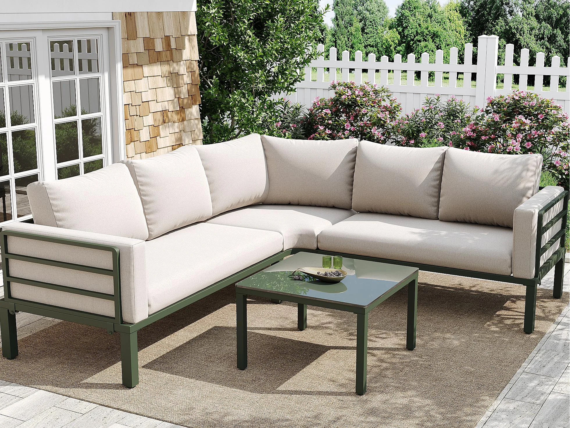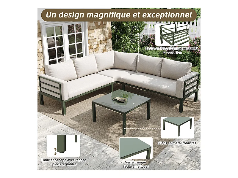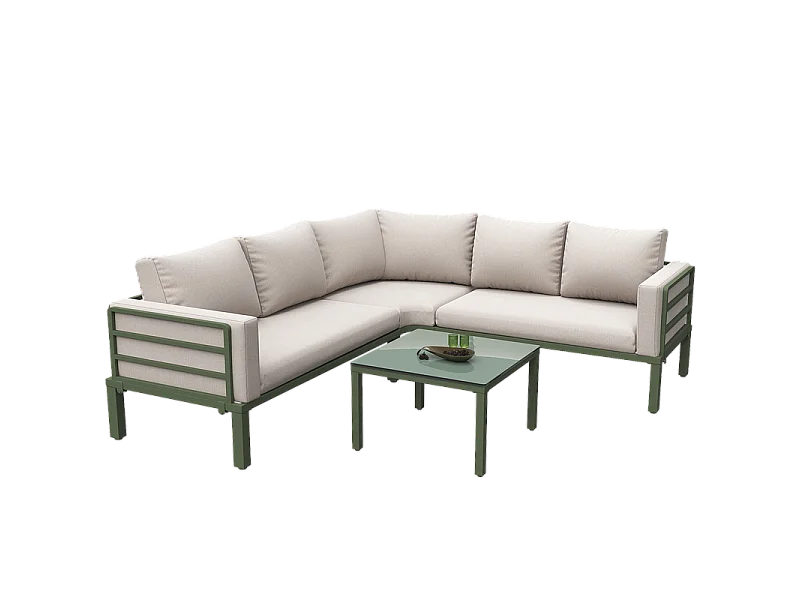 Zestaw mebli ogrodowych z ocynkowanej stali na 4 osoby - 2 sofy, 1 stół kawowy ze szkła hartowanego - z poduszkami - beżowy