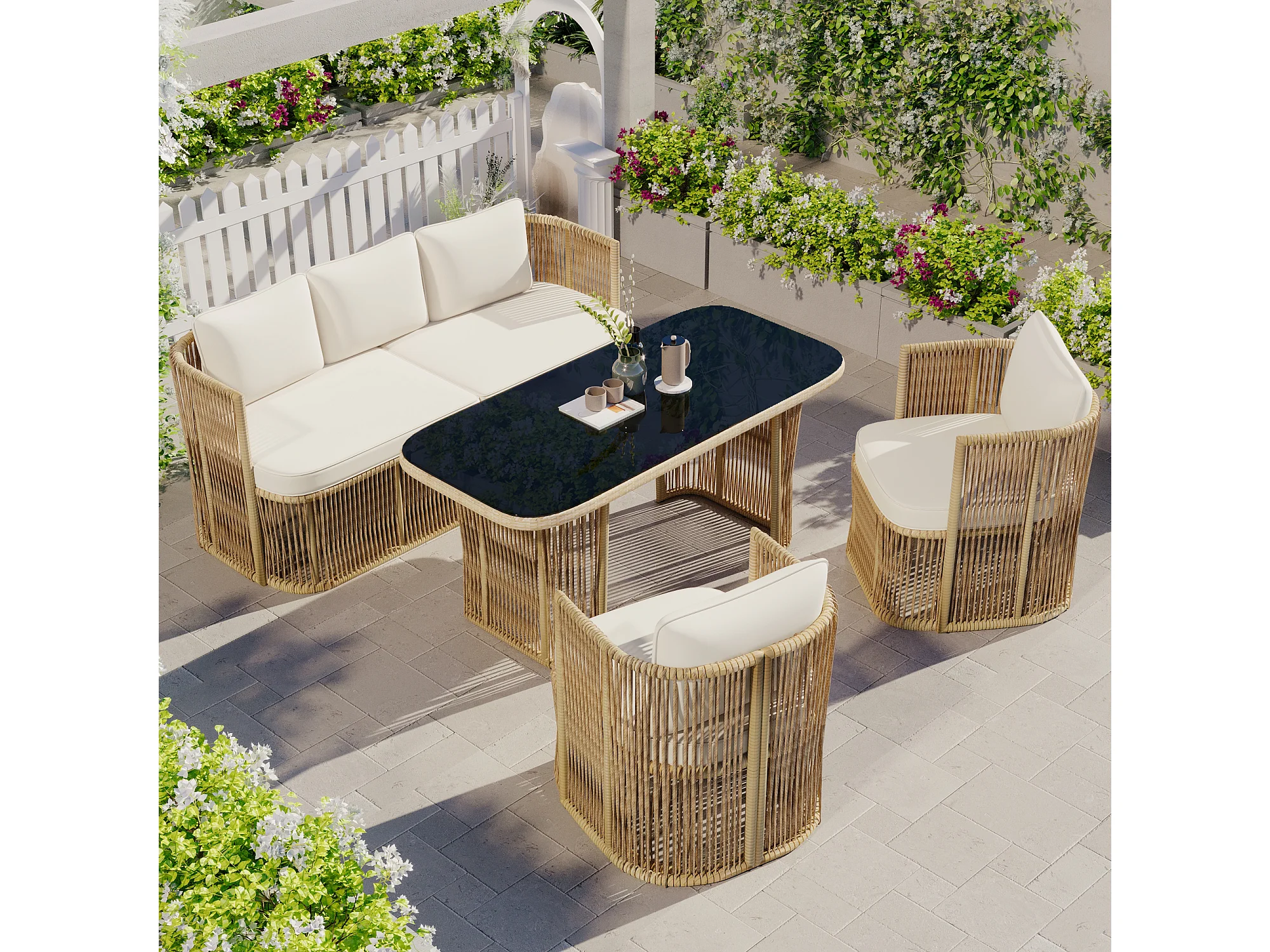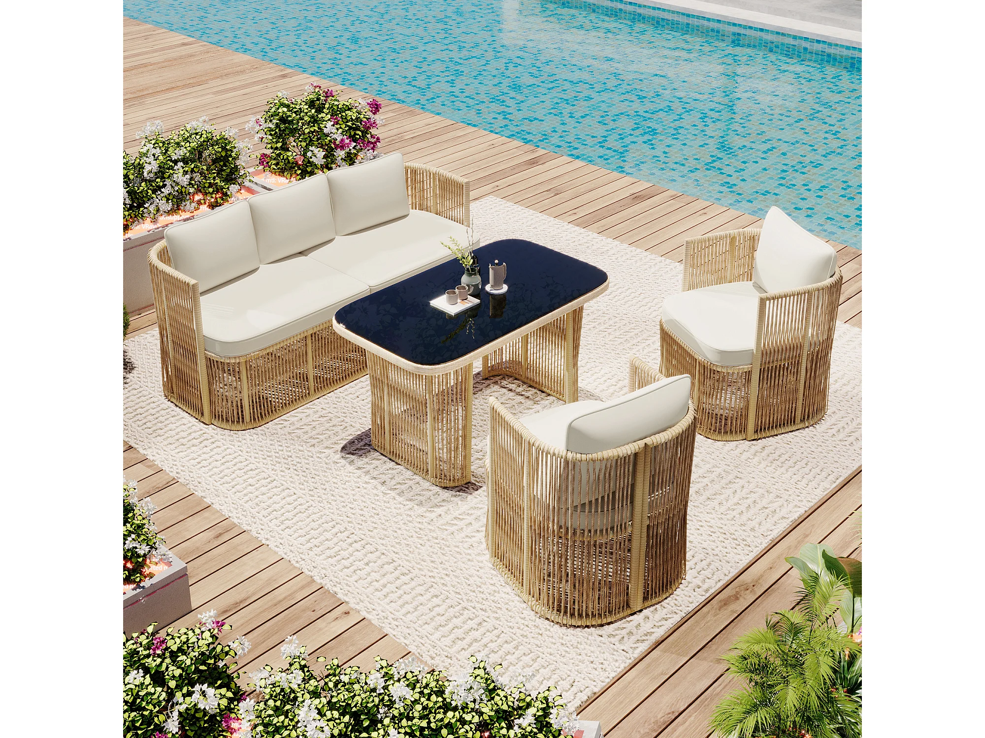 Zestaw mebli ogrodowych z rattanu PE, 5 elementów - z sofą 3-osobową + 2 fotelami + szklanym stolikiem + poduszkami - metalowy - beżowy