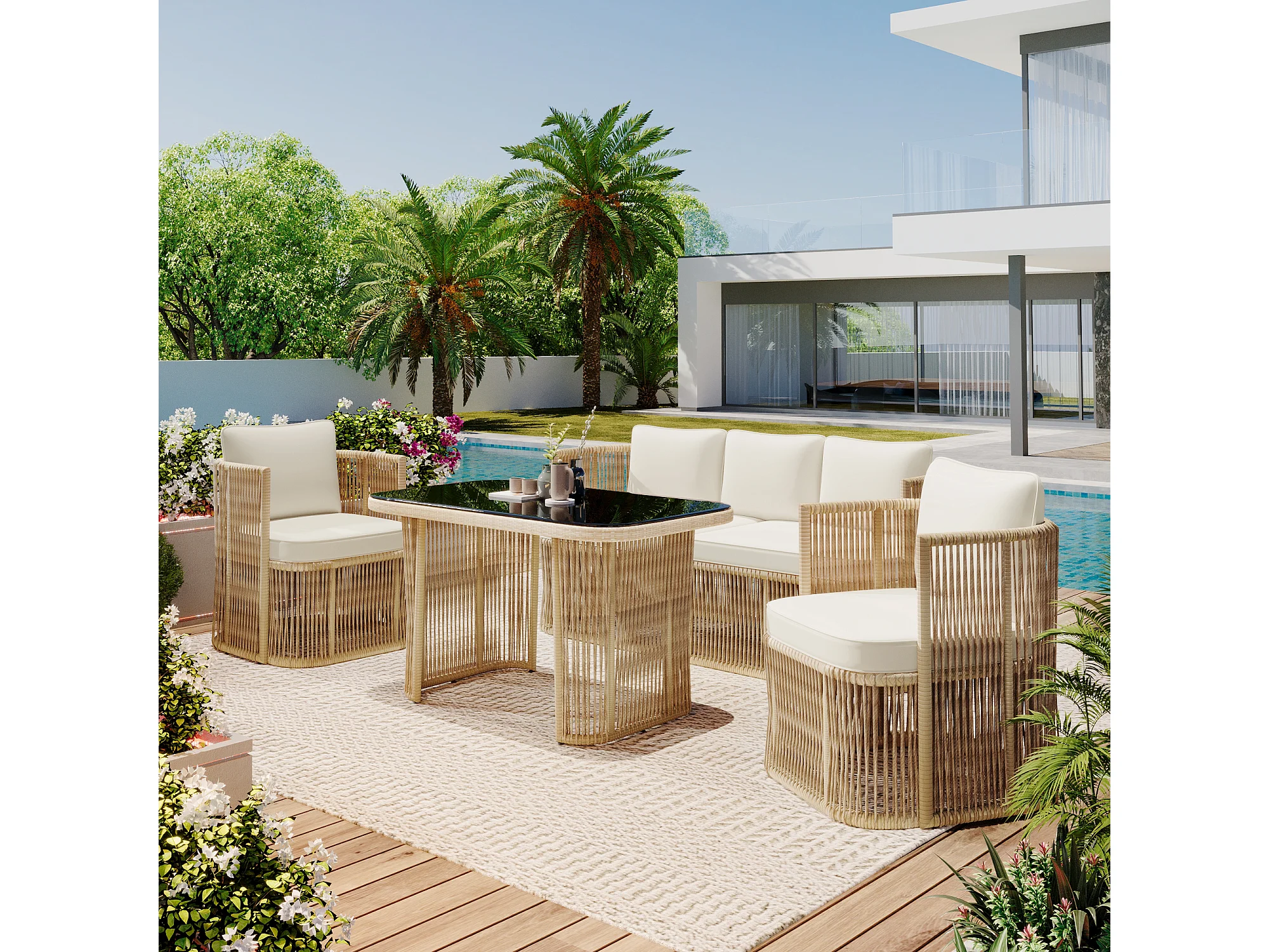 Nowoczesny zestaw mebli ogrodowych - rama żelazna - podłokietniki tkane - z poduszkami na siedziska + stół + 6 krzeseł - beżowy